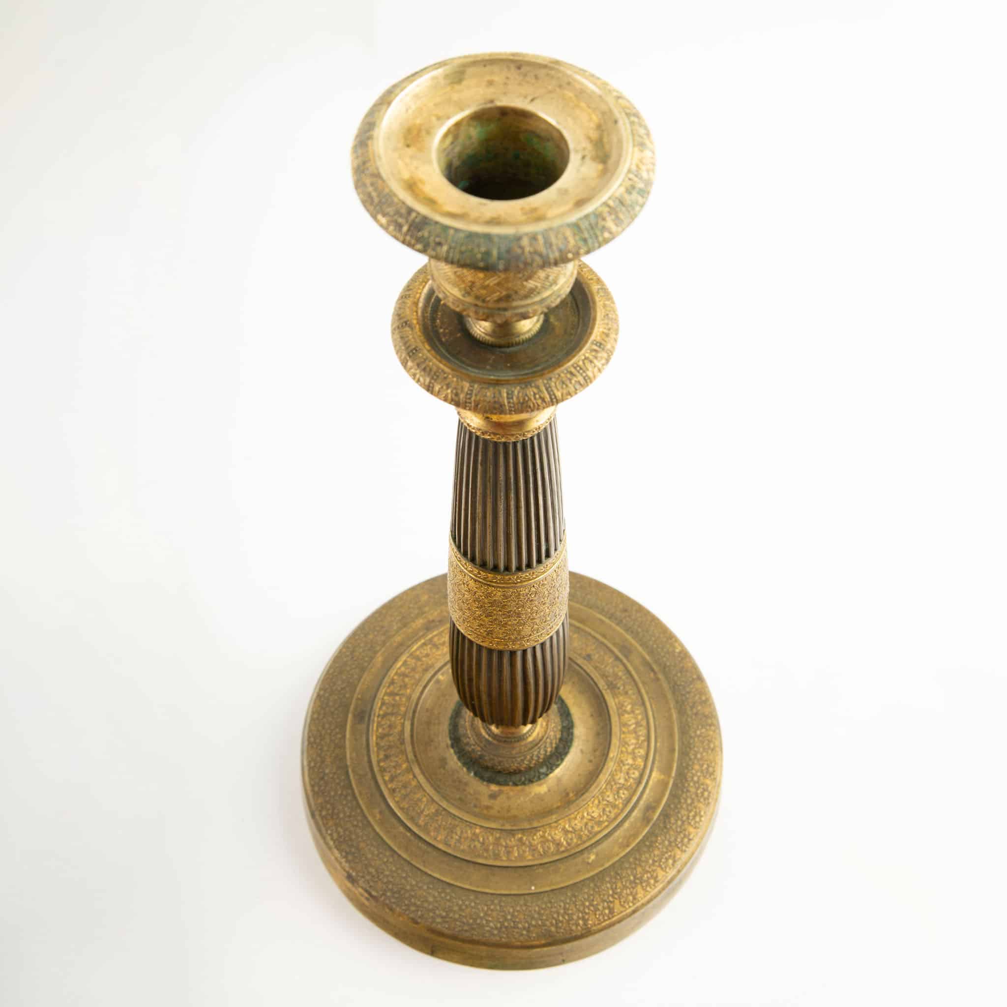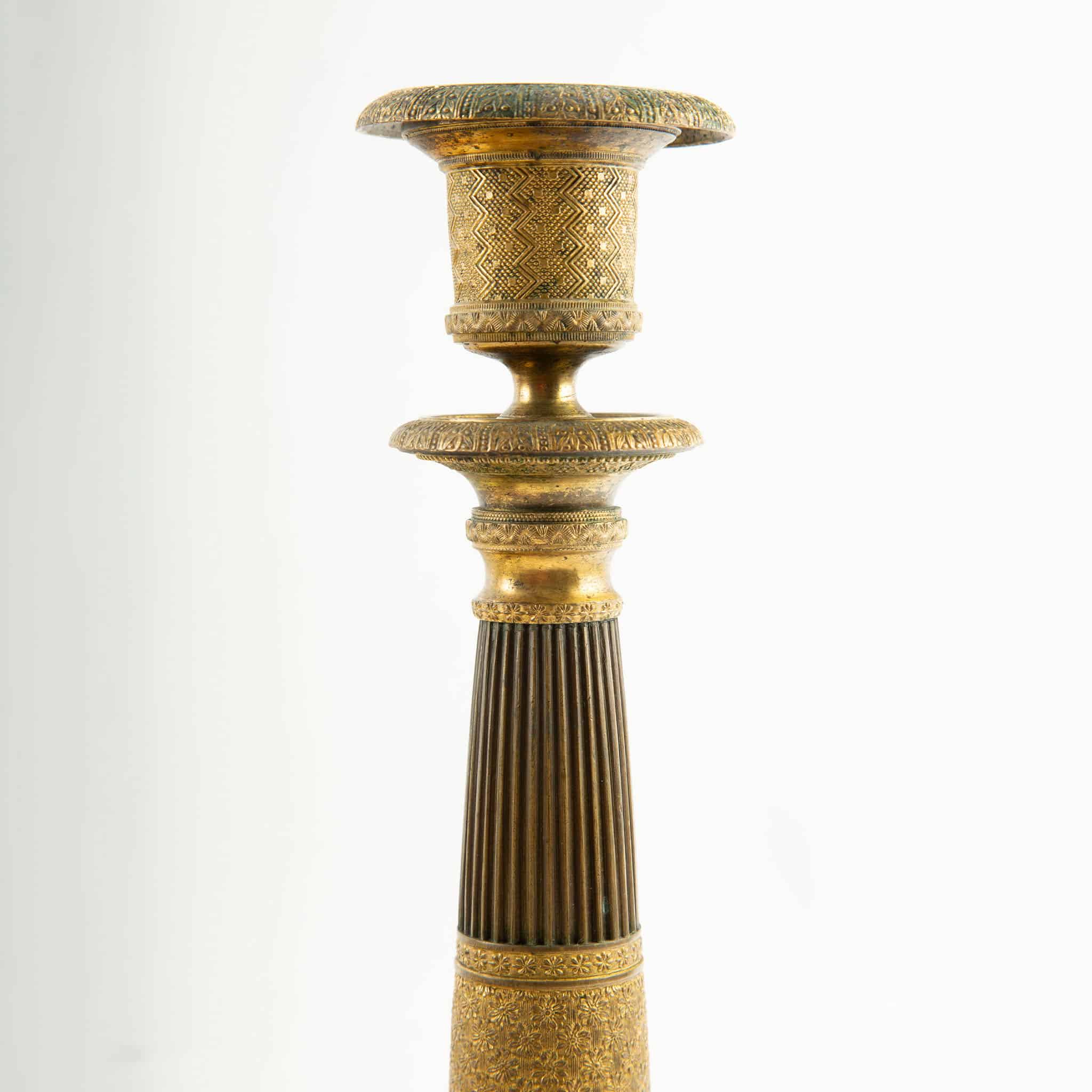 Pair of 19th-Century French Chased Gilt Bronze Candlesticks, France, Restoration period (circa 1815–1830). Each candlestick is formed with a tall, fluted shaft inspired by classical columnar models, enriched with finely chased bronze decoration and centered by a wide ornamental collar worked with dense floral and geometric punchwork. The stepped drip pans are fitted with original bobèches, above cylindrical candle cups decorated with repeating guilloché and zigzag motifs. The broad circular bases are concentrically molded and finely textured, providing both visual weight and stability.