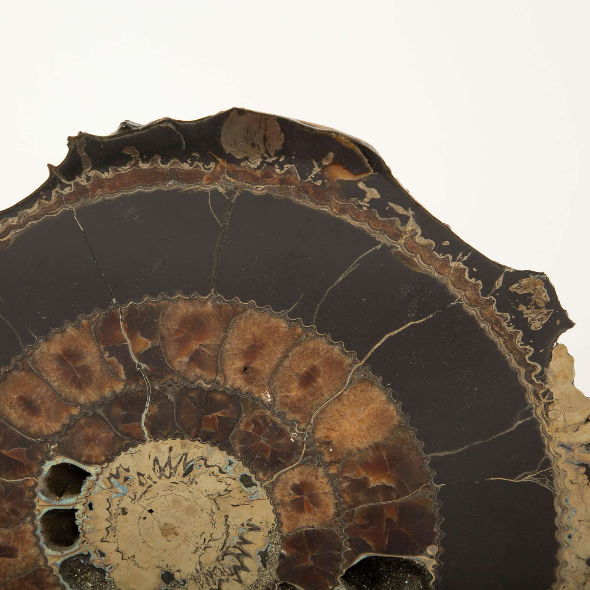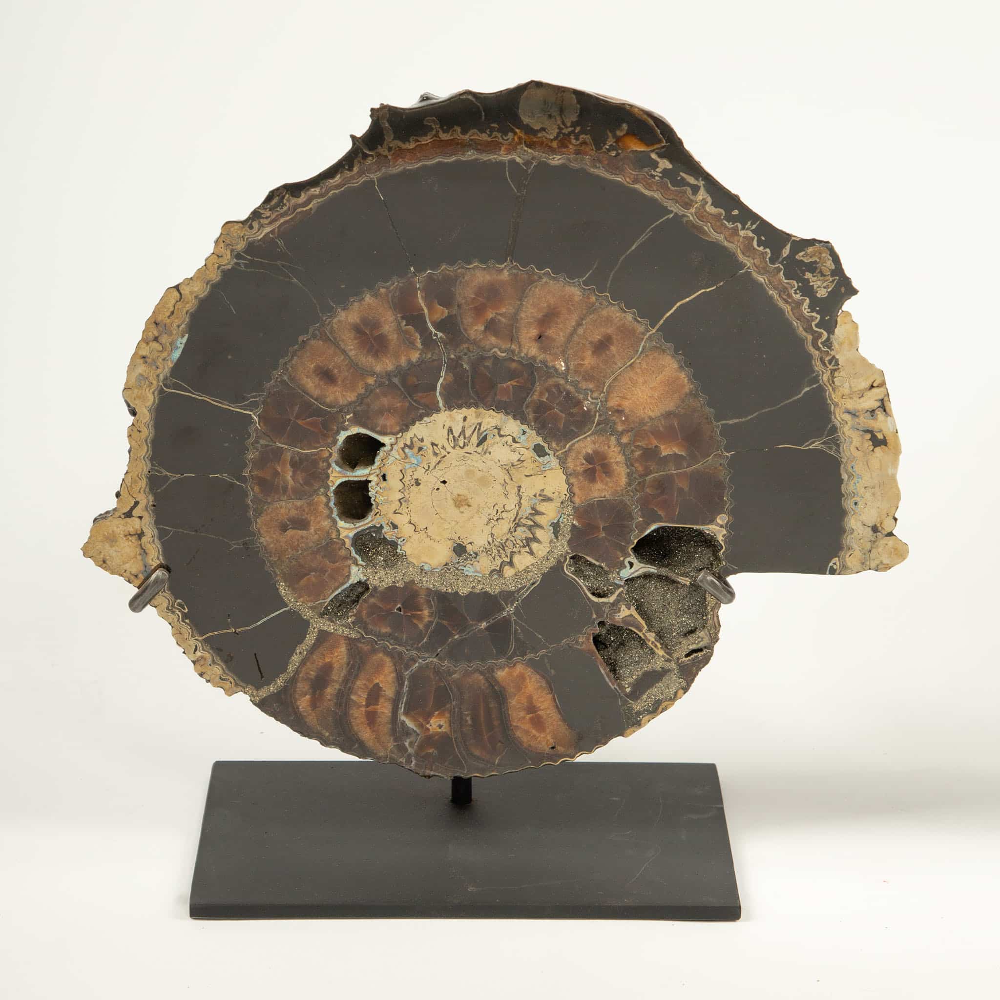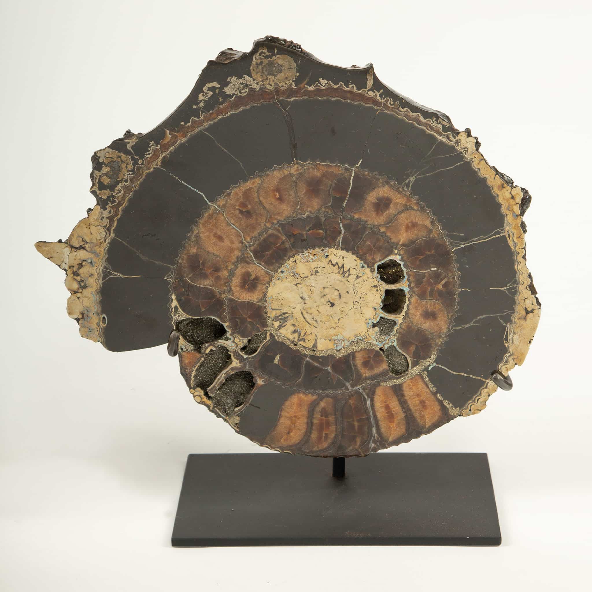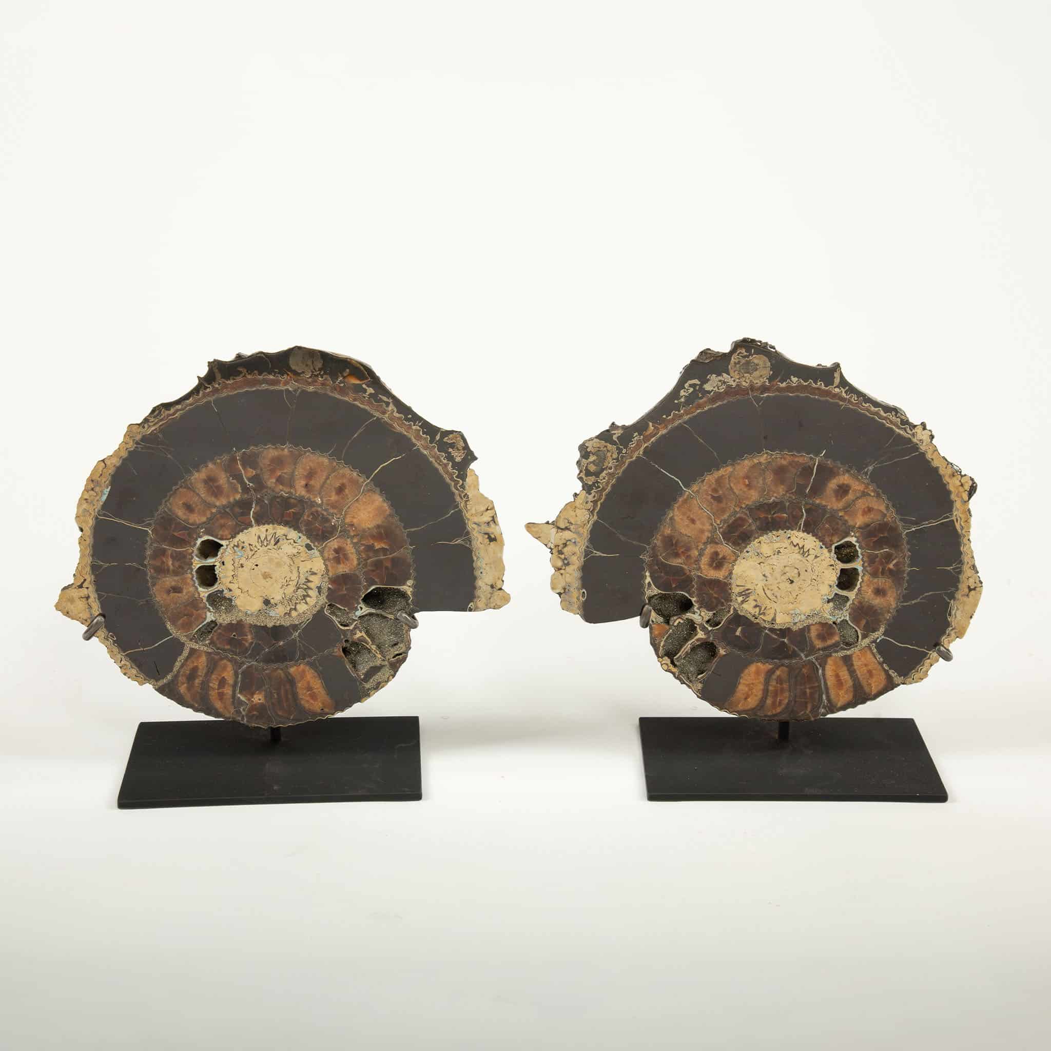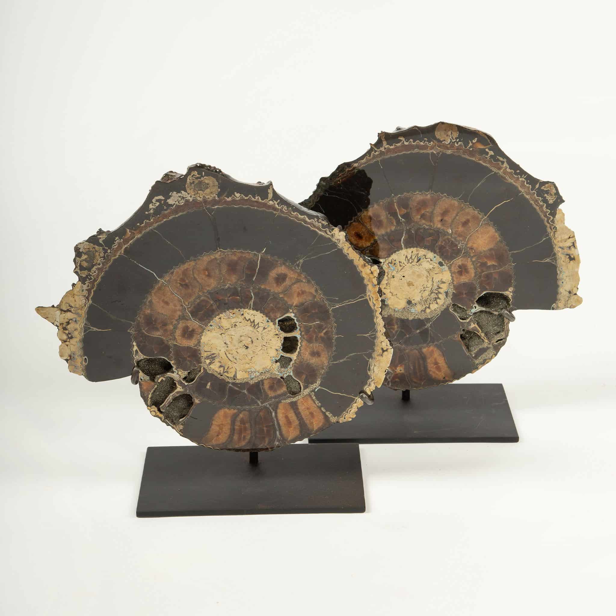 A striking pair of fossilized ammonites, each cut and polished to reveal the intricate internal chambers and mounted on custom black metal stands. Measuring approximately 12 inches in diameter, these specimens are remarkable for their pyritization, in which the original shell material has been replaced by iron pyrite over millions of years, lending them a subtle metallic luster that enhances their natural beauty. Their surfaces display rich tones of gold, brown, and cream, with beautifully defined spiral forms that exemplify the enduring geometry of these extinct marine mollusks. Ammonites thrived in the world’s oceans during the Mesozoic Era, between roughly 240 and 65 million years ago, and are prized today both as decorative objects and as significant artifacts of natural history. Presented as a complementary pair, they possess strong sculptural presence, making them ideal for display in both contemporary and classical interiors.