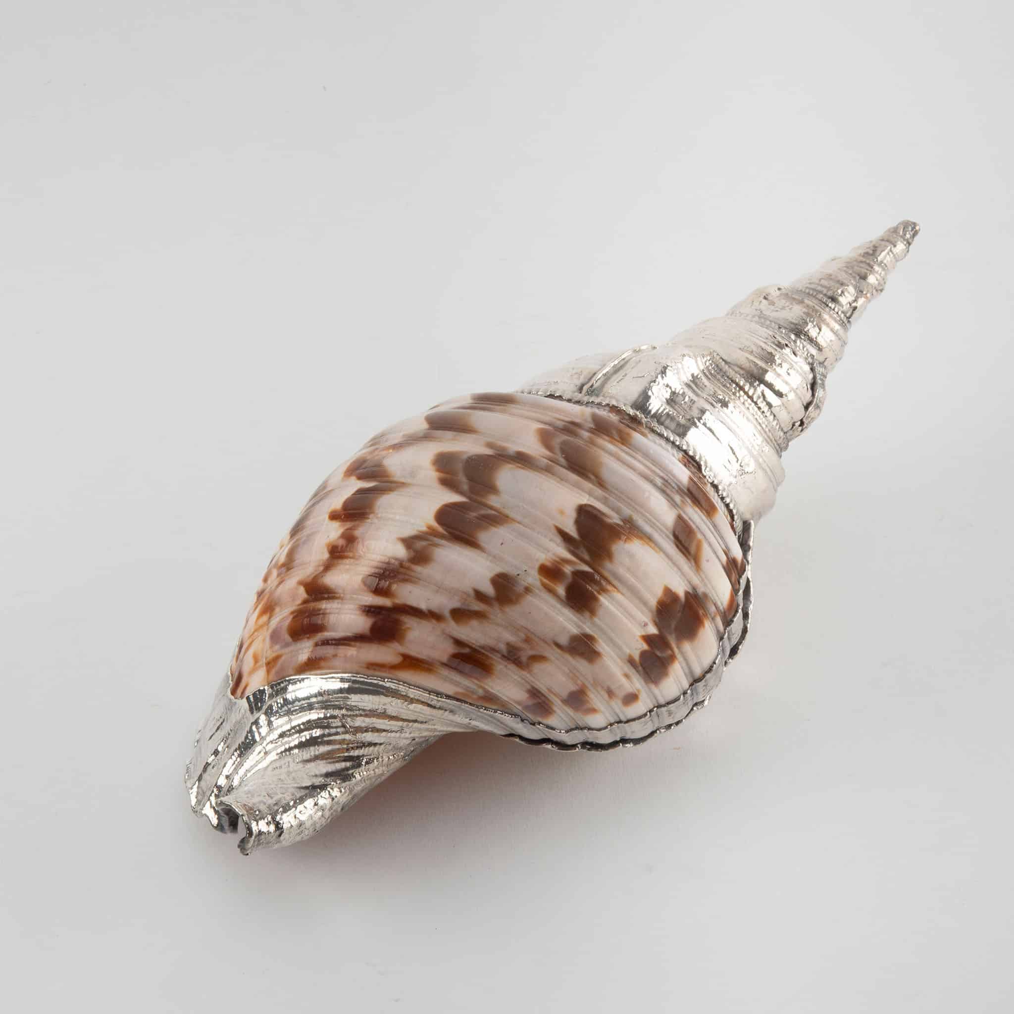 Made from natural shell. Each shell is unique. Creel and Gow has been working with the same atelier in Rome, Italy for over 20 years to make our signature silvered shells. Our workshop has been operated by the same family for generations.  For decades, this family has also done restoration work on silver pieces for the Vatican.