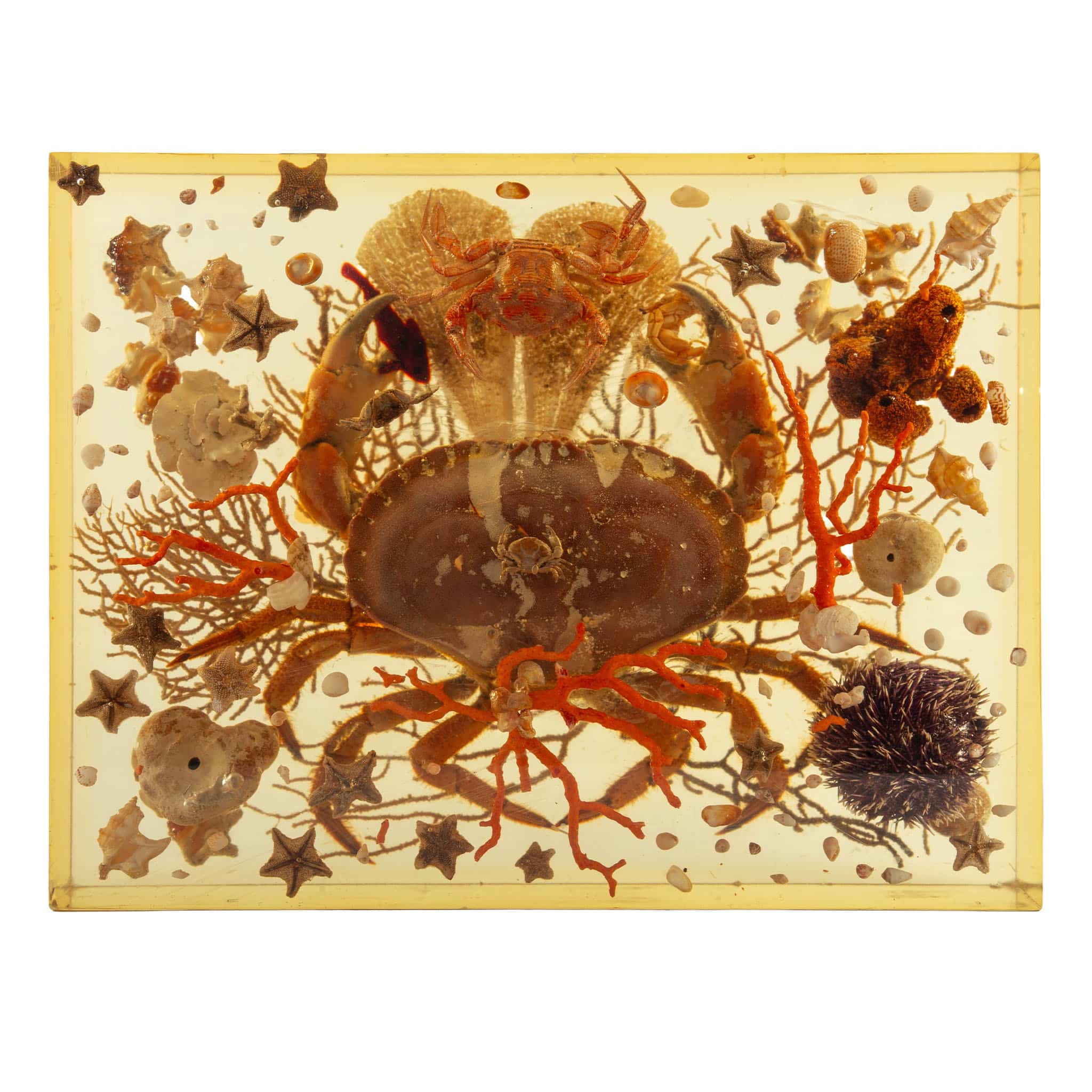 At the center, a crab dominates the composition, surrounded by branching coral, shells, echinoderms, and smaller crustaceans, arranged symmetrically yet organically. The clarity of the lucite allows for full visibility from multiple angles, transforming the piece into both a sculptural object and a natural history display. Light refracts through the resin, enhancing the textures and colors of the encapsulated specimens and lending the work a jewel-like quality.