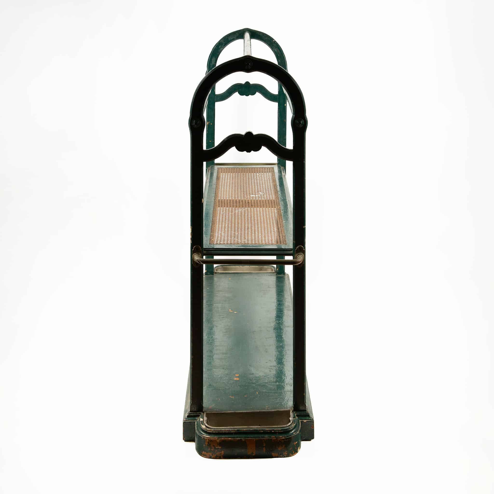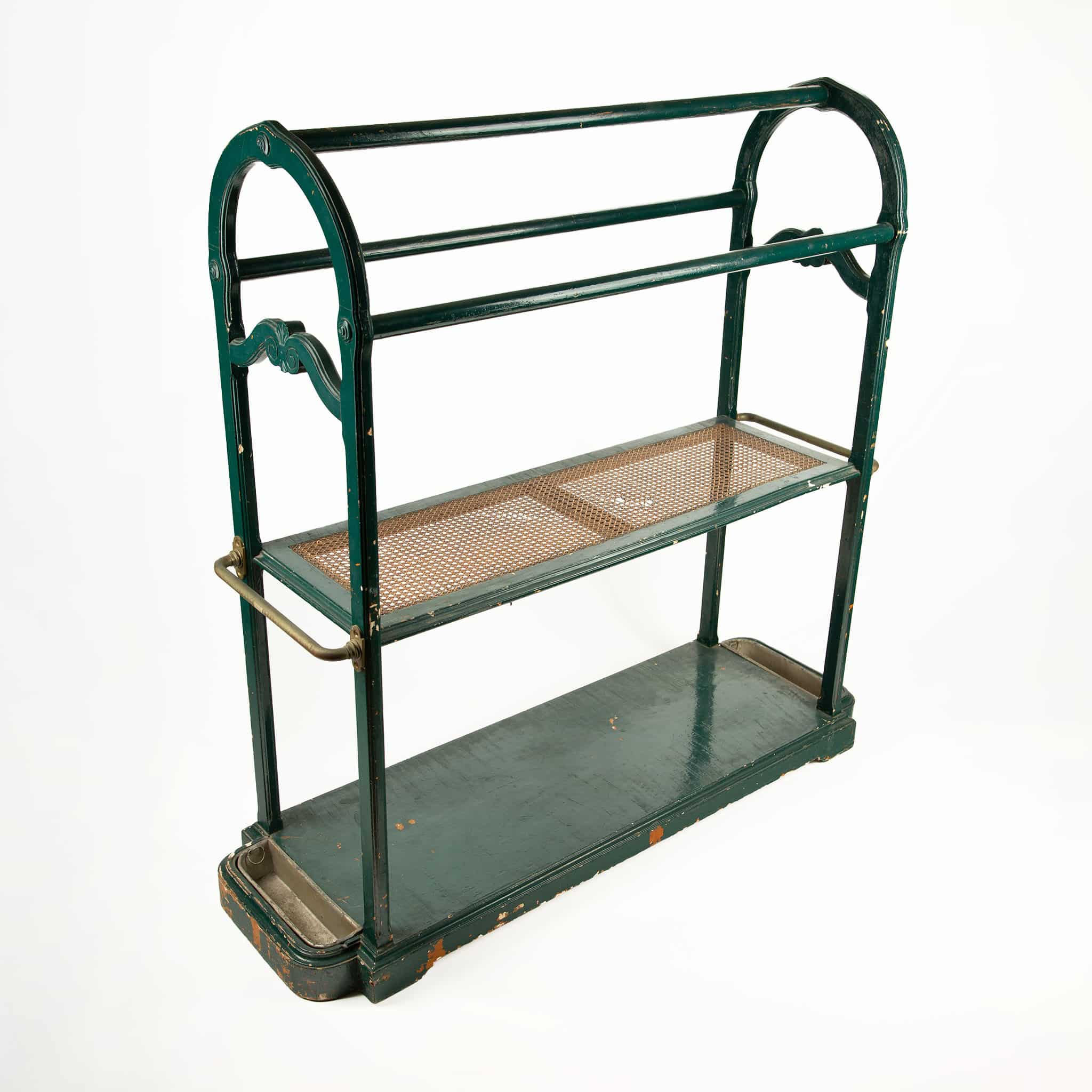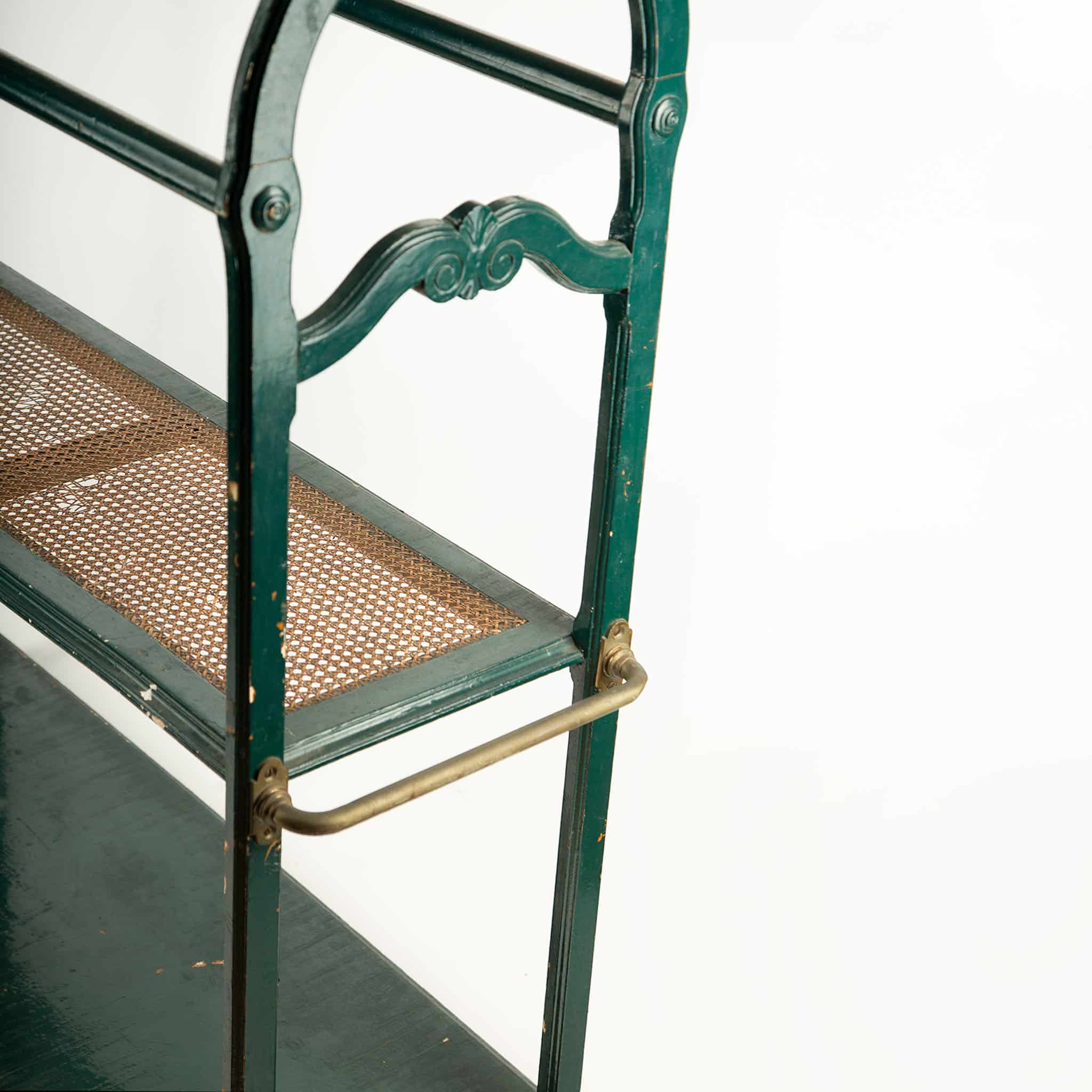 A charming late 19th-century jette habits hall stand, crafted in painted wood with a woven cane middle shelf, all original to the period. The piece features a sturdy rectangular form with arched side supports, a tray-like lower base designed for boots or shoes, and a caned upper shelf for additional storage. Side hooks allow for the placement of umbrellas, walking sticks, or canes, making it a versatile and functional furnishing. The rich green painted surface shows attractive wear consistent with age, enhancing its authentic patina. Solid, well-preserved, and ideal for organizing an entryway or dressing room with timeless character. Dimensions: 17.5" depth × 51.5" width × 51.5" height.