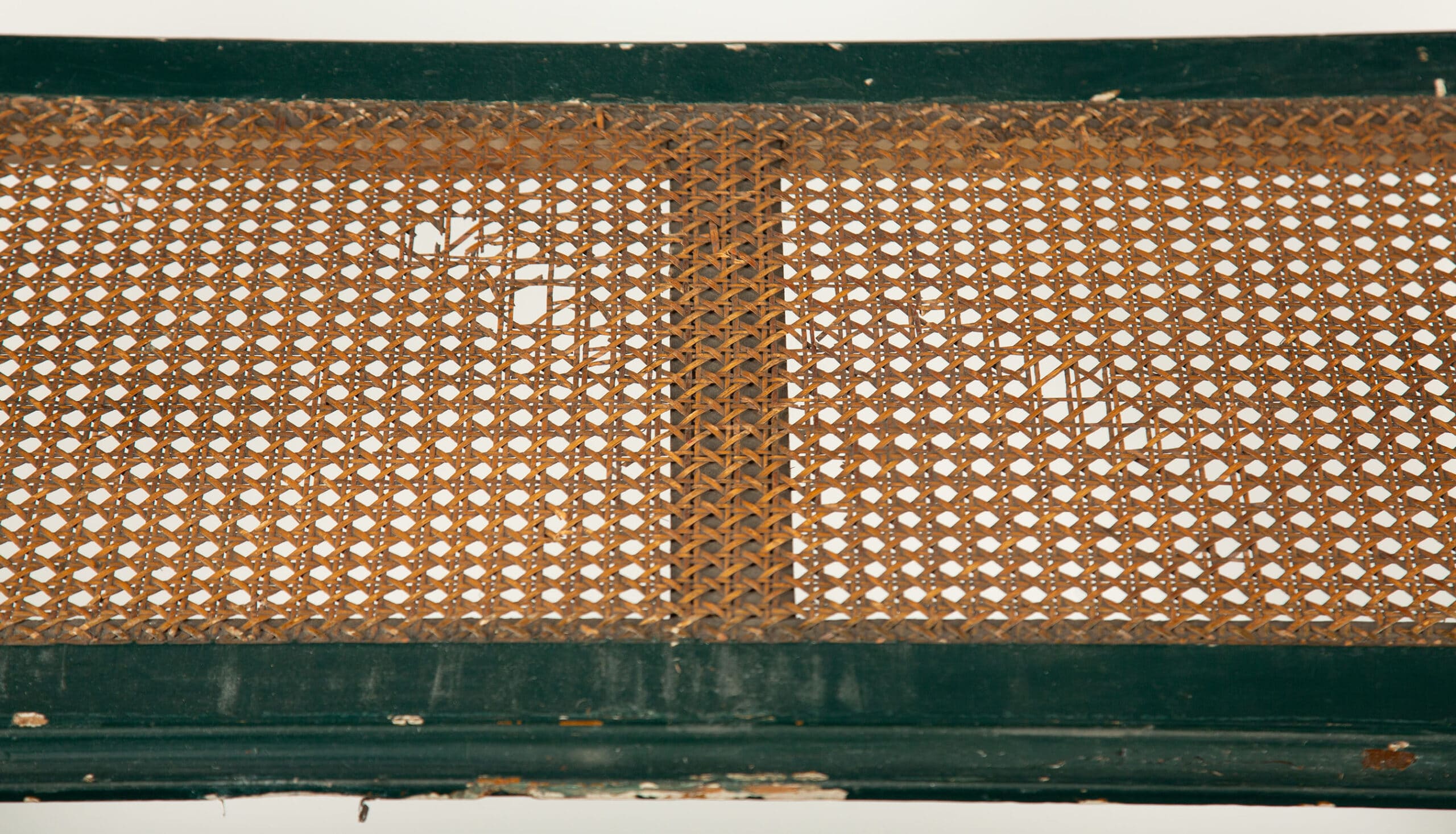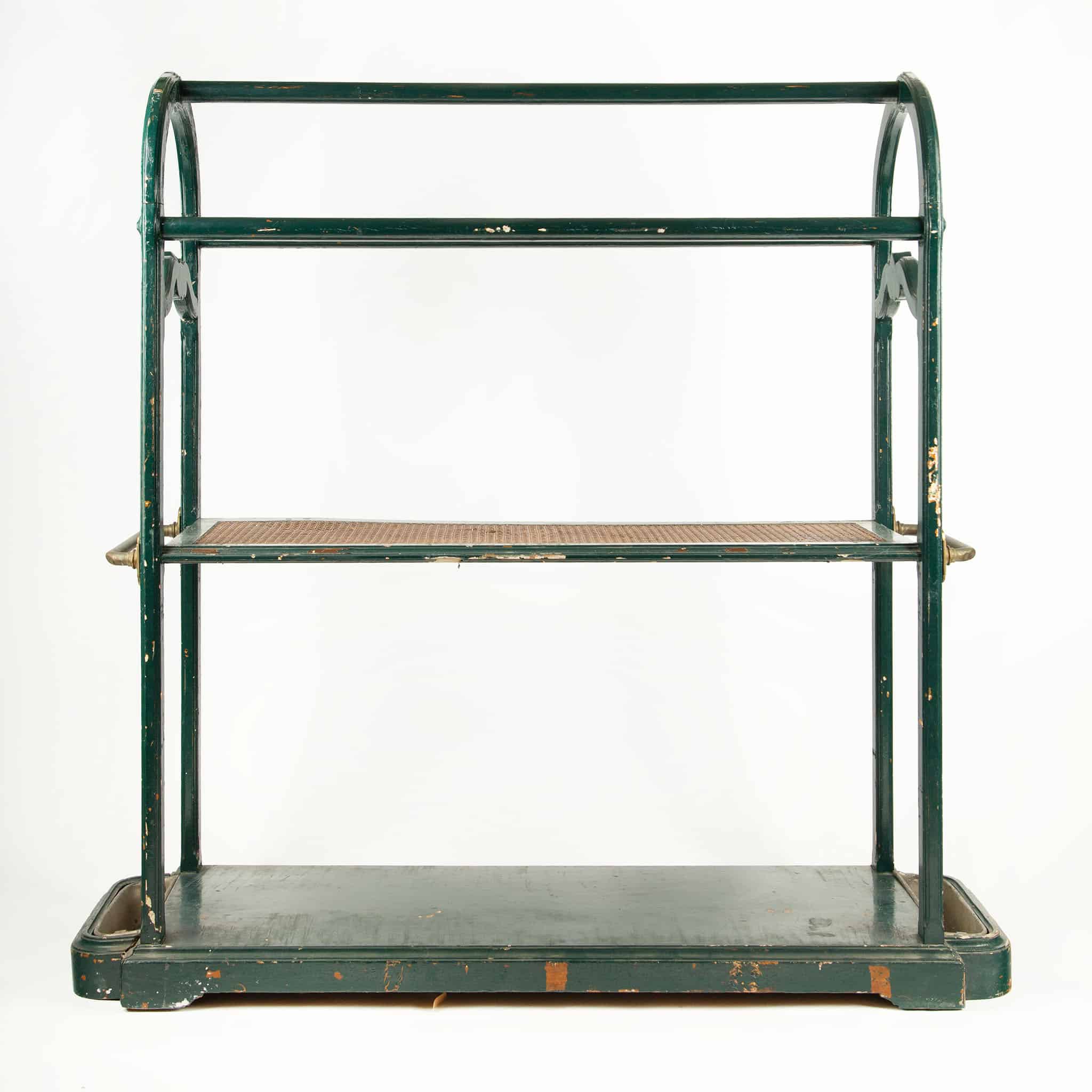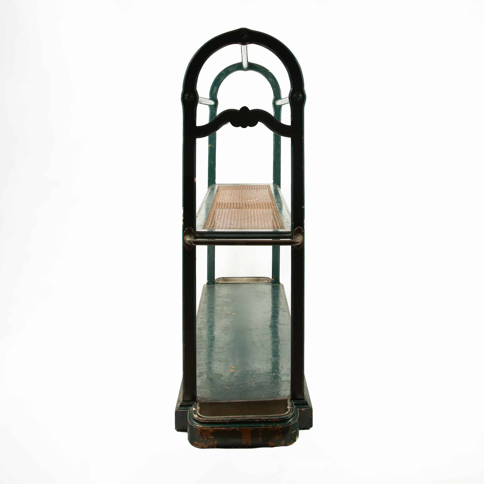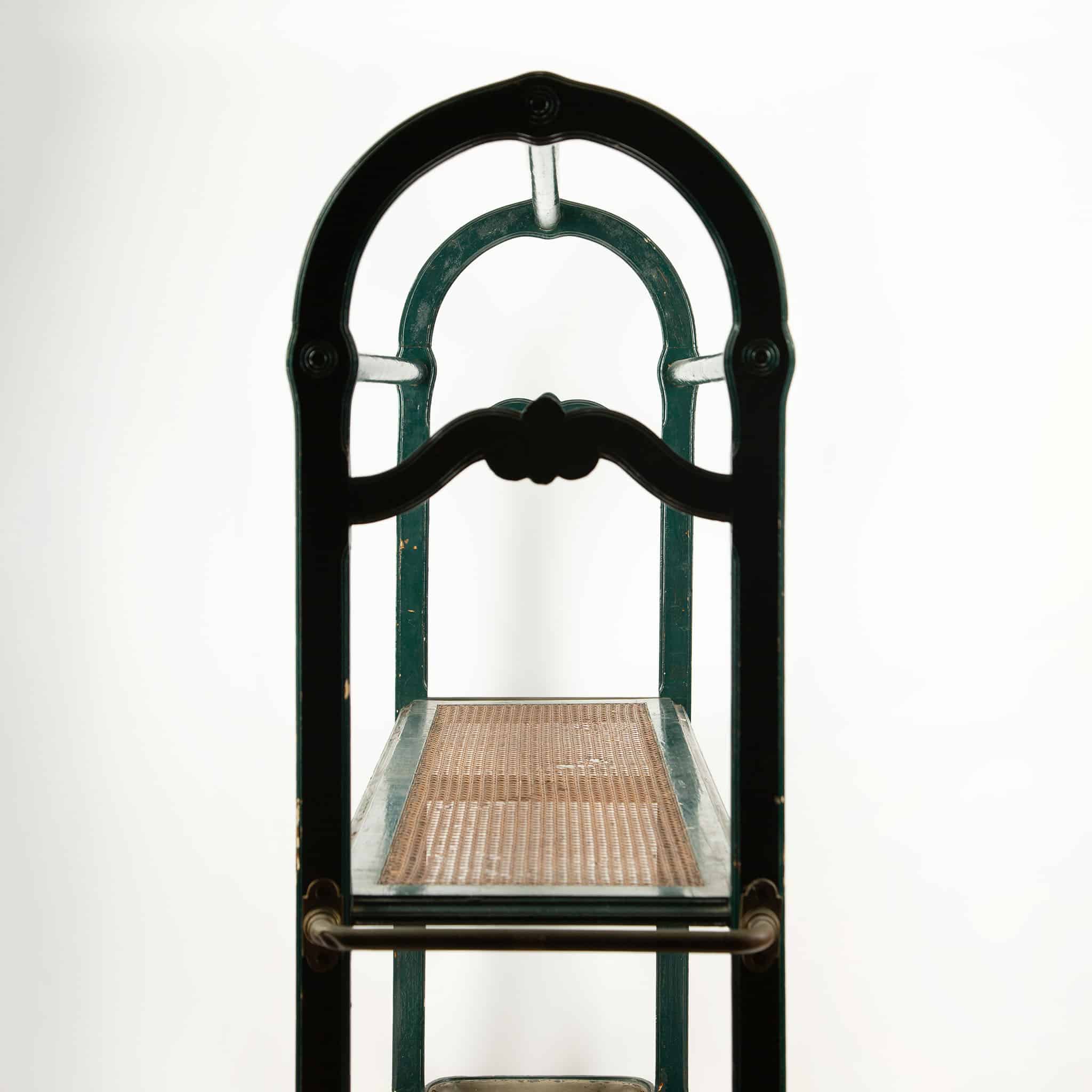 A charming late 19th-century jette habits hall stand, crafted in painted wood with a woven cane middle shelf, all original to the period. The piece features a sturdy rectangular form with arched side supports, a tray-like lower base designed for boots or shoes, and a caned upper shelf for additional storage. Side hooks allow for the placement of umbrellas, walking sticks, or canes, making it a versatile and functional furnishing. The rich green painted surface shows attractive wear consistent with age, enhancing its authentic patina. Solid, well-preserved, and ideal for organizing an entryway or dressing room with timeless character. Dimensions: 17.5" depth × 51.5" width × 51.5" height.