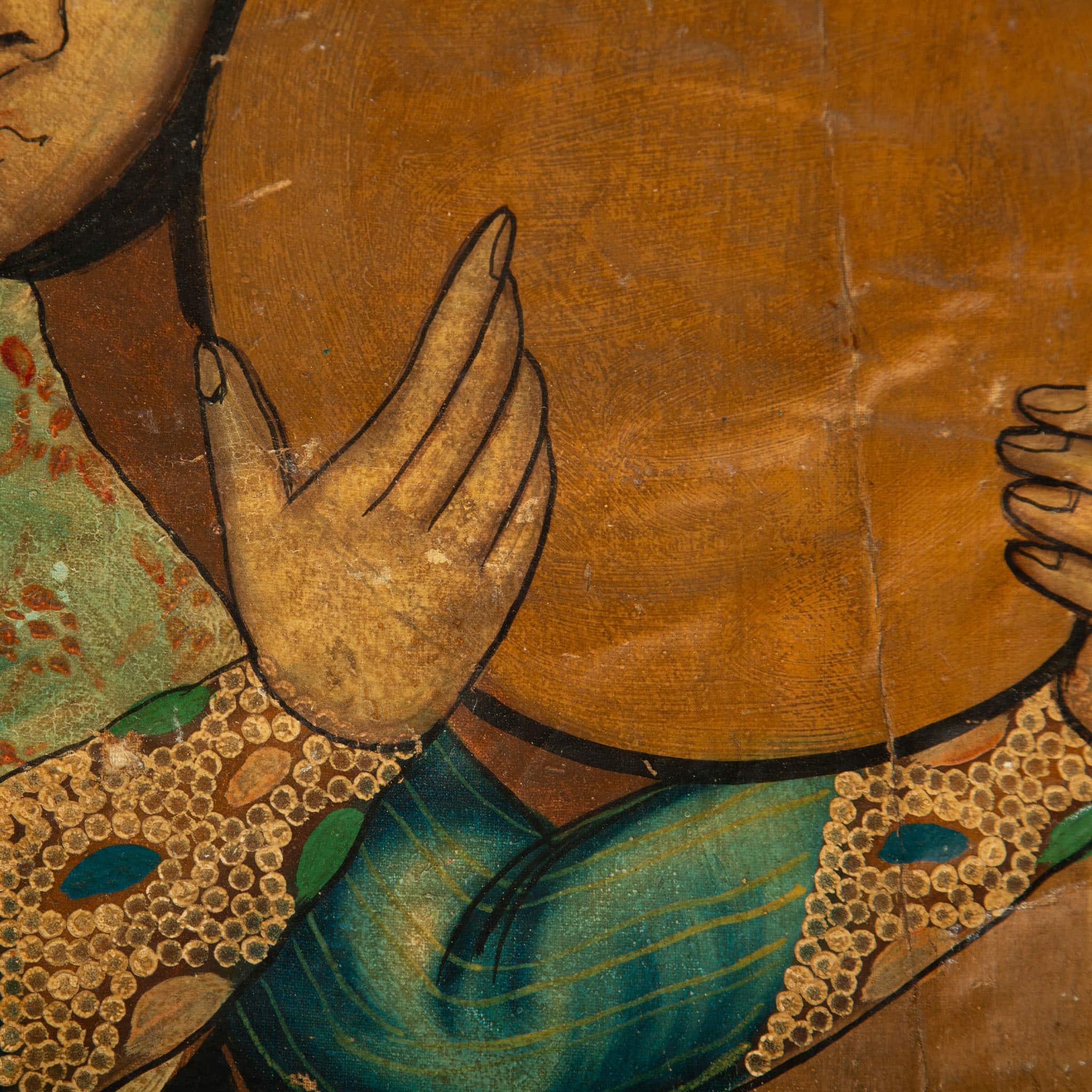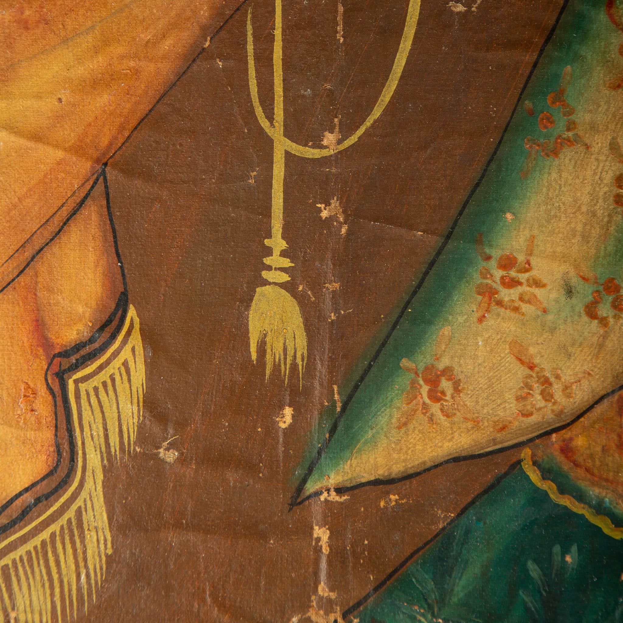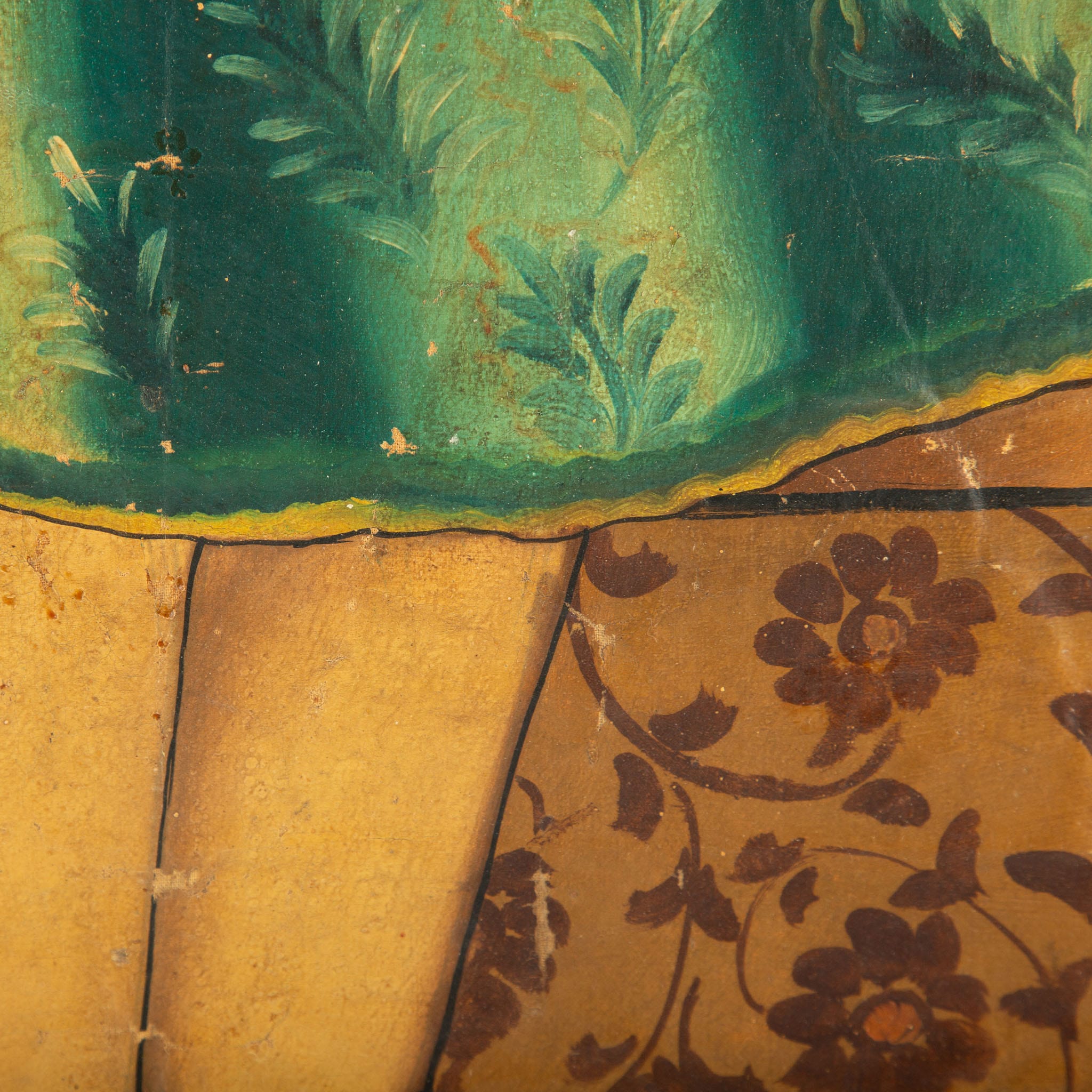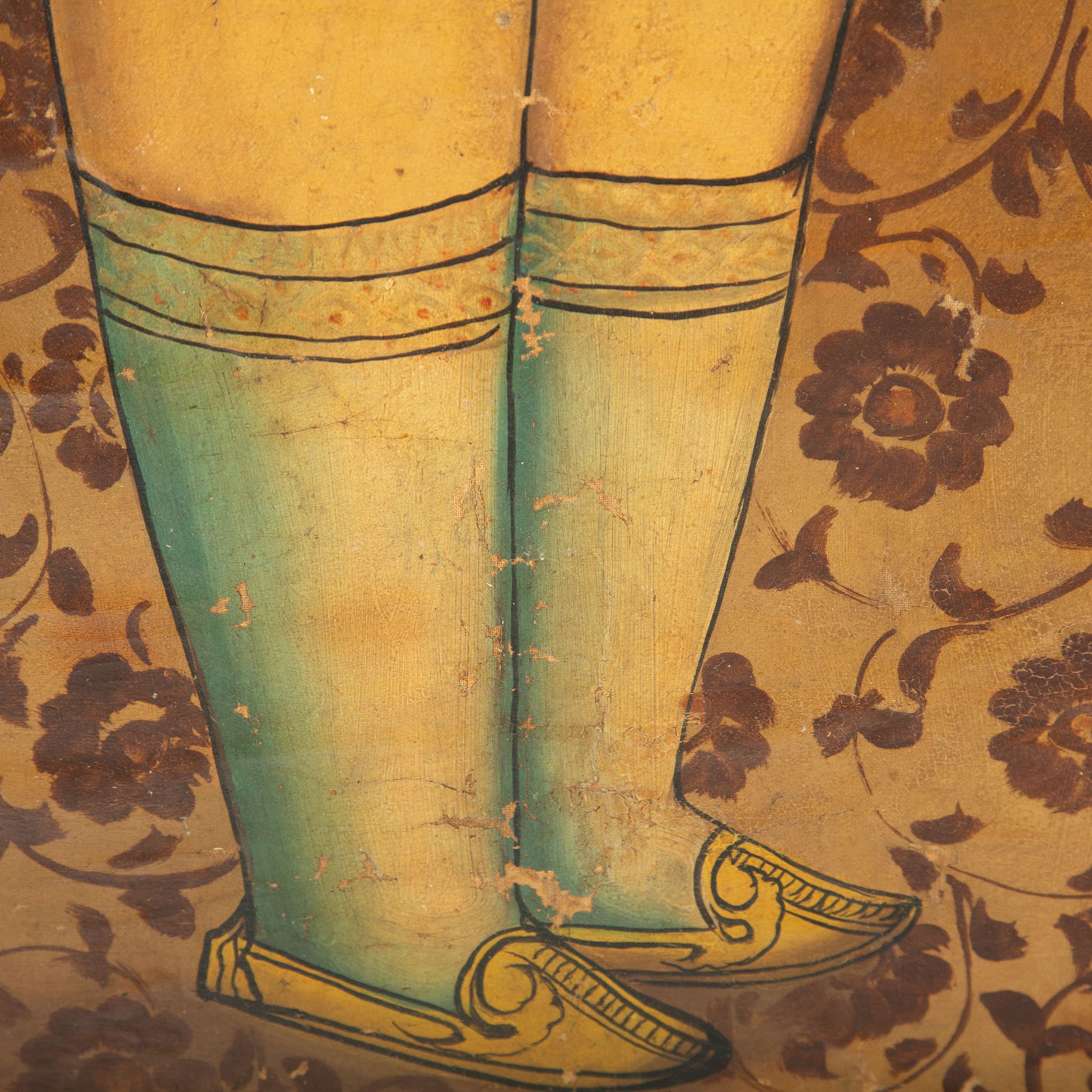 Oil on canvas depicting a woman holding a tambourine, dressed in a vibrant green robe with floral motifs, fitted leggings, and a patterned veil. She is positioned within an interior framed by draped curtains and architectural details, standing on a floral ground that heightens the decorative richness of the scene. Approx. 31.5 x 41.5 in. (80 x 105 cm). This work exemplifies the Qajar school’s continuation into the early 20th century, characterized by elongated proportions, almond-shaped eyes, and a theatrical presentation of sitters adorned with patterned textiles and symbolic attributes. The tambourine underscores the association of feminine beauty with music and performance, a recurring theme in Qajar visual culture.