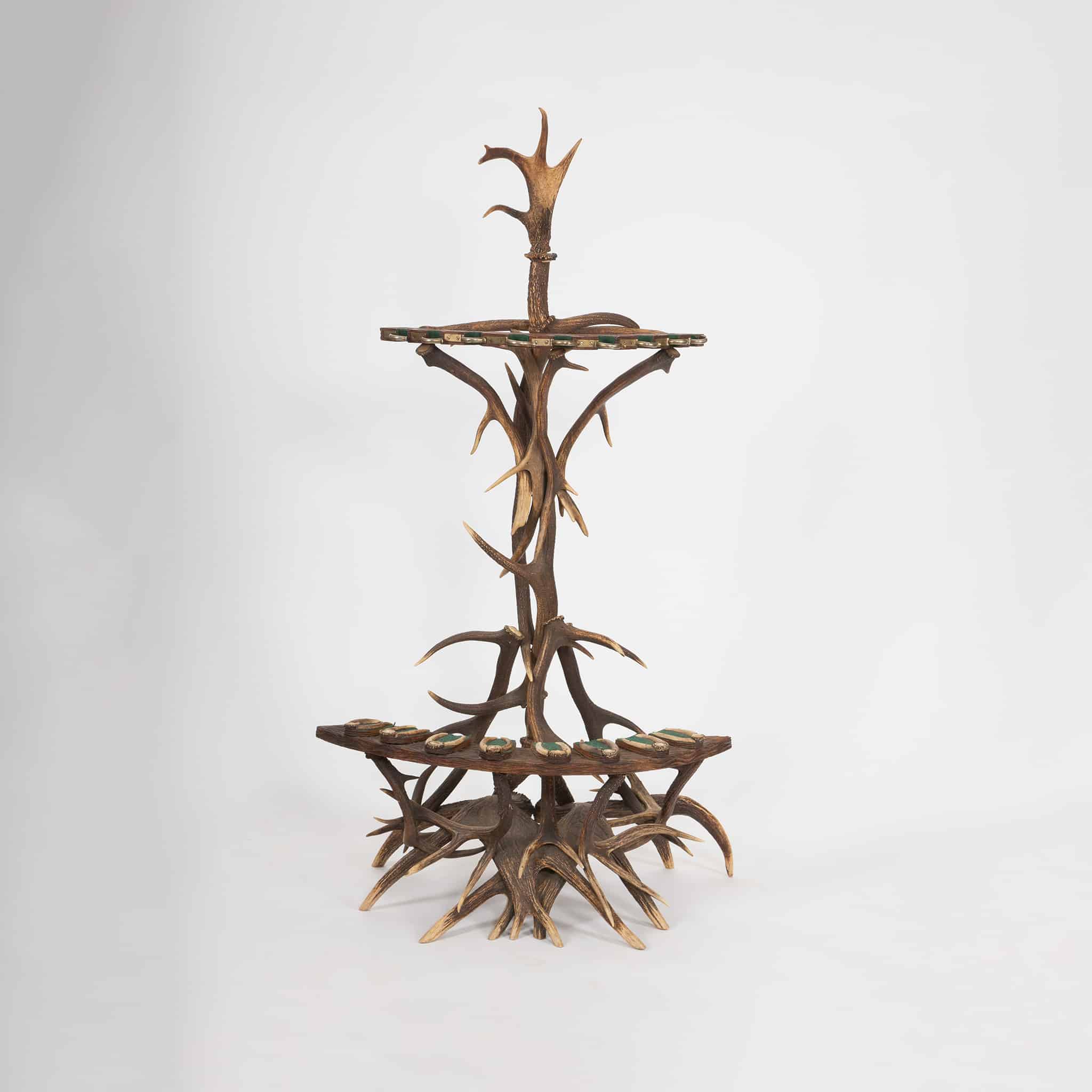This exceptional and highly sculptural 19th-century Black Forest gun stand is a rare, one-of-a-kind work crafted from meticulously arranged natural antlers. Rising in a dramatic, tree-like form, the composition features a central column of interwoven antlers branching outward to support two circular tiers designed to hold firearms. Each rack is fitted with brass hooks and green felt-lined rests to protect and stabilize the guns, reflecting both functional precision and refined craftsmanship.