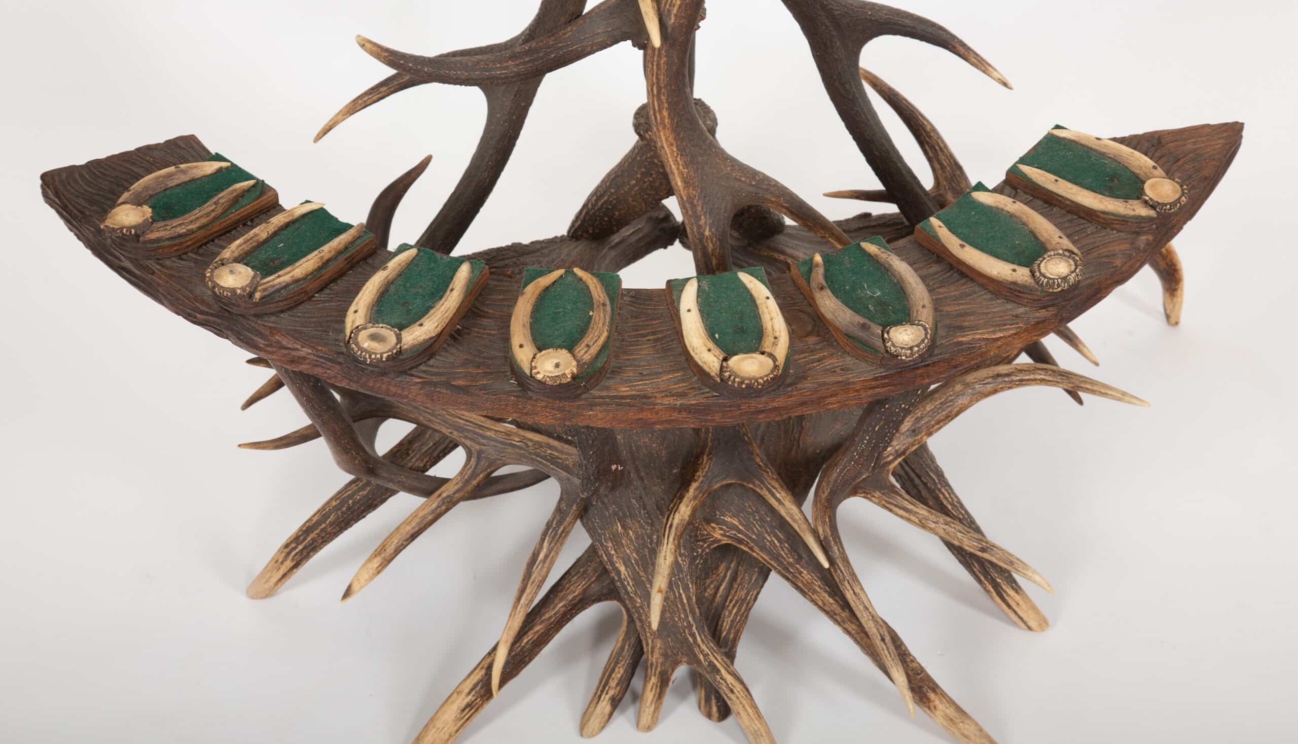 Produced in the Black Forest region of Germany, such pieces were traditionally made for hunting lodges and aristocratic interiors, celebrating the Romantic-era fascination with nature, hunting culture, and virtuoso woodworking. The careful selection and symmetrical arrangement of the antlers demonstrate the hand of a skilled artisan, elevating the stand beyond utilitarian purpose to a striking decorative object.