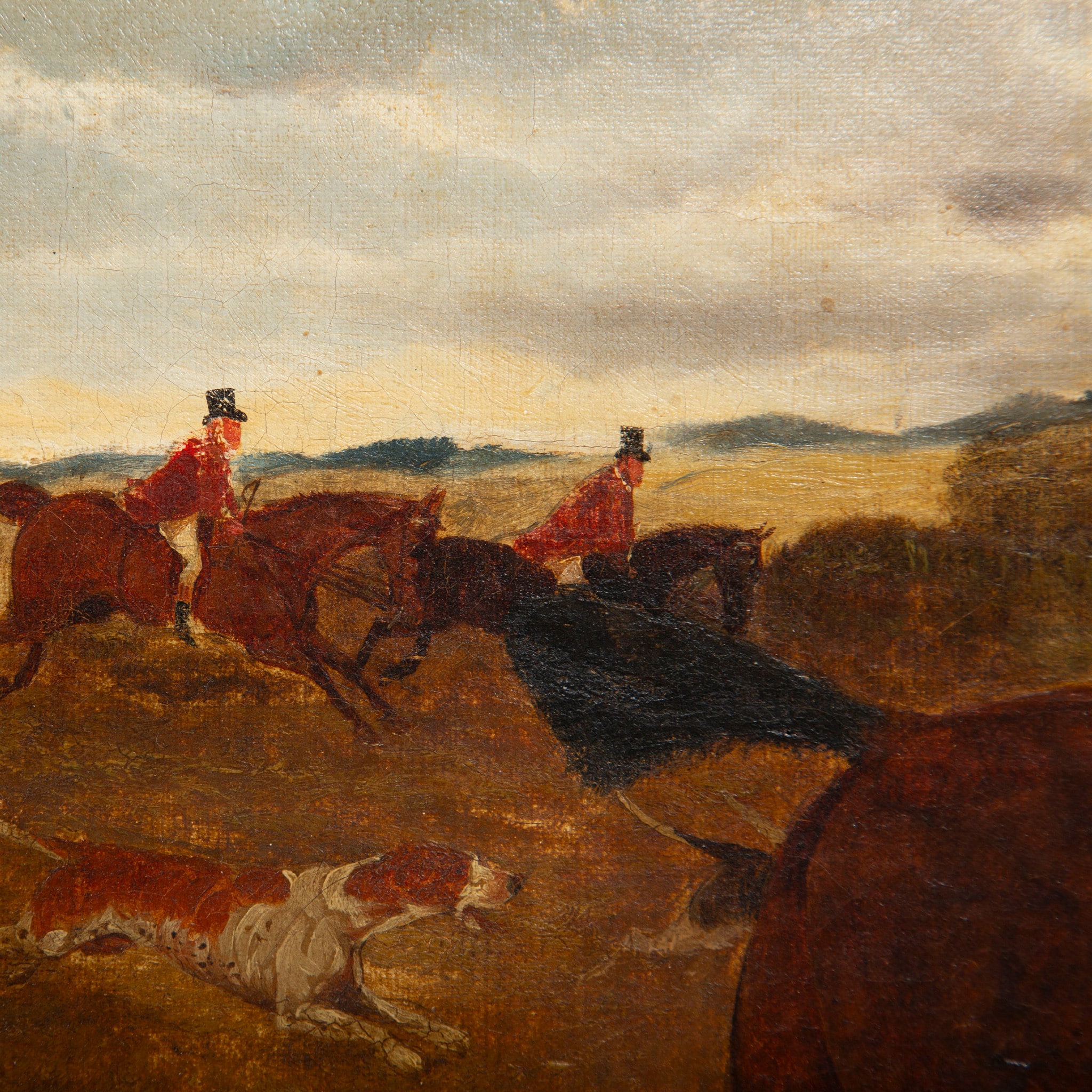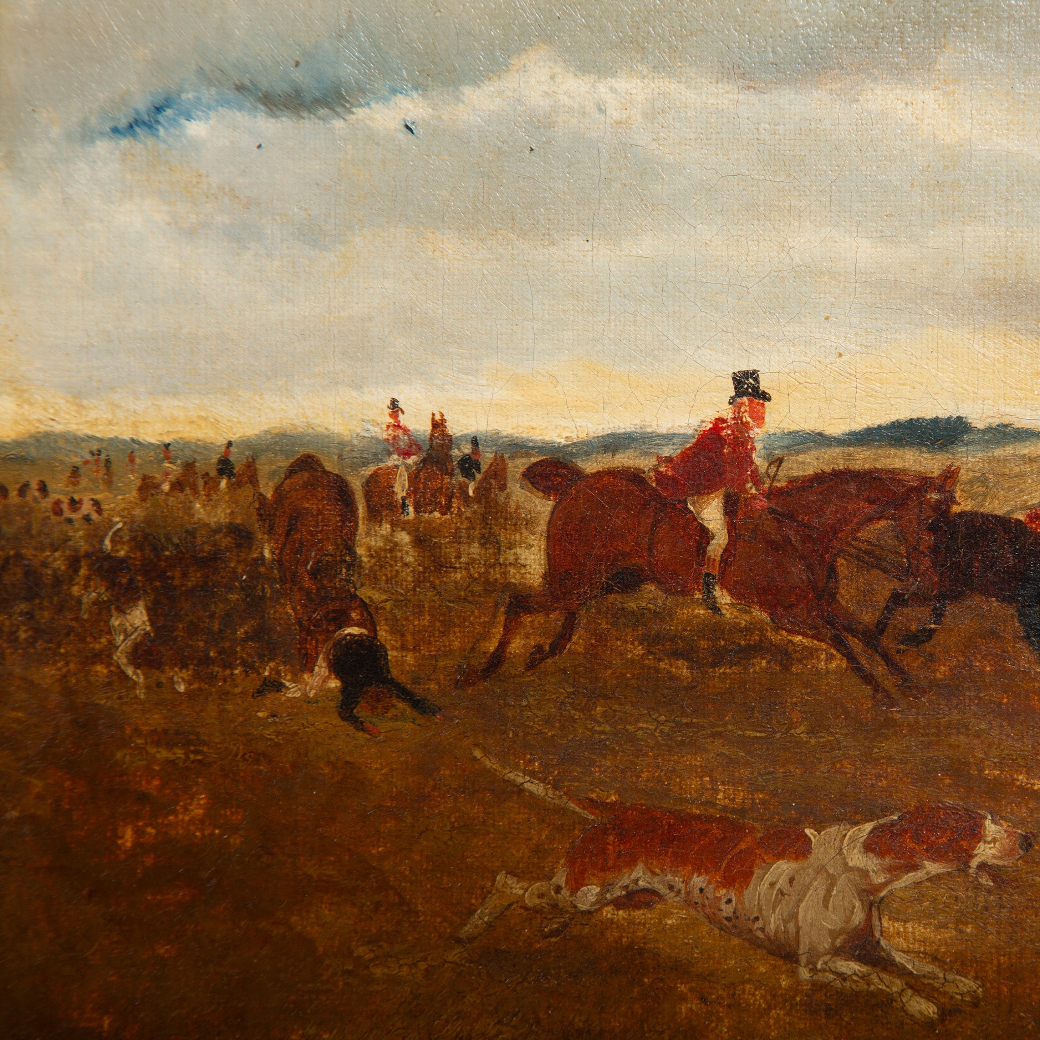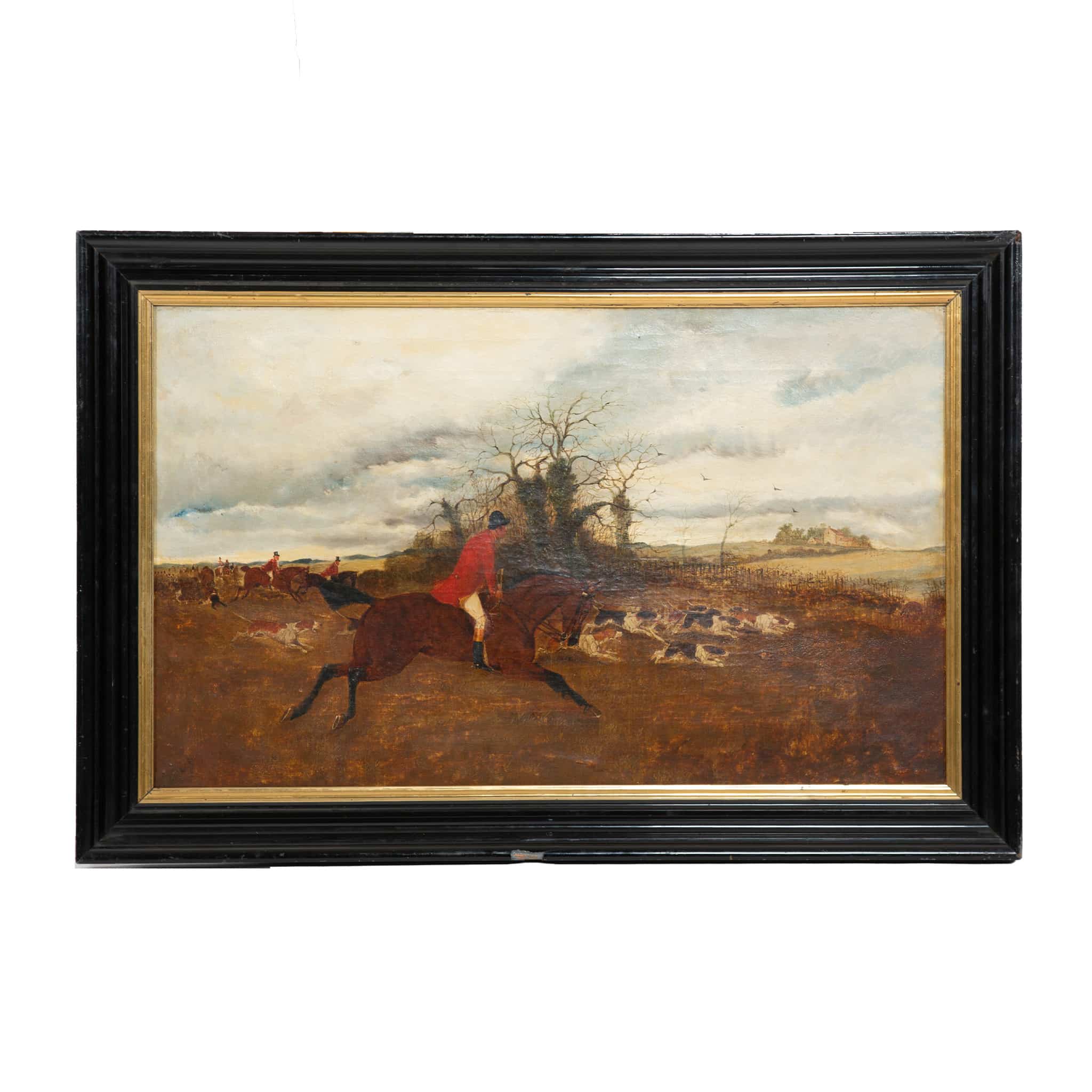 Executed with a confident, painterly hand, the work favors narrative and motion over fine detail, a characteristic approach of sporting pictures created for country houses and hunting lodges. A palette of warm earth tones, punctuated by the vivid reds of the riders’ jackets, creates strong visual contrast against the muted landscape. Likely the work of a provincial or studio-trained artist working within the English sporting tradition popularized by painters such as John Frederick Herring Sr. and his contemporaries, the painting is presented in an ebonized frame with gilt liner appropriate to both the period and subject.