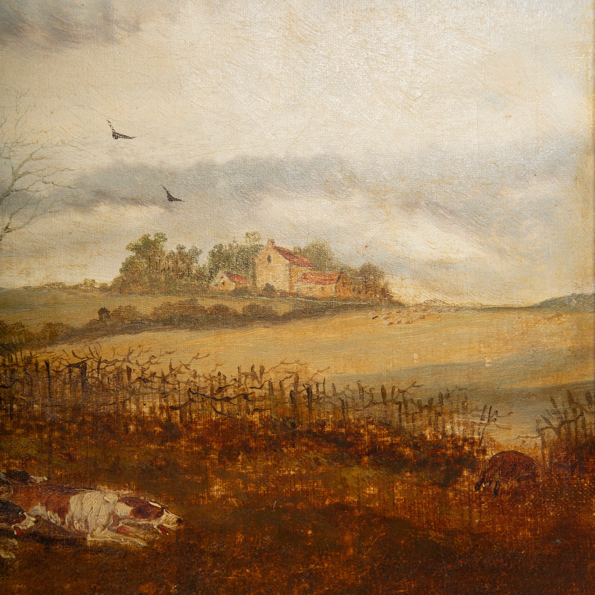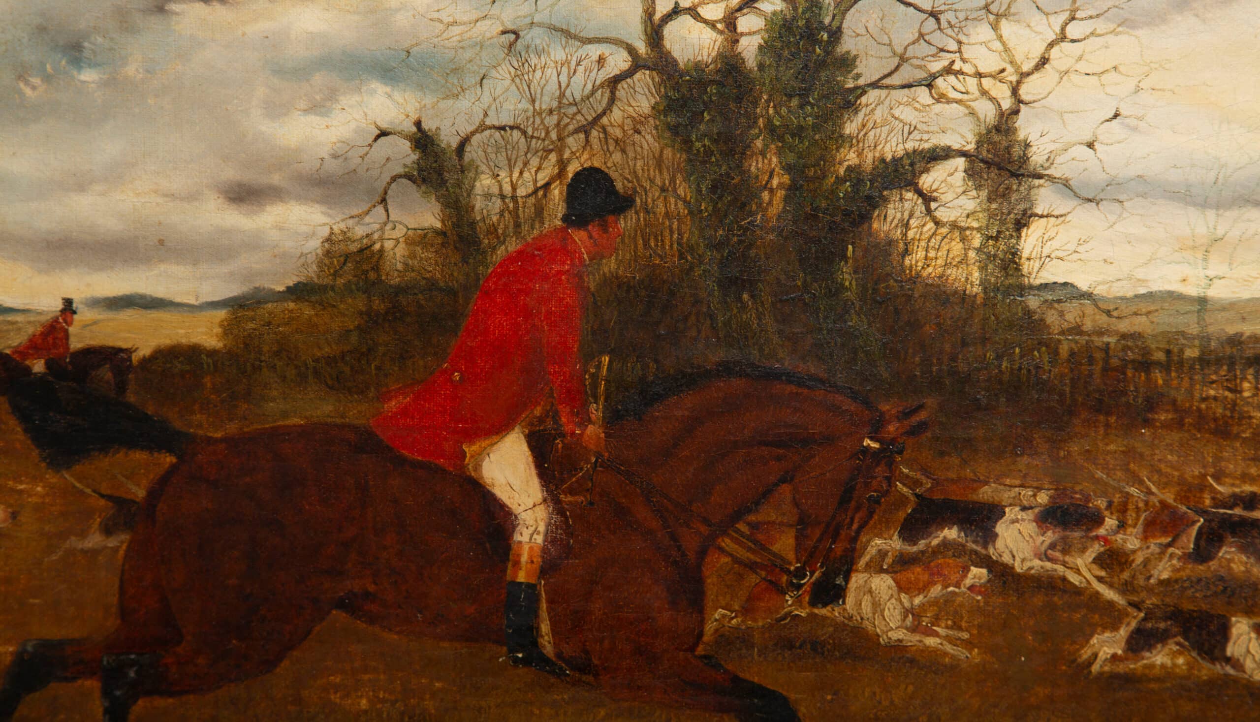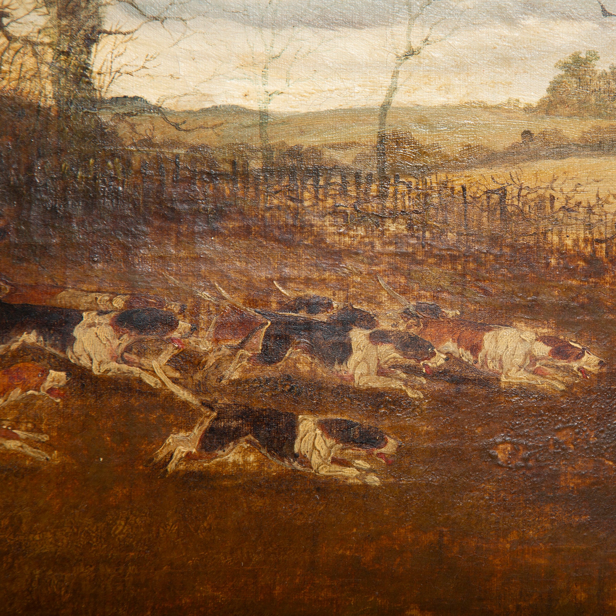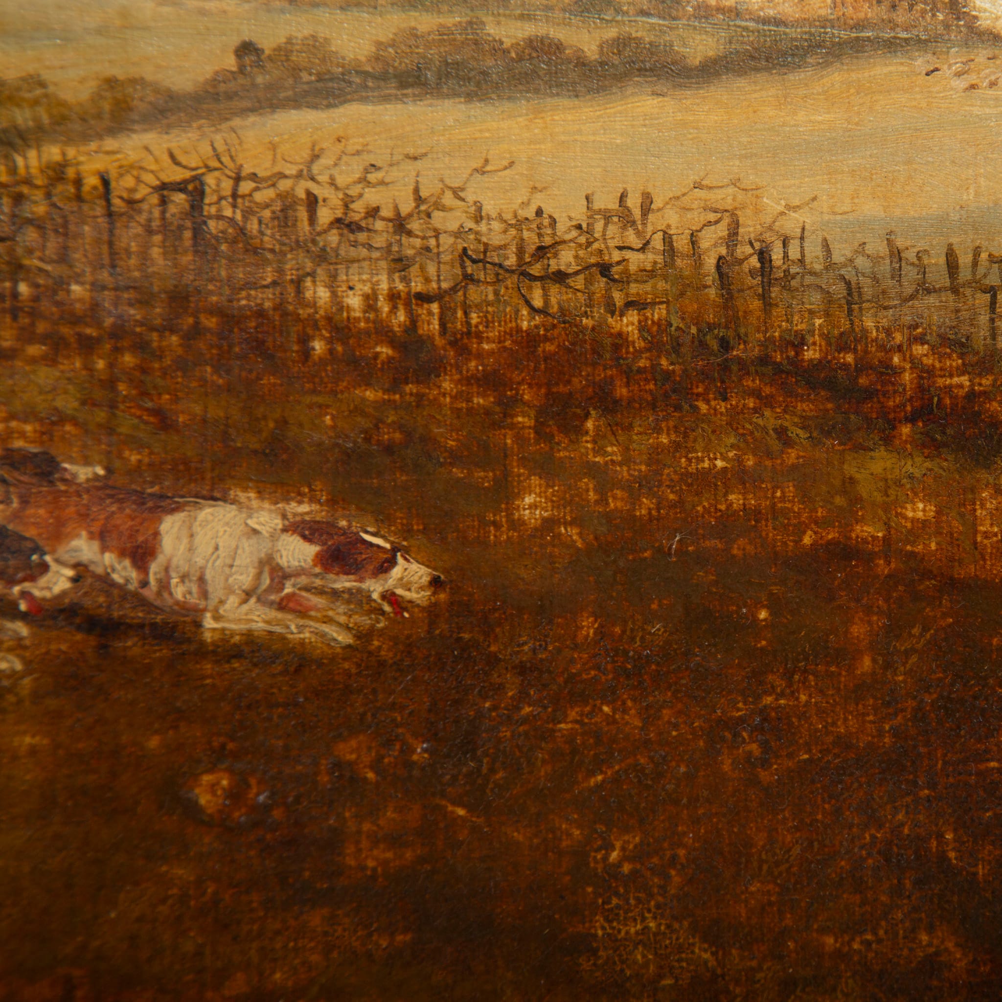 Executed with a confident, painterly hand, the work favors narrative and motion over fine detail, a characteristic approach of sporting pictures created for country houses and hunting lodges. A palette of warm earth tones, punctuated by the vivid reds of the riders’ jackets, creates strong visual contrast against the muted landscape. Likely the work of a provincial or studio-trained artist working within the English sporting tradition popularized by painters such as John Frederick Herring Sr. and his contemporaries, the painting is presented in an ebonized frame with gilt liner appropriate to both the period and subject.