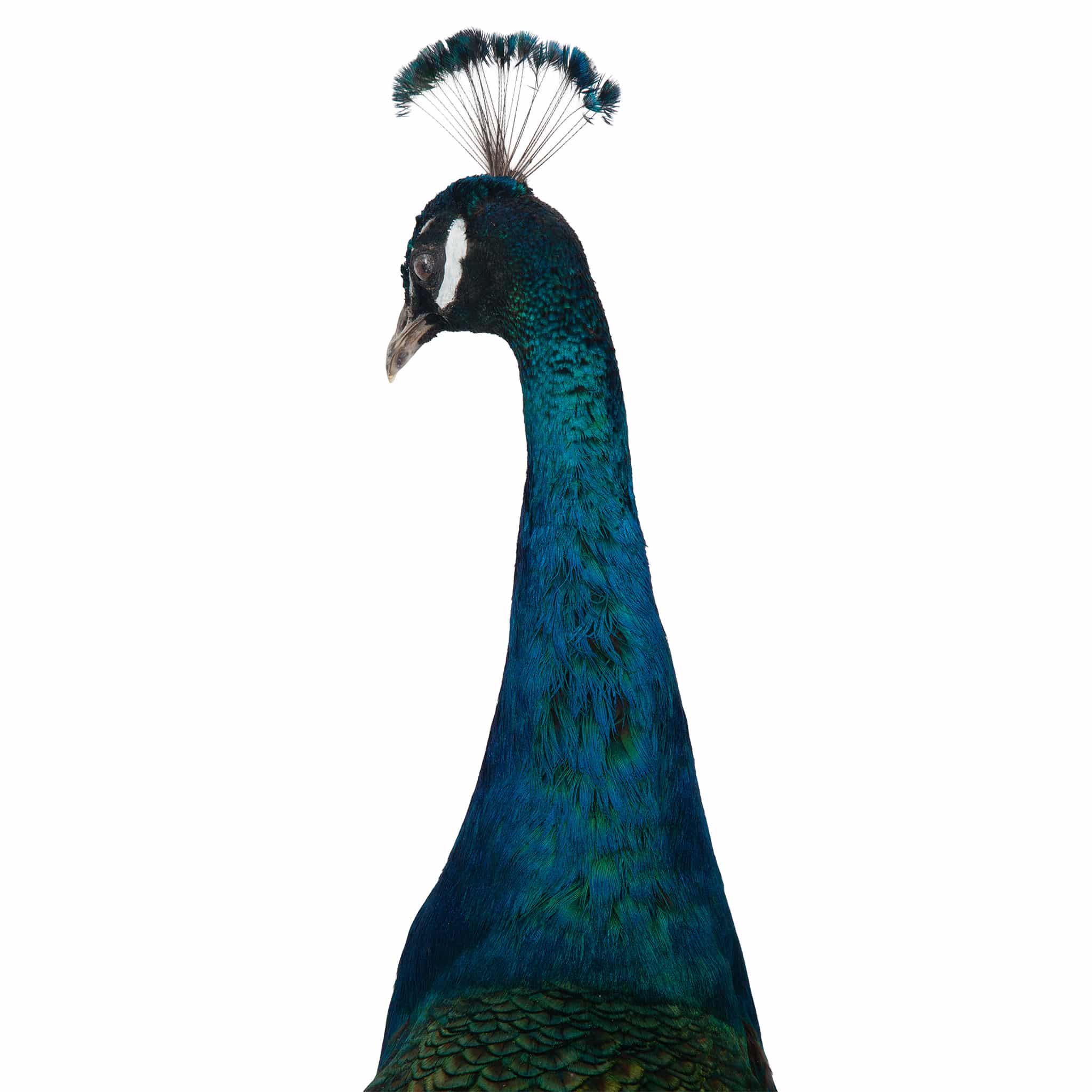This finely preserved Indian Blue Peacock (Pavo cristatus) taxidermy mount showcases the species’ celebrated iridescent blue and green plumage in vivid detail. Native to the Indian subcontinent, the peacock is distinguished by its shimmering cobalt neck and breast and its dramatic train adorned with the iconic “eye” (ocelli) pattern, formed by elongated upper tail coverts.