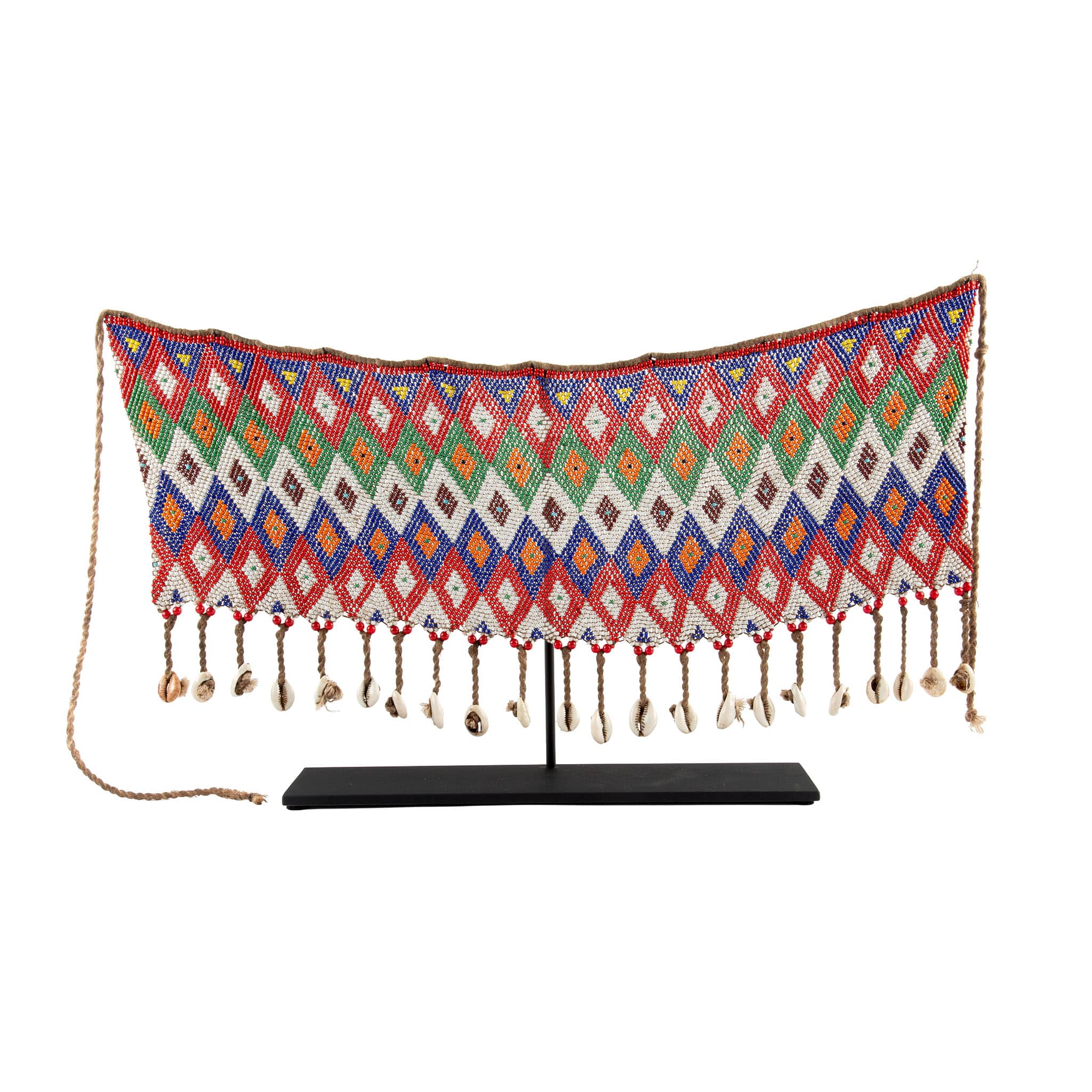 A vibrant, handwoven beaded belt—traditionally known as a cache-sex—crafted from multicolored glass beads arranged in a dynamic diamond motif of red, green, blue, orange, and white. Along the lower edge, braided fiber tassels terminate in natural cowrie shells, elements widely associated with wealth, fertility, trade, and spiritual protection across numerous African and Oceanic cultures. The piece is mounted on a custom black metal stand, elevating it from wearable adornment to sculptural display and allowing the intricate beadwork, rhythmic geometry, and tactile interplay of materials to be fully appreciated. Both decorative and ceremonial in nature, this belt exemplifies the cultural significance of beadwork as a medium through which identity, status, and artistry are expressed.
