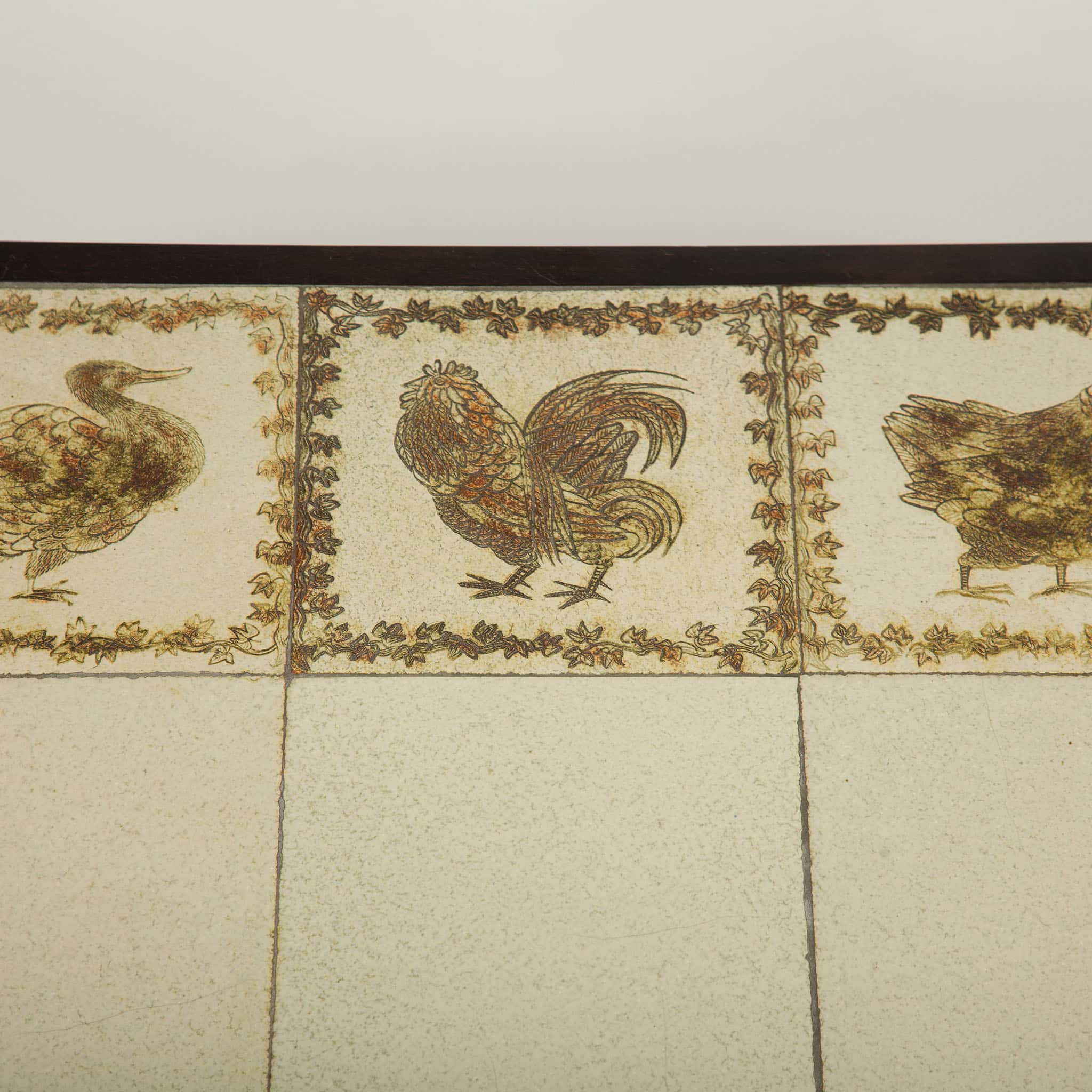 A mid-20th century coffee table designed by renowned French ceramist Roger Capron, featuring a lacquered wooden base with cylindrical legs and a striking glazed terracotta tile top. The surface is decorated with a series of twelve hand-printed tiles arranged around a central plain tile panel, each tile depicting finely detailed motifs of roosters, hens, ducks, and other birds interspersed with botanical imagery. Signed R. Capron within the decoration, this piece exemplifies Capron’s celebrated fusion of utilitarian design and decorative artistry, reflecting his distinctive style that brought Vallauris ceramics international acclaim.