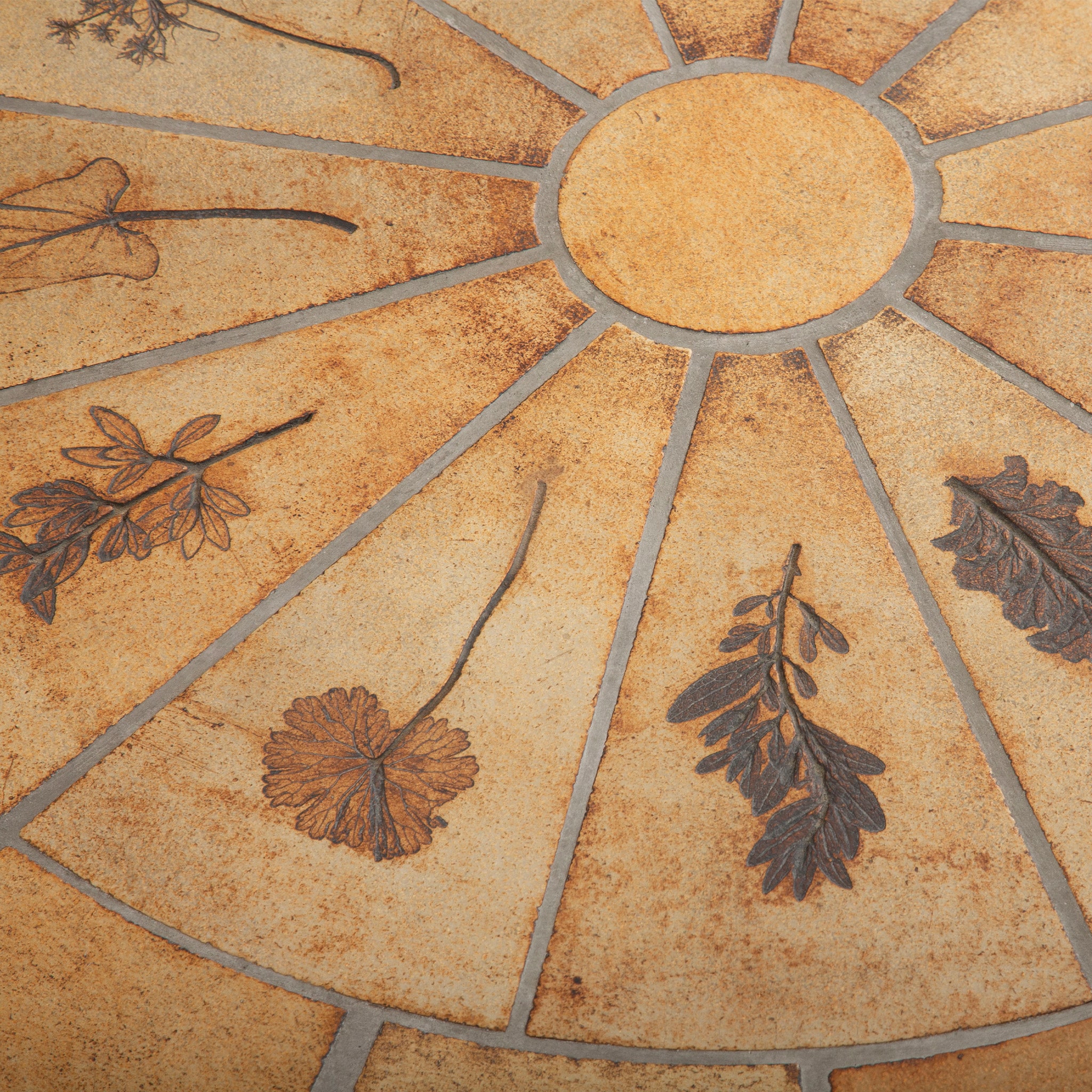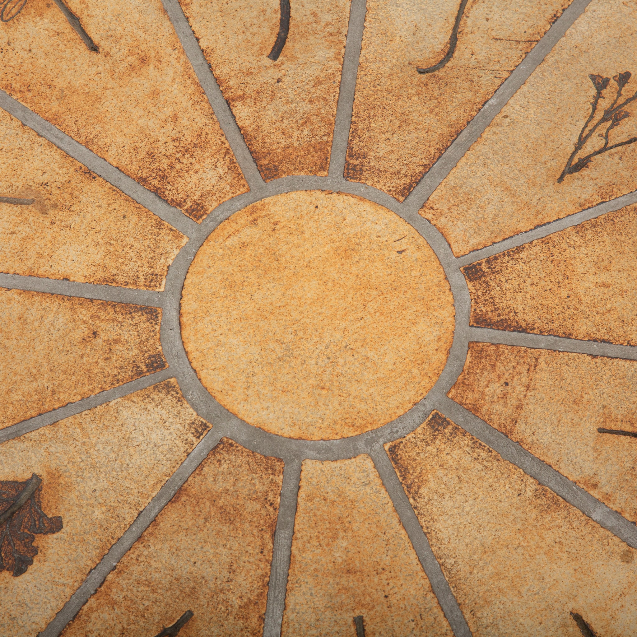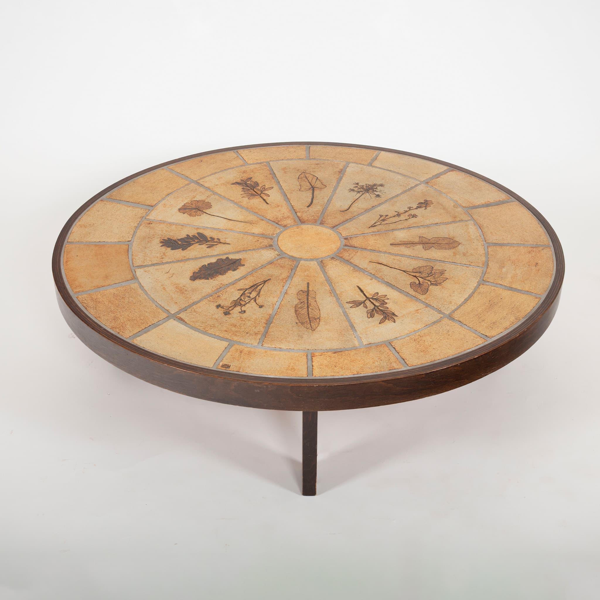 This mid-century French coffee table, signed Roger Capron, features a circular ceramic tile top decorated with imprinted botanical motifs, a signature element of Capron’s work in Vallauris. The radially arranged tiles, rendered in warm ochre and sand tones, are impressed with stylized leaves and plant forms and divided by contrasting grout lines that reinforce the geometric design.