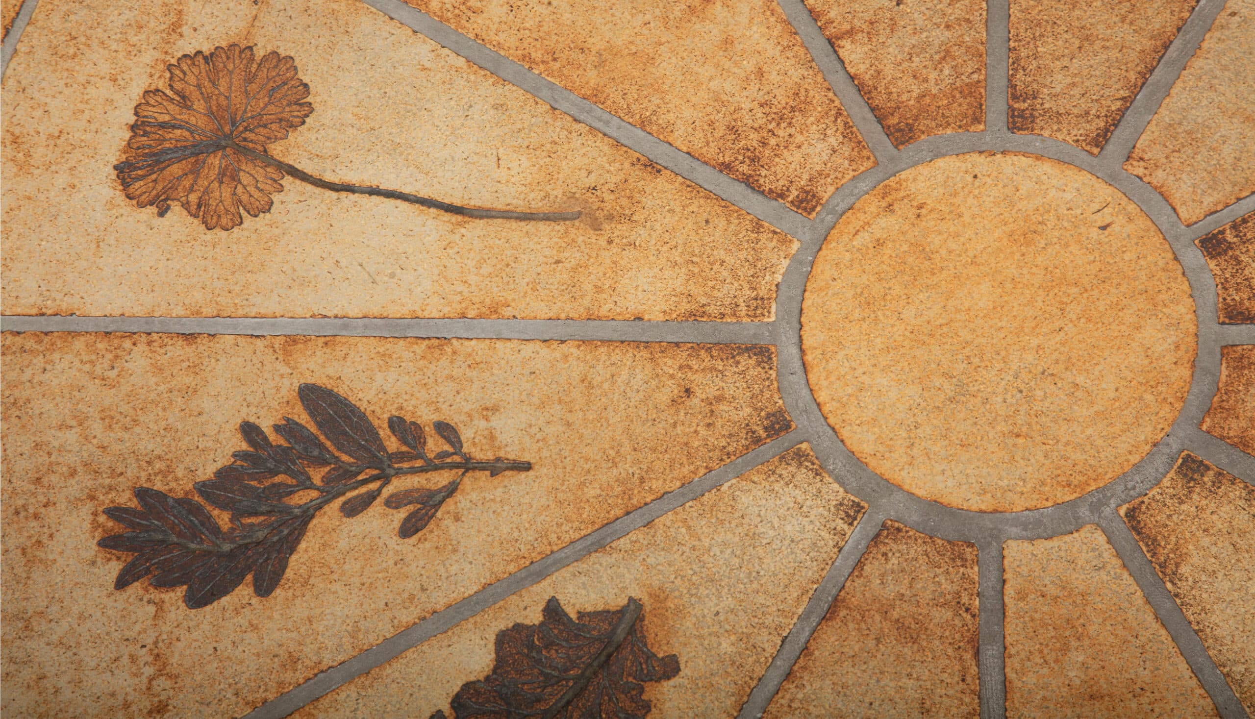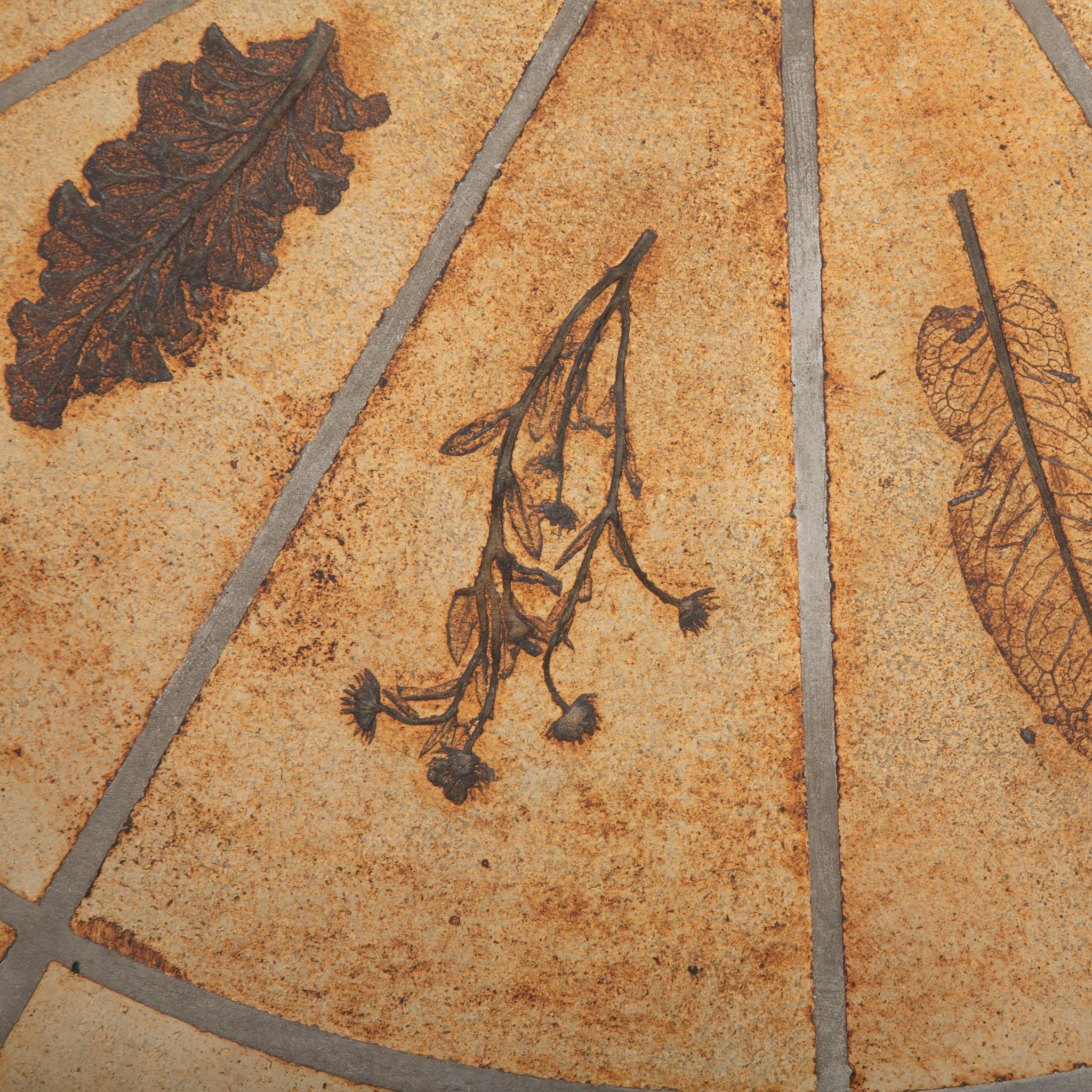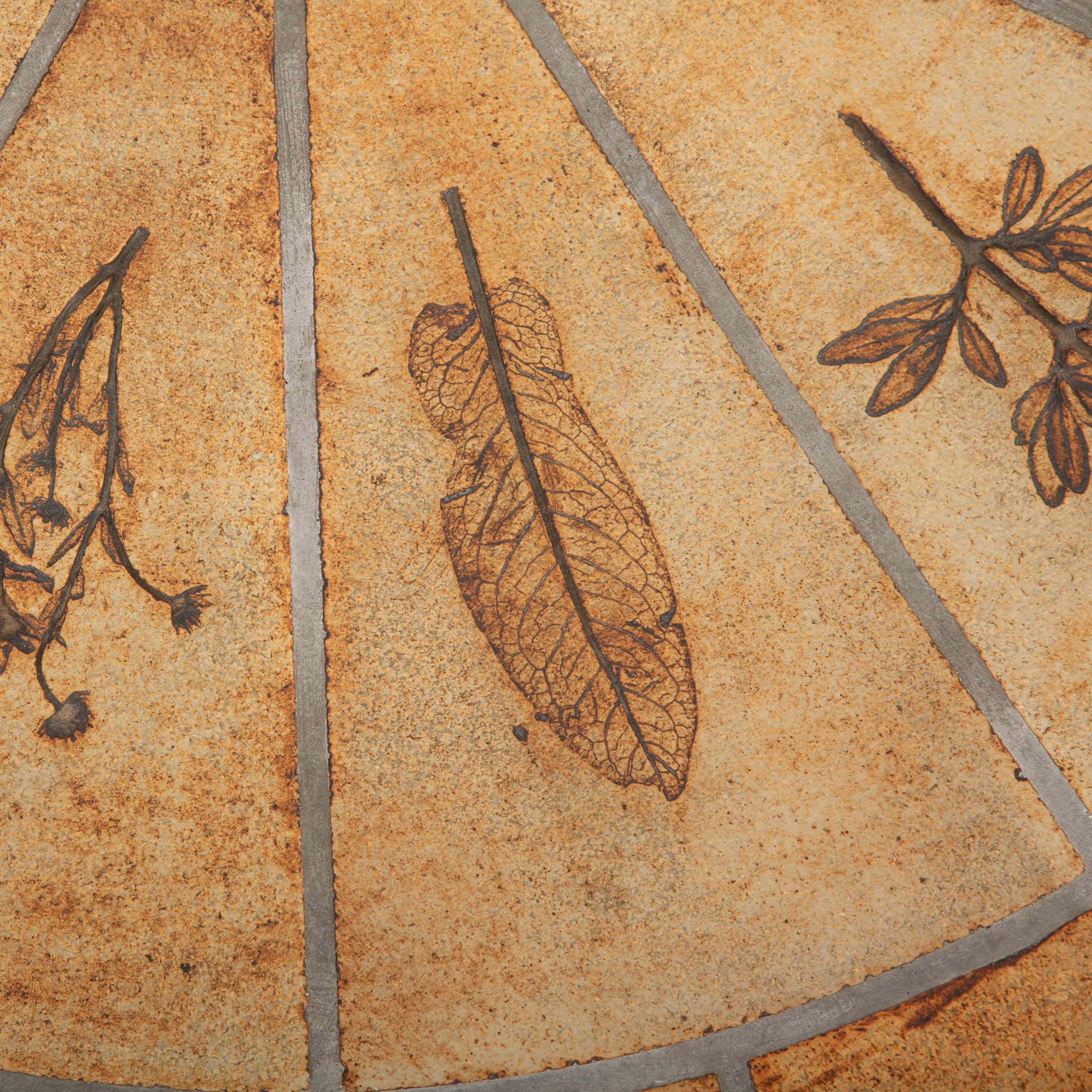 This mid-century French coffee table, signed Roger Capron, features a circular ceramic tile top decorated with imprinted botanical motifs, a signature element of Capron’s work in Vallauris. The radially arranged tiles, rendered in warm ochre and sand tones, are impressed with stylized leaves and plant forms and divided by contrasting grout lines that reinforce the geometric design.