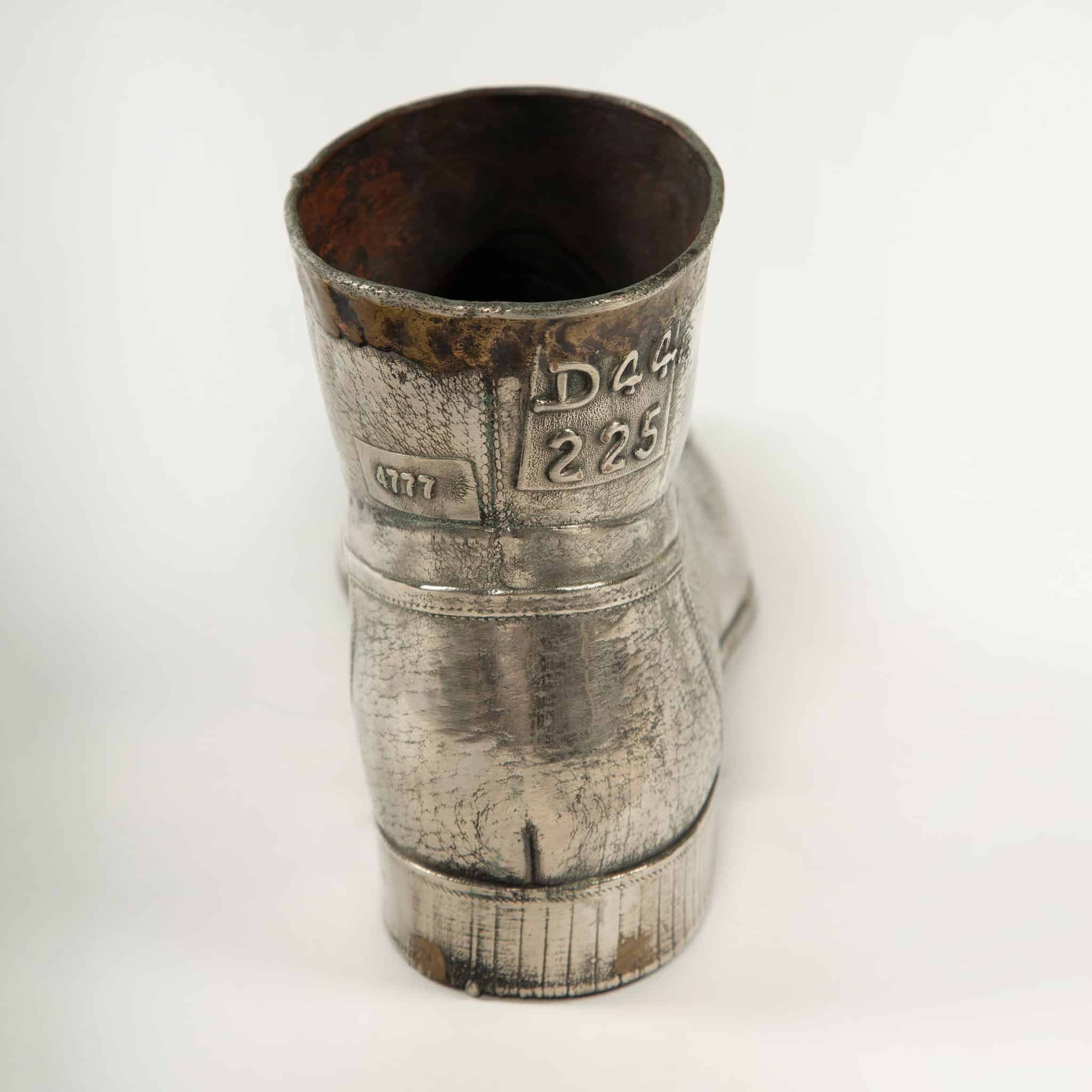 A unique vintage metal boot sculpture modeled in the form of a desert boot, cast in silvered metal with remarkable detail replicating the texture, stitching, sole, and lace eyelets of a real shoe. The boot retains its industrial, utilitarian character, giving it the appearance of a foundry or workshop casting. Stamped “Dora” to the underside, the piece was produced by Dora Foundry (France, mid-20th century), a workshop known for its high-quality metal castings, decorative objects, and novelty items. Its solid weight and crisp detail suggest it may have been conceived as a decorative object, possibly for use as a shop display, conversation piece, or whimsical paperweight. The interior shows traces of oxidation consistent with age.