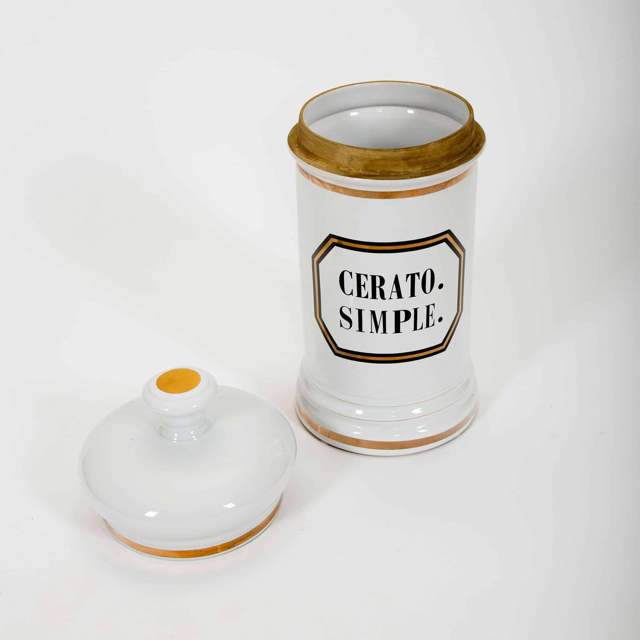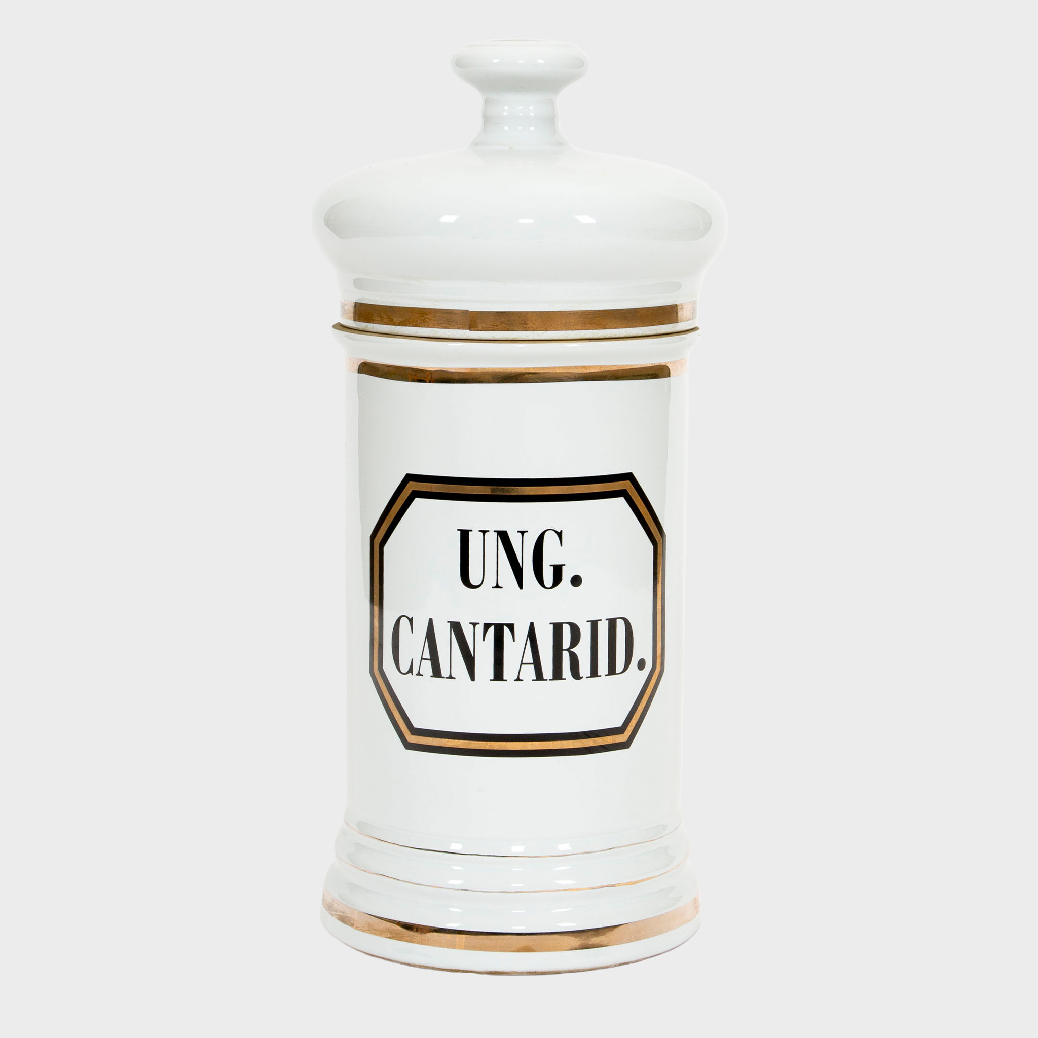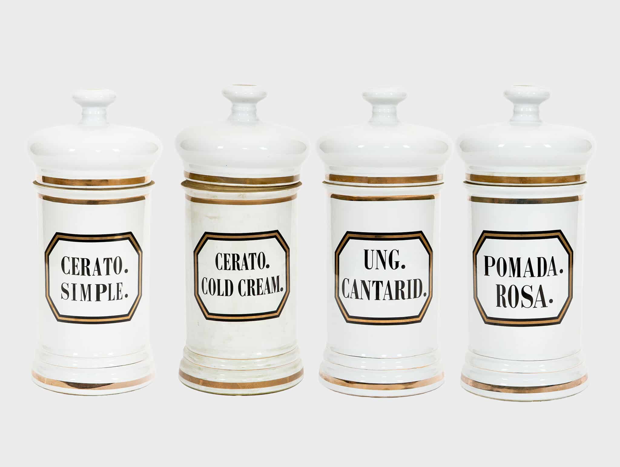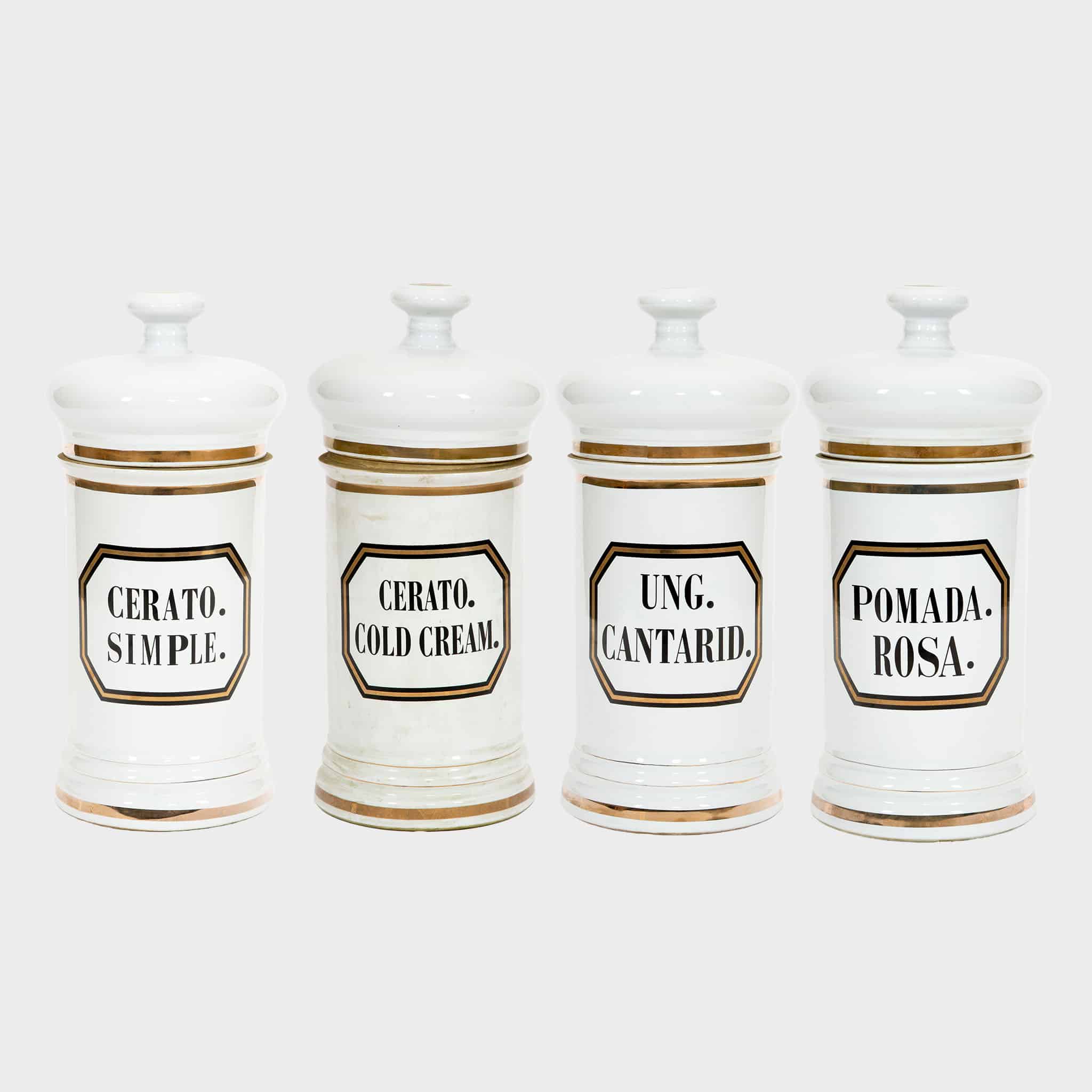 All jars show light surface wear, minor staining, and gentle rubbing to the gilding consistent with age and professional use. The porcelain bodies are intact, and lids are present and well fitting. A rare and visually striking group, notable for their exceptional size, clear pharmaceutical inscriptions, and strong decorative presence—ideal for collectors of medical history, interior display, or institutional settings.