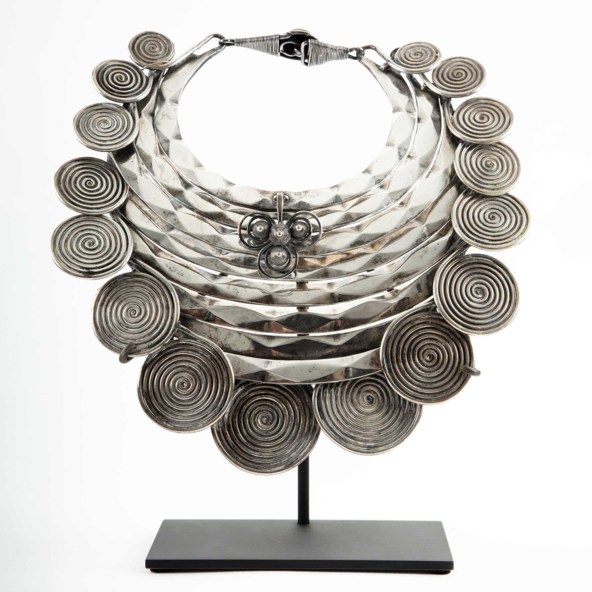 The polished surface, enhances the dimensional play of light across the faceted metal. Displayed on a custom black metal stand, the piece transforms from personal ornament to striking sculptural object, embodying both cultural heritage and contemporary design elegance.