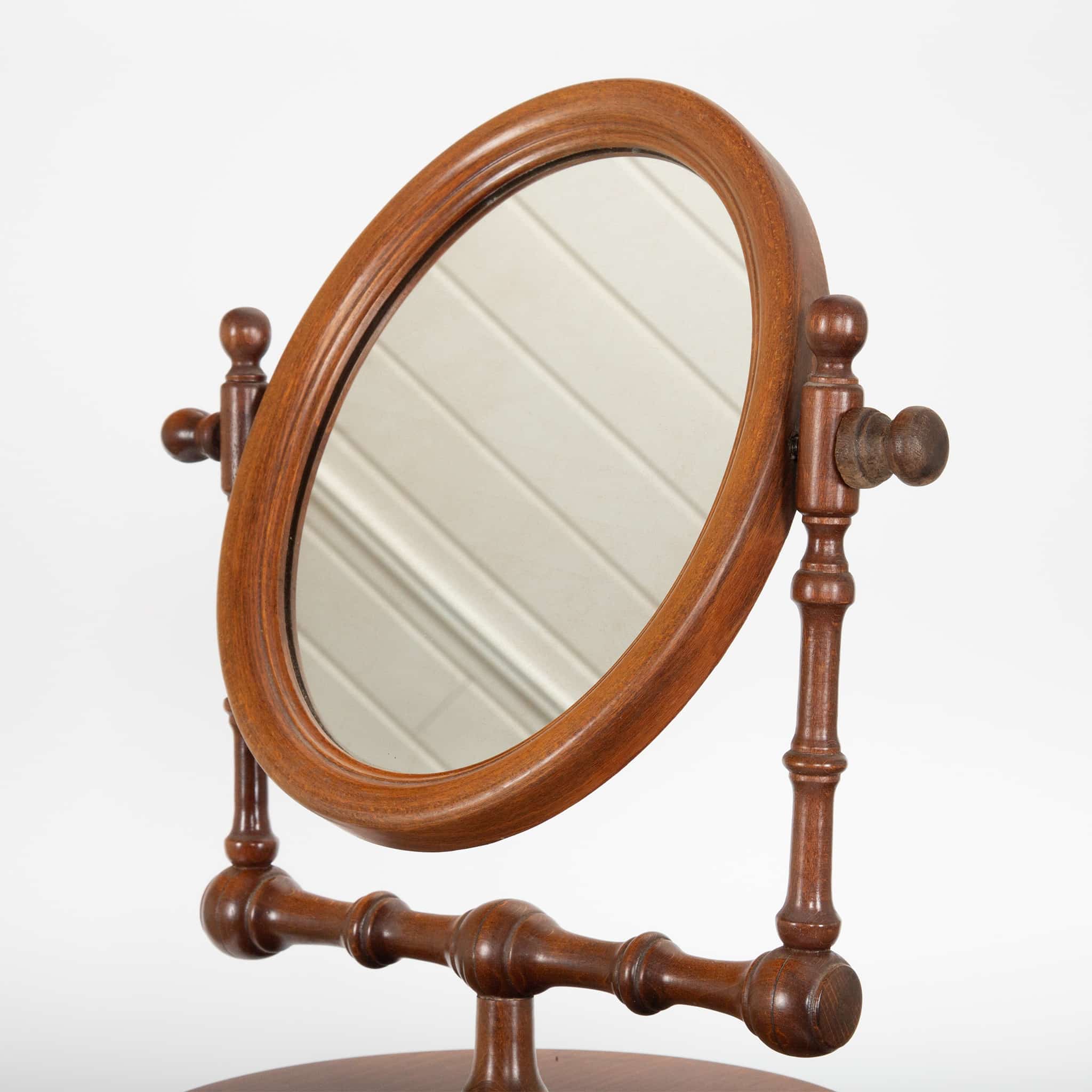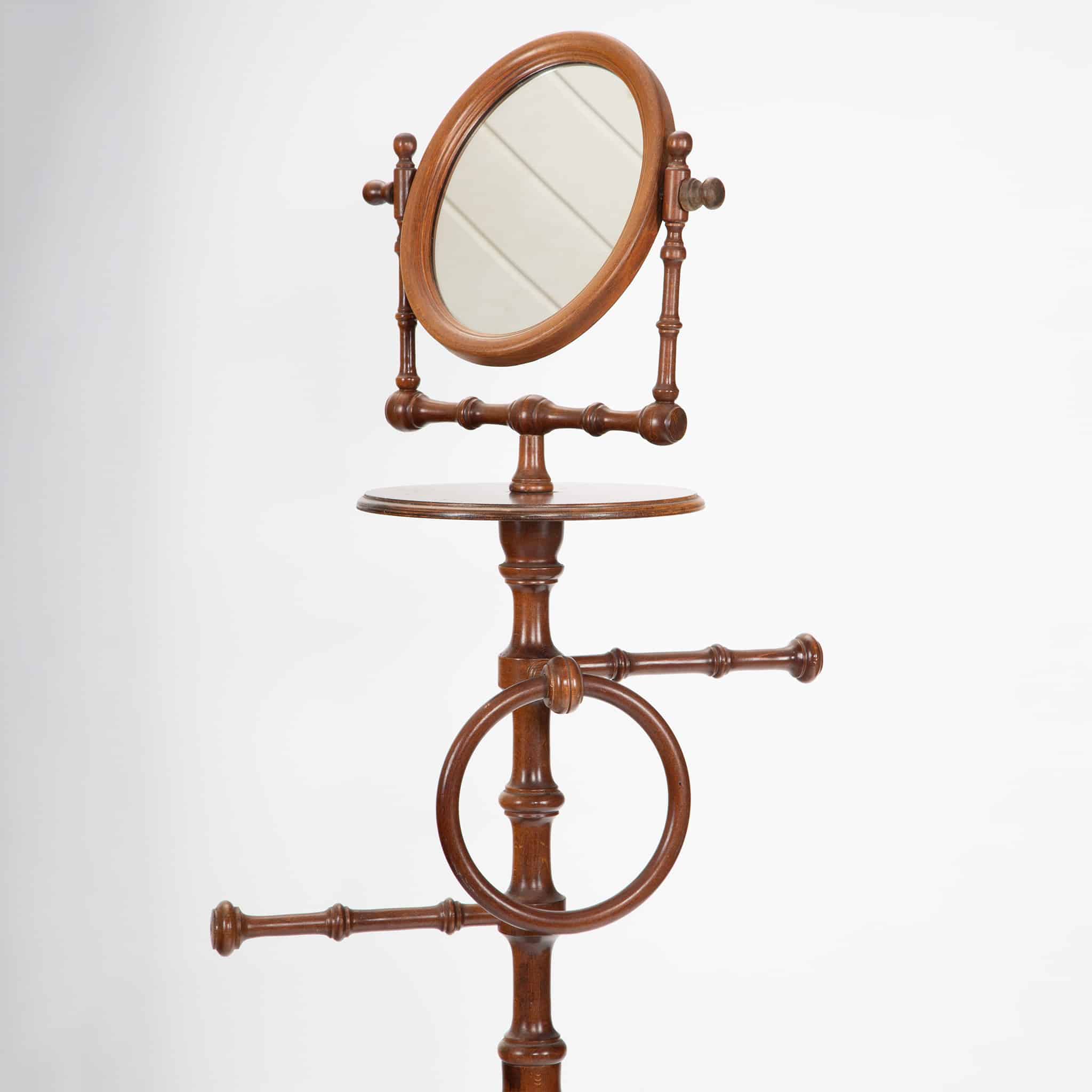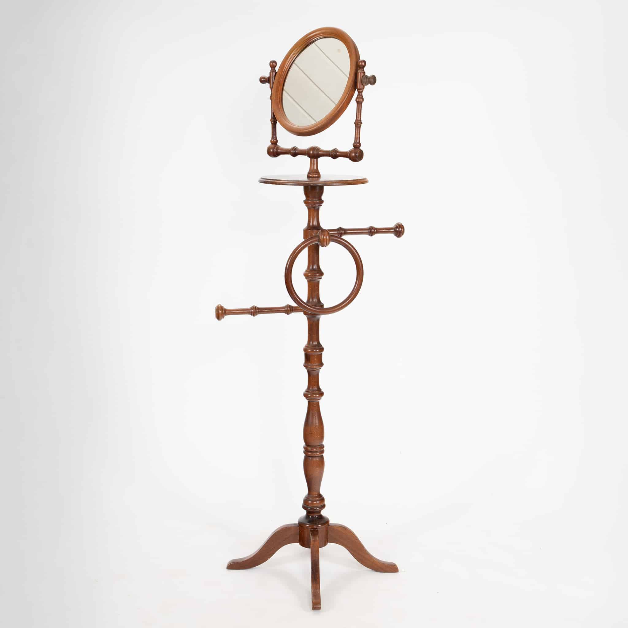 This elegant early 20th-century gentleman’s shaving stand is crafted in turned hardwood, likely walnut or mahogany, and exemplifies refined Edwardian-era personal furniture. The oval tilting mirror is mounted on adjustable supports, allowing for precise positioning, while the central column features a small circular shelf for grooming implements. A shaped towel ring and horizontal bar provide functional convenience, reflecting the stand’s original use in a well-appointed dressing room or bedroom. Raised on a tripod base with gently curved feet, the piece combines practical design with graceful proportions. A fine survivor of early modern domestic furnishings, offering both sculptural presence and historical charm.