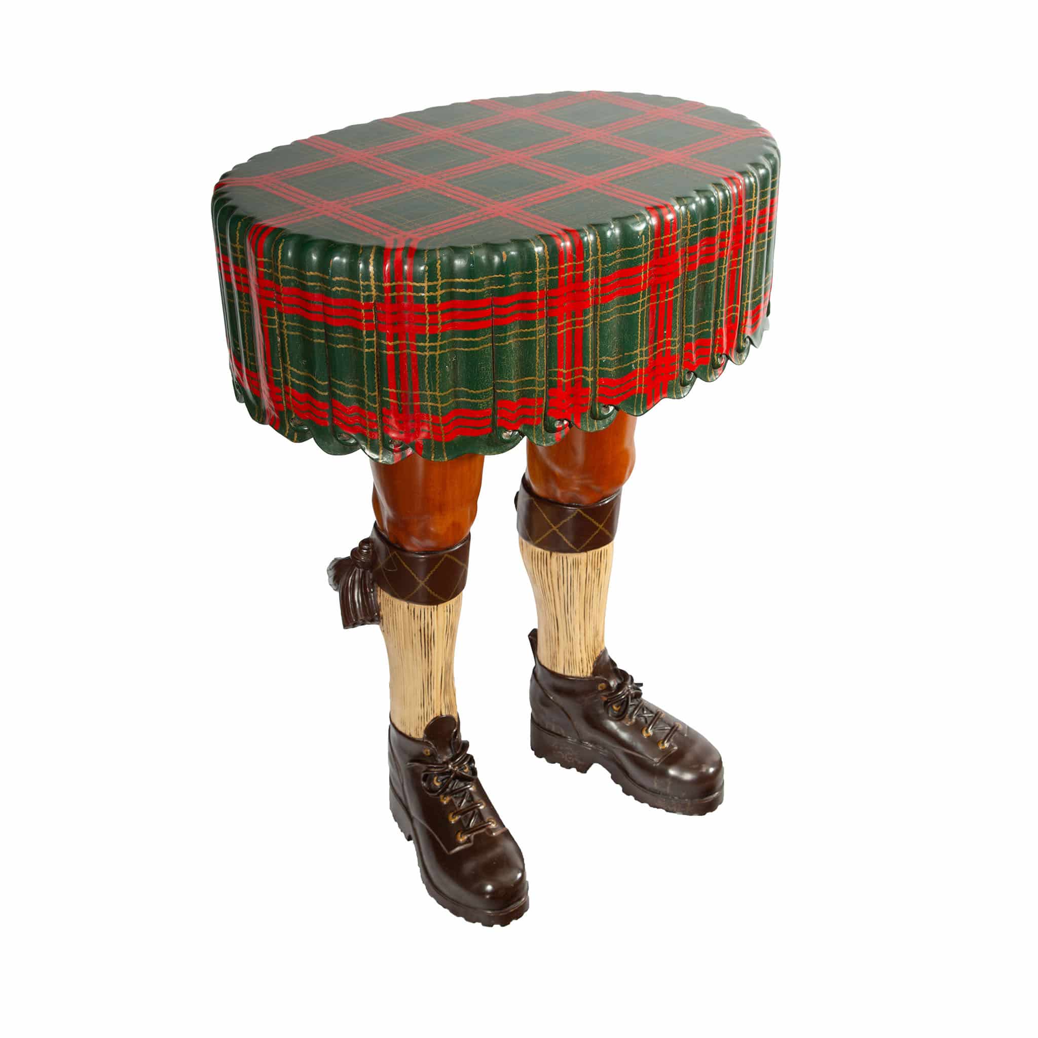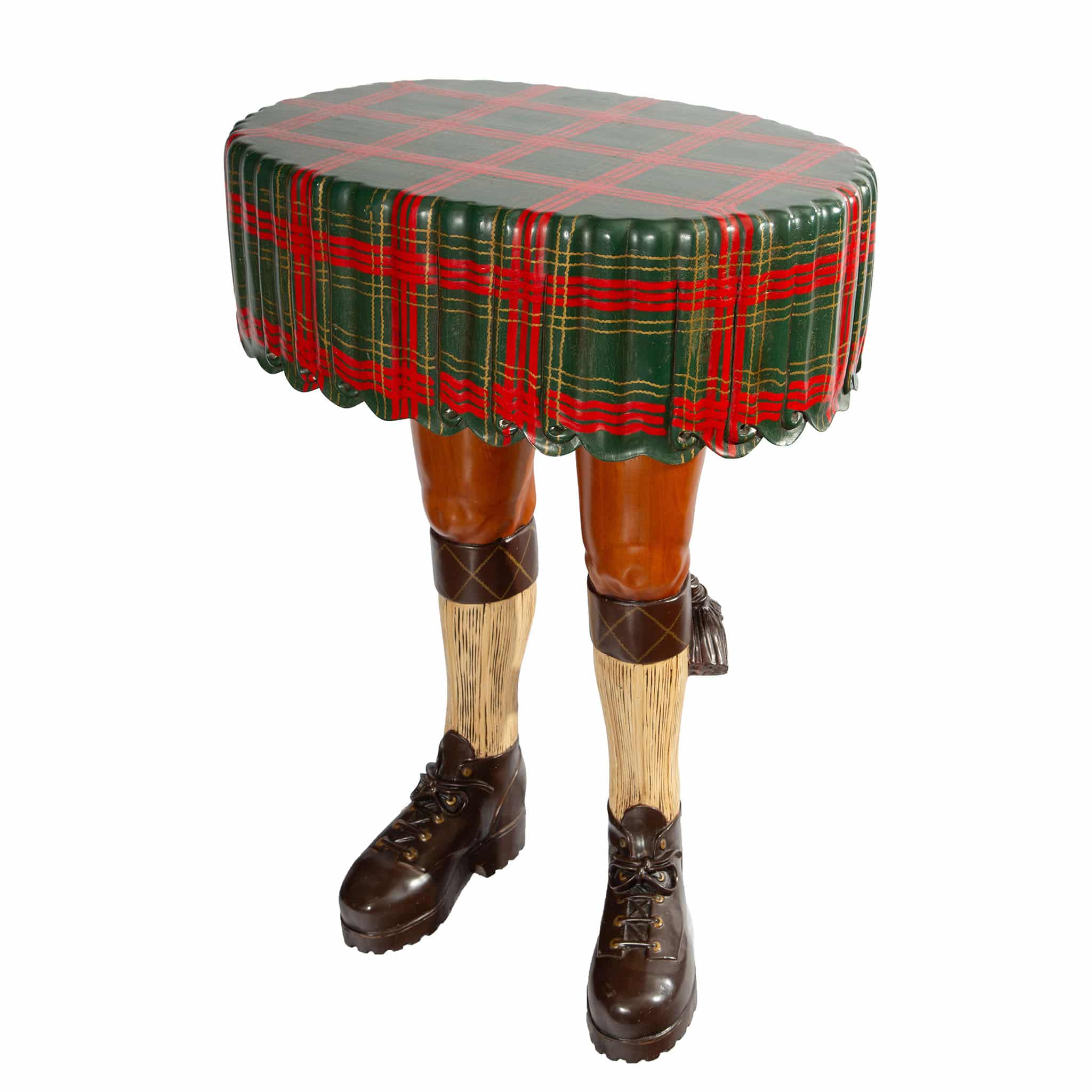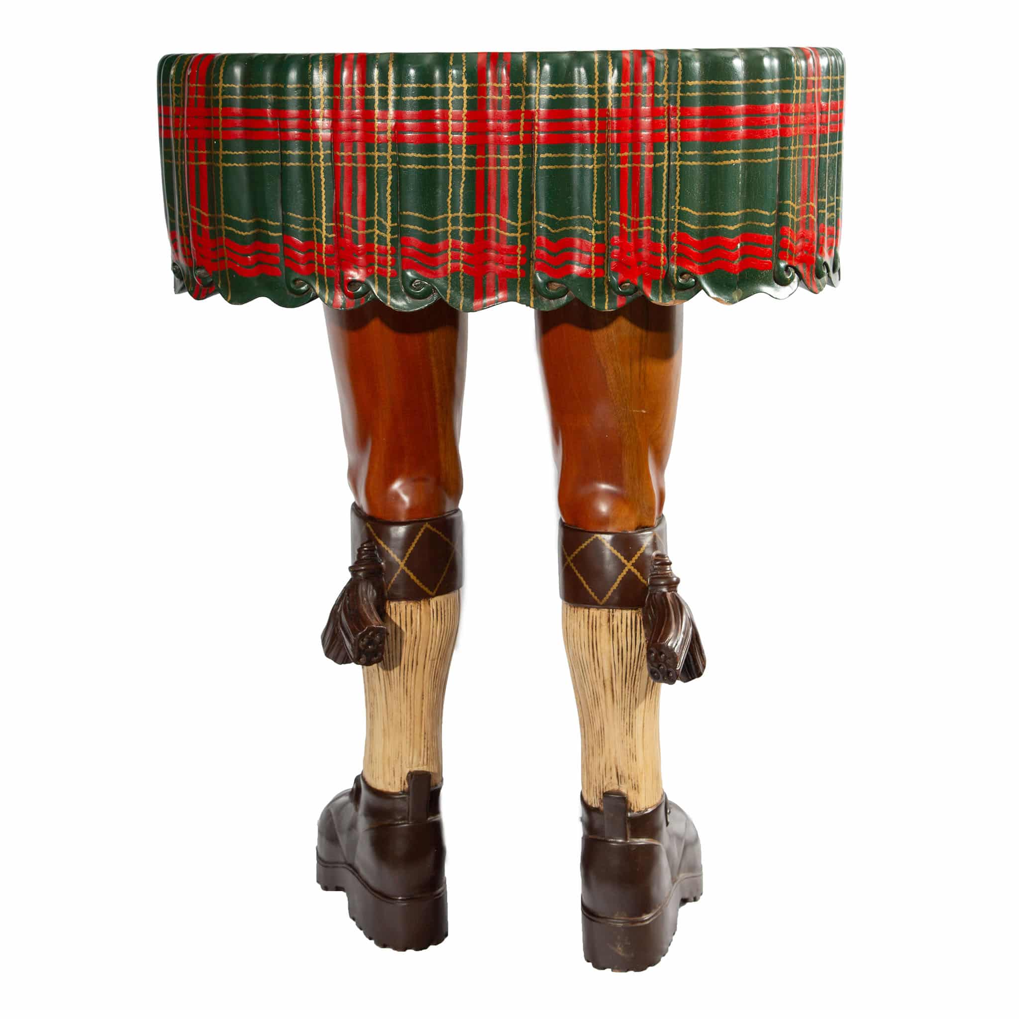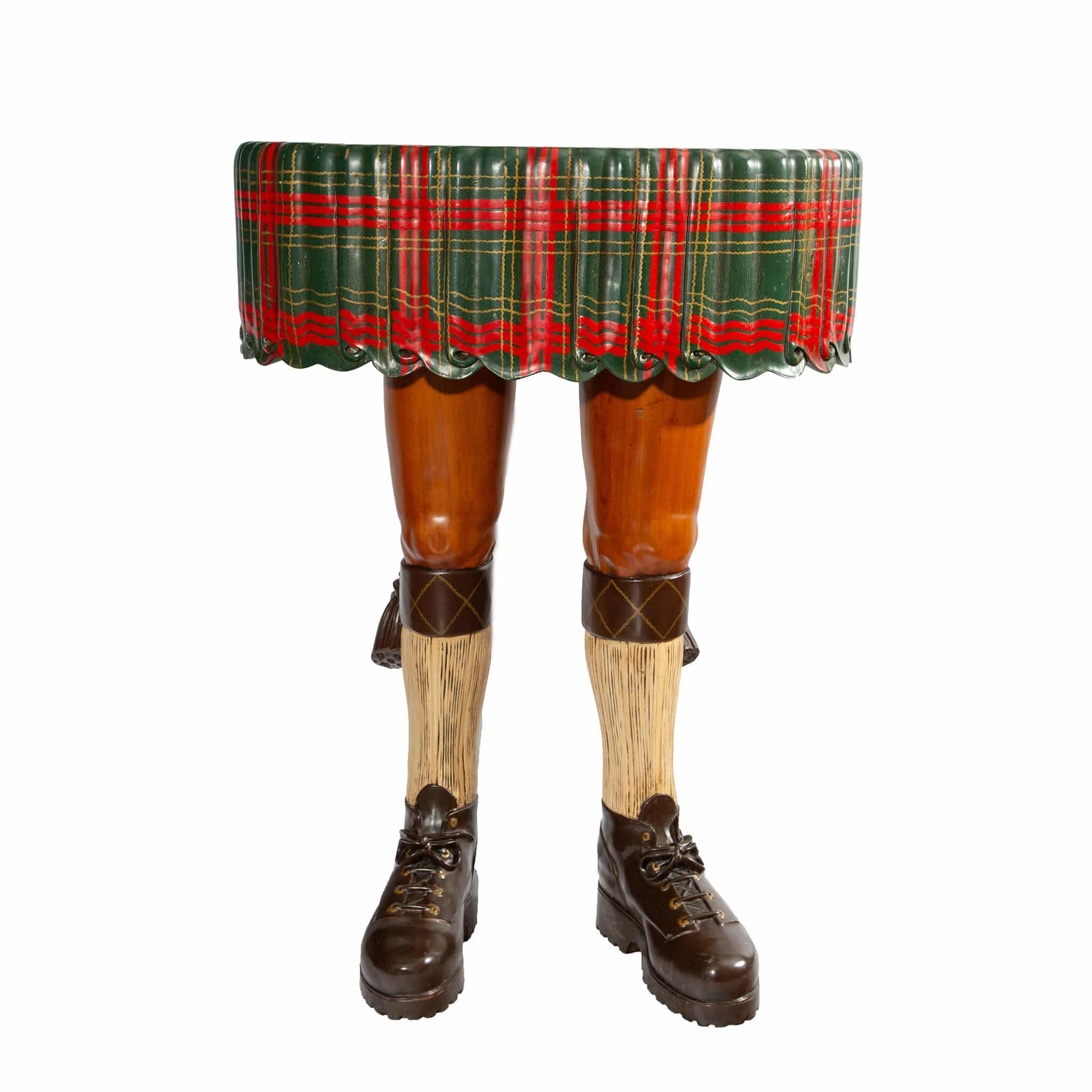 A whimsical mid–20th-century carved and painted wood kilt table—crafted entirely from wood, including the sculpted Highlander legs, traditional ghillie brogues, cream ribbed kilt hose, tasselled garter flashes, and the round tabletop rendered as a draped kilt painted in a bold red-and-green tartan closely resembling Royal Stewart. Richly carved details—from the lace-up ghillie brogues and textured kilt hose to the scalloped, pleated “fabric” of the kilt—give the piece a lively trompe-l’œil presence and an unmistakably cheeky personality. As the old Scottish saying goes, “A man in a kilt is a man and a half,” and this playful sculpture fully embraces that spirit. A standout example of mid-century craftsmanship with humor and charm, it remains in very good condition with light surface wear consistent with age and workmanship.
