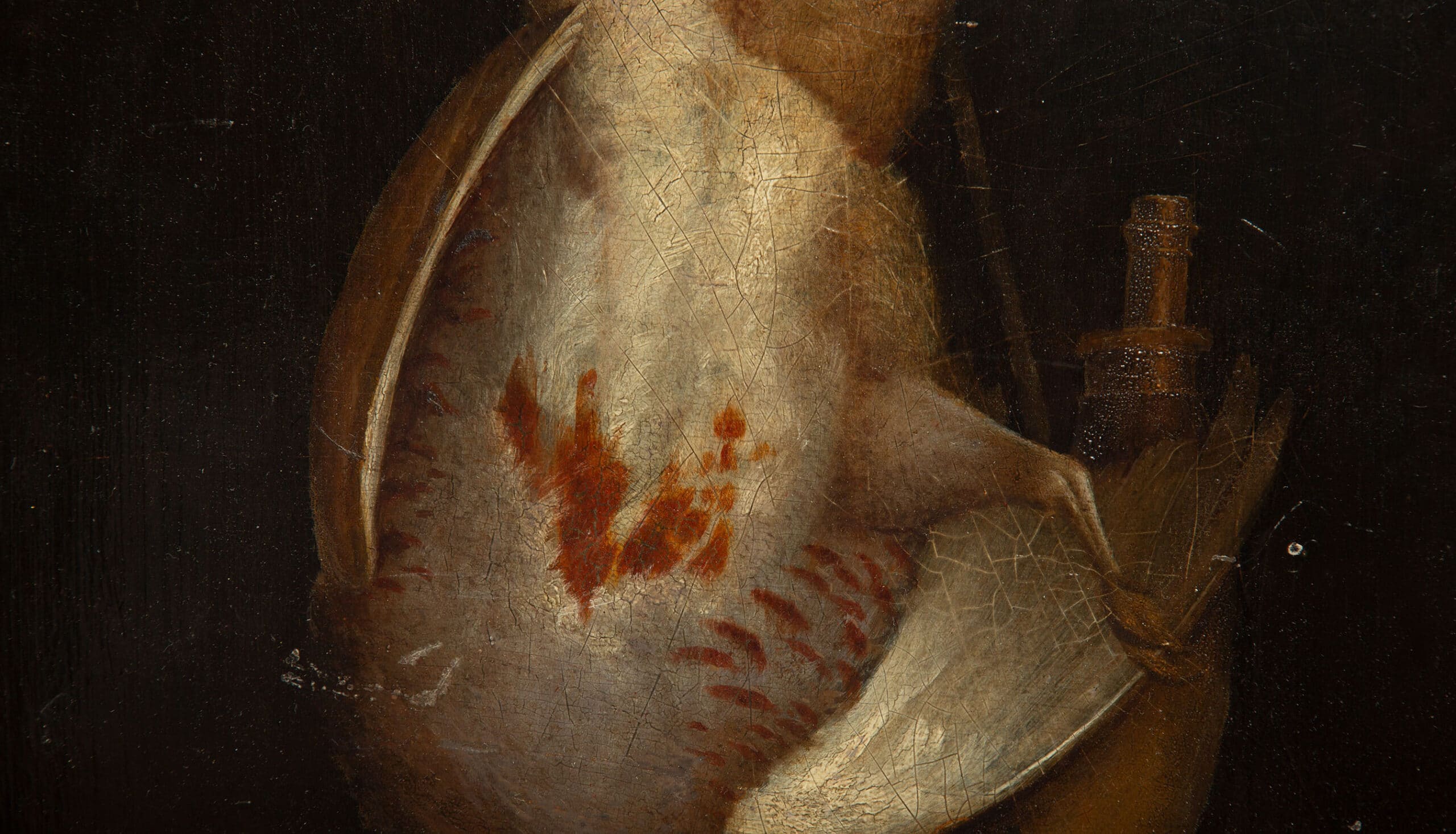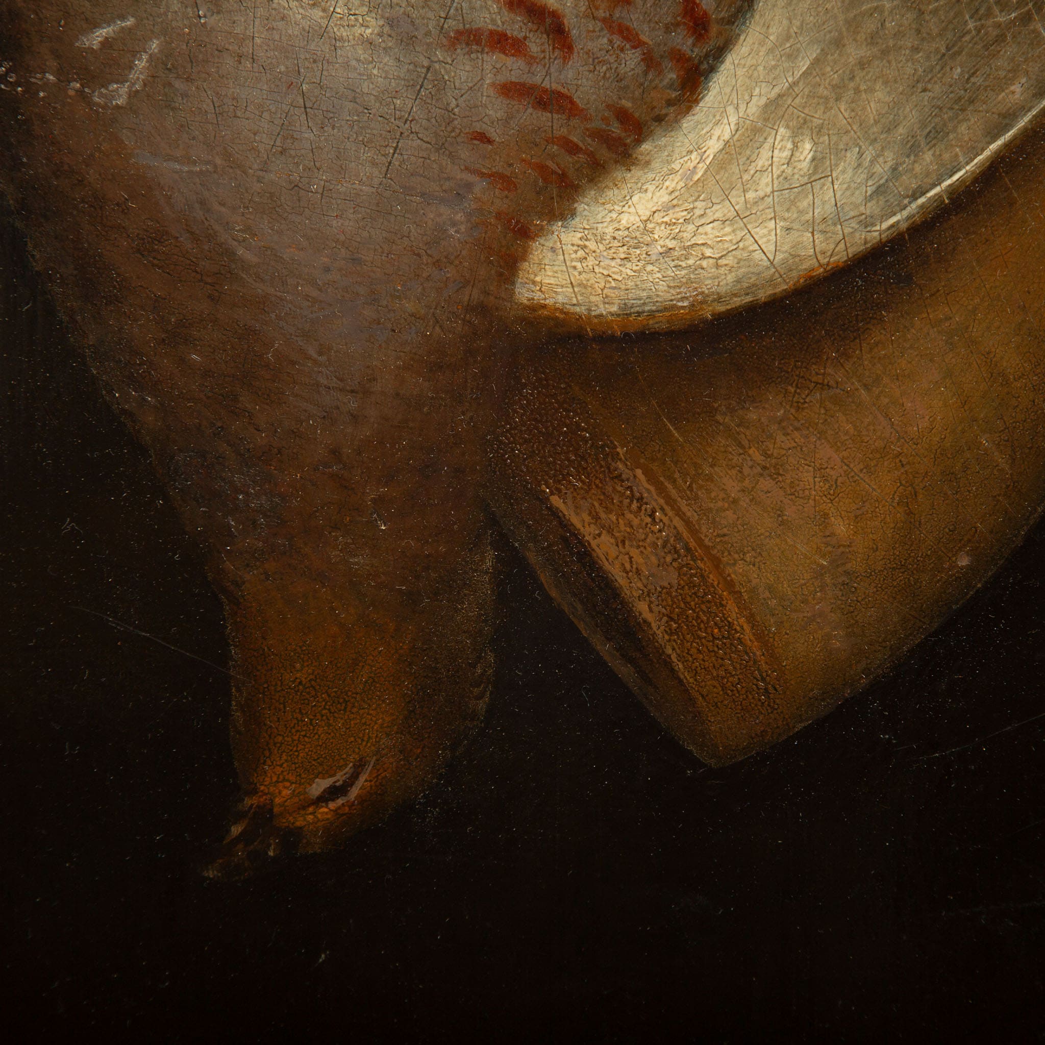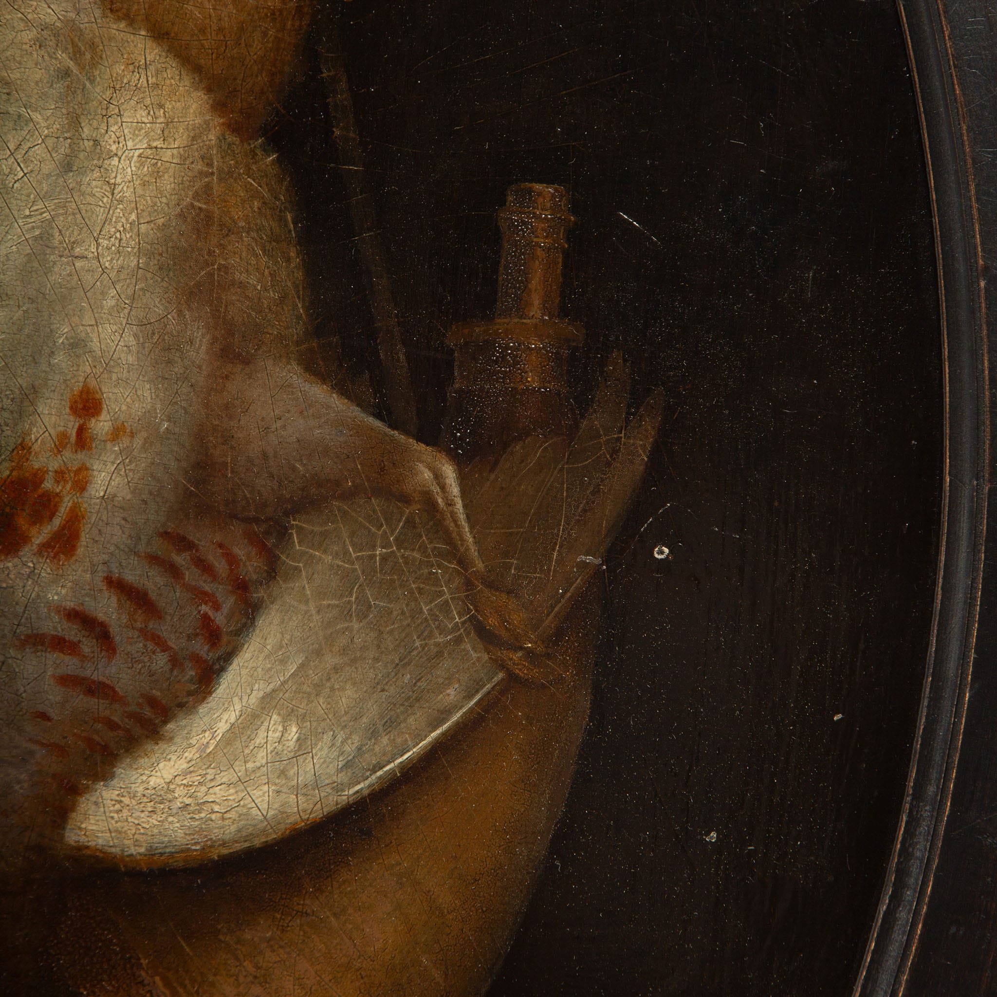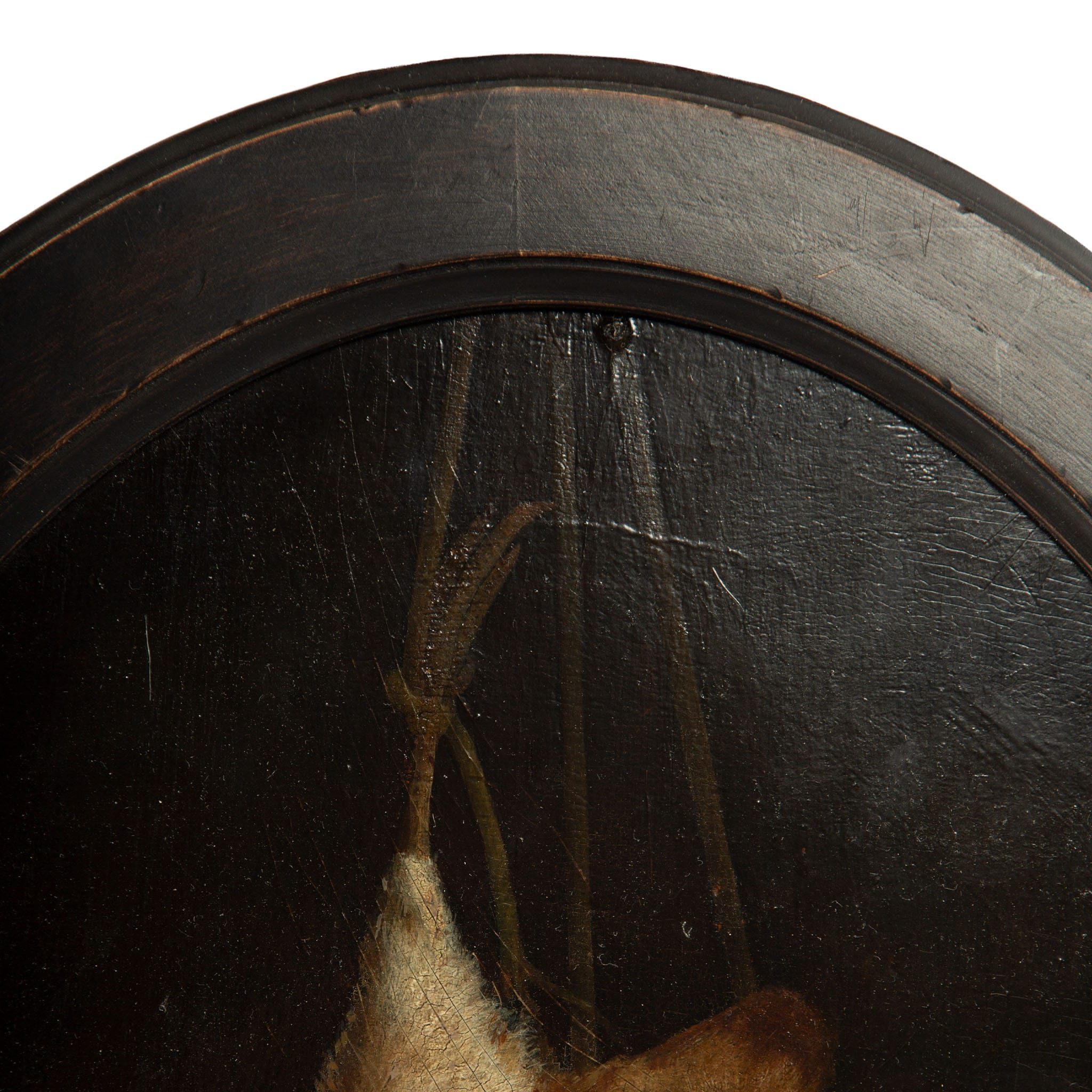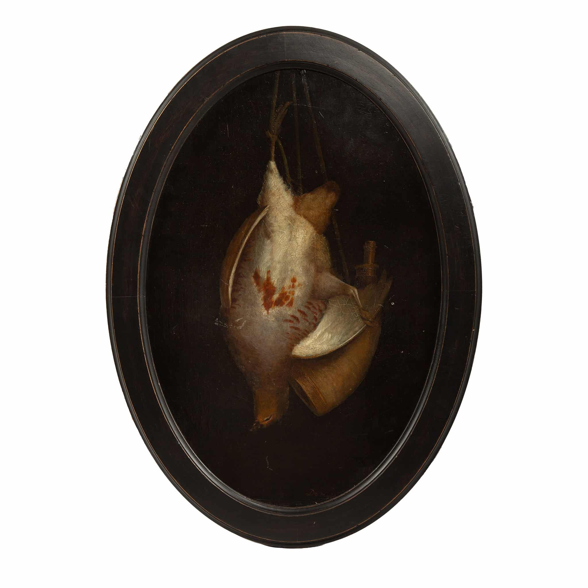 Oil on canvas, presented in an oval frame. This evocative still-life depicts a hanging game bird with wings splayed, suspended against a dark background alongside a flask, a composition that exemplifies the trompe l’œil tradition popular in 19th-century Europe. The subtle use of light and shadow, combined with the detailed rendering of feathers and textures, reflects the enduring influence of 17th-century Dutch and Flemish still-life painters on later French and Italian artists. The craquelure visible across the surface is consistent with age, and the work retains its original period frame. Such pieces were often attributed to followers of Jean-Baptiste Oudry and the French realist tradition, though this example is unsigned.