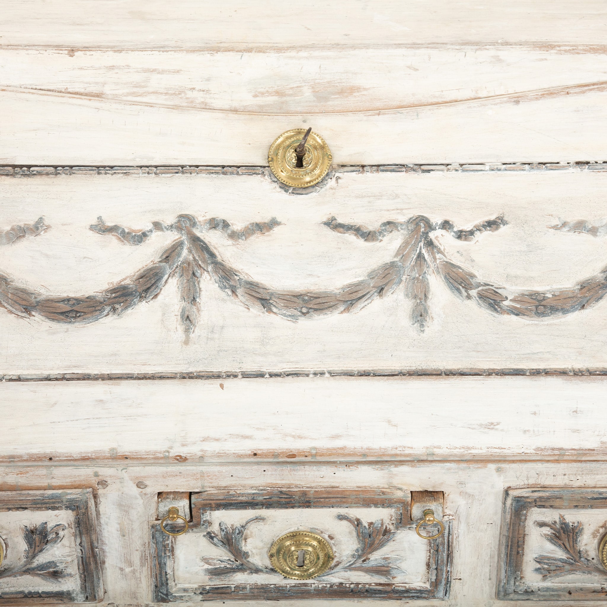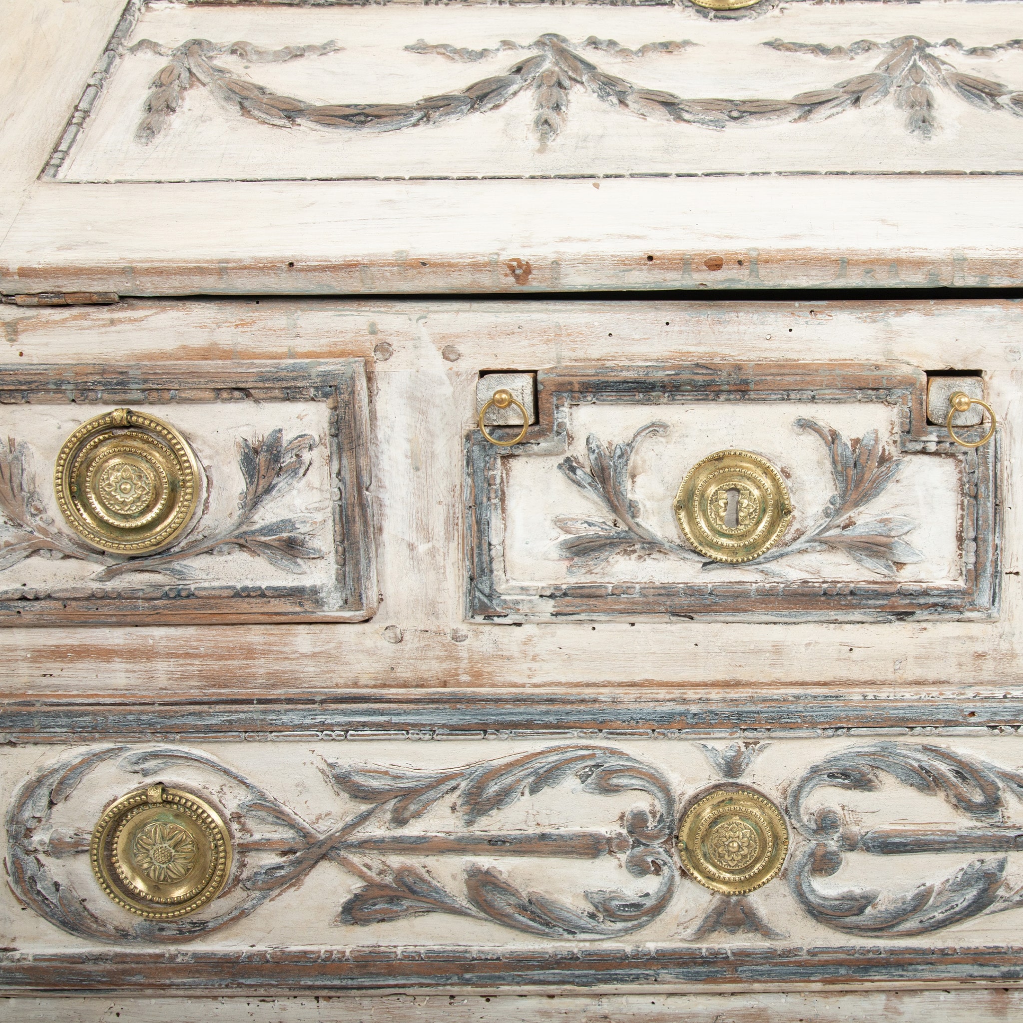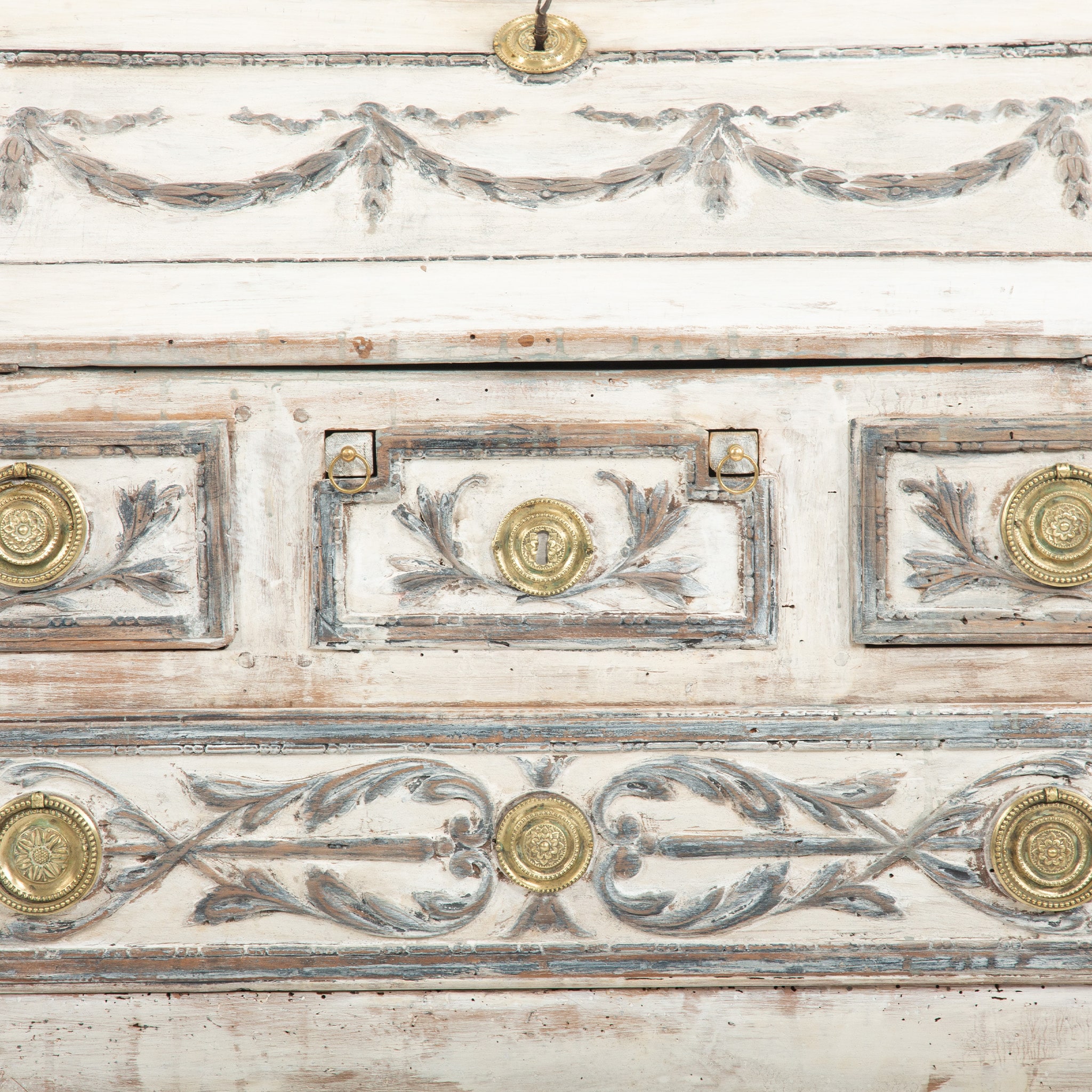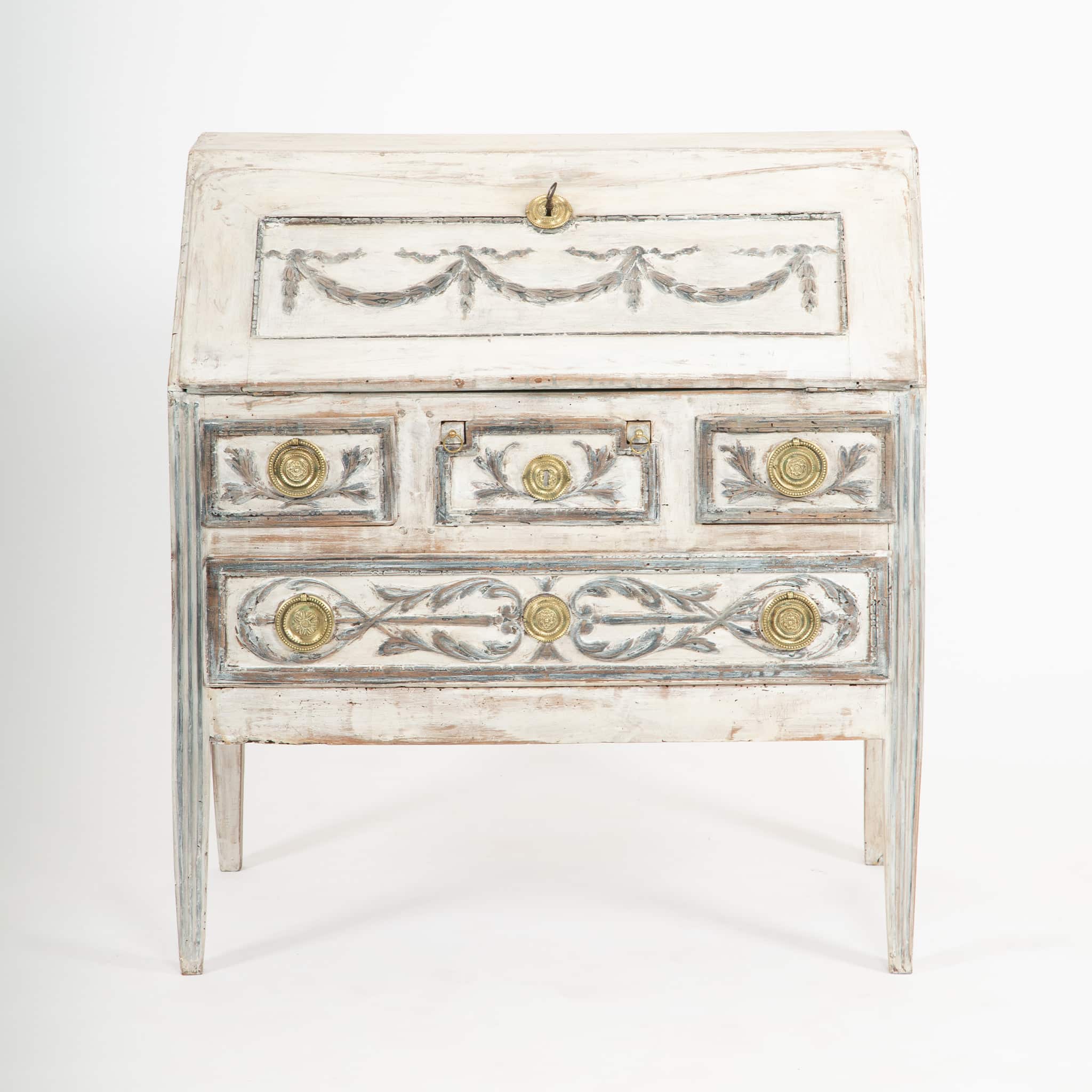An elegant and finely proportioned 18th-century French slant-top desk, constructed in hardwood with white and grey polychrome decoration. The façade is articulated with delicately carved drawer fronts highlighted by classical foliate motifs, while the slanted writing surface is adorned with painted garlands, reflecting the refined neoclassical taste of the Louis XVI period. Gilt-bronze hardware—including pulls, escutcheons, and lift—adds a warm contrast to the softly aged painted surface.
