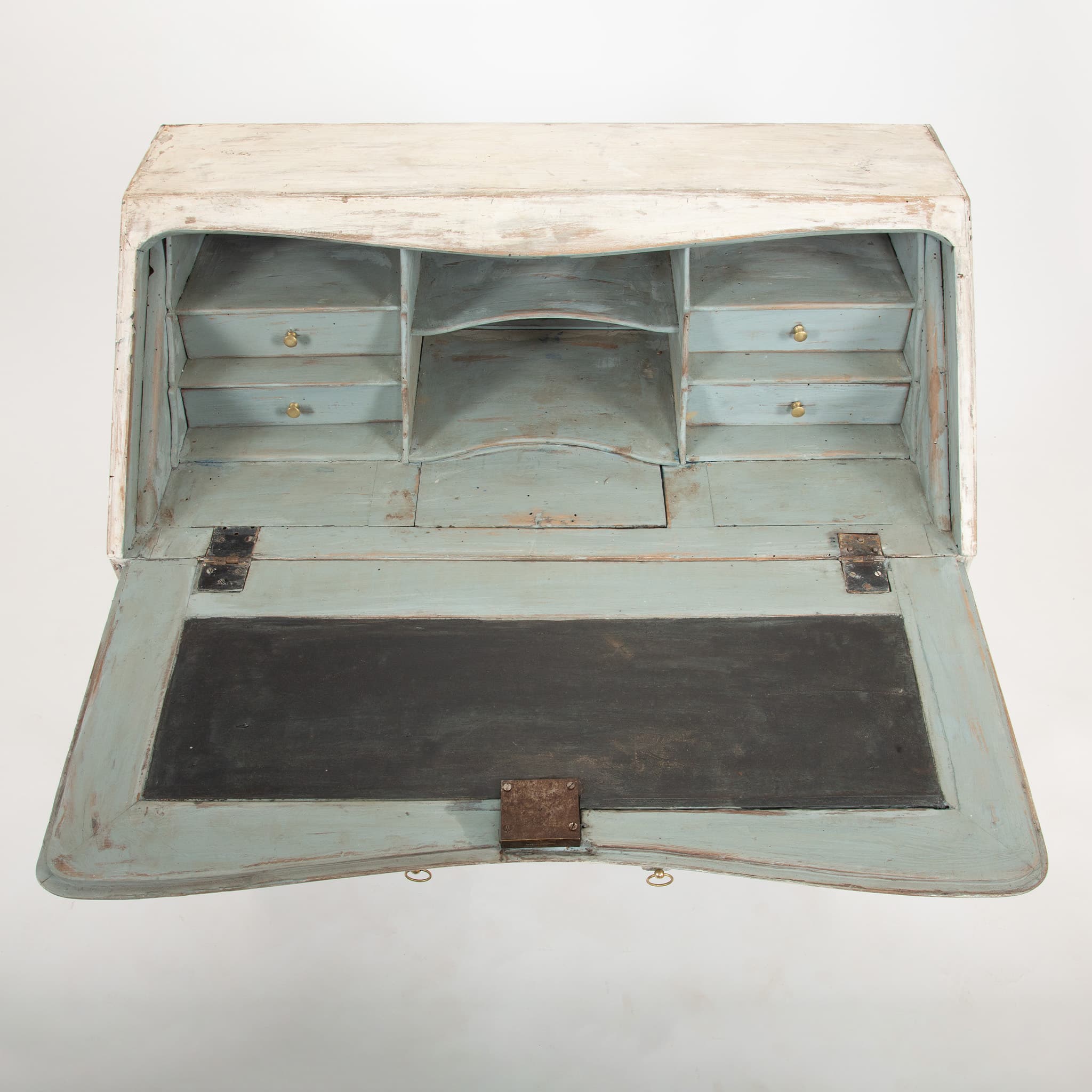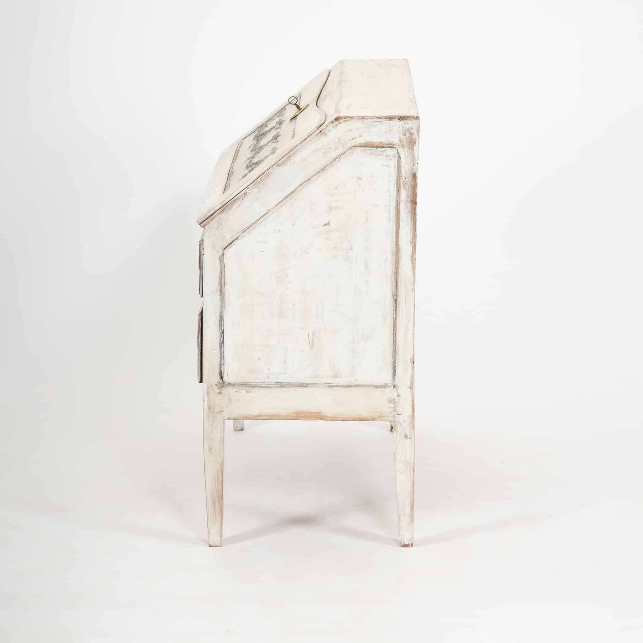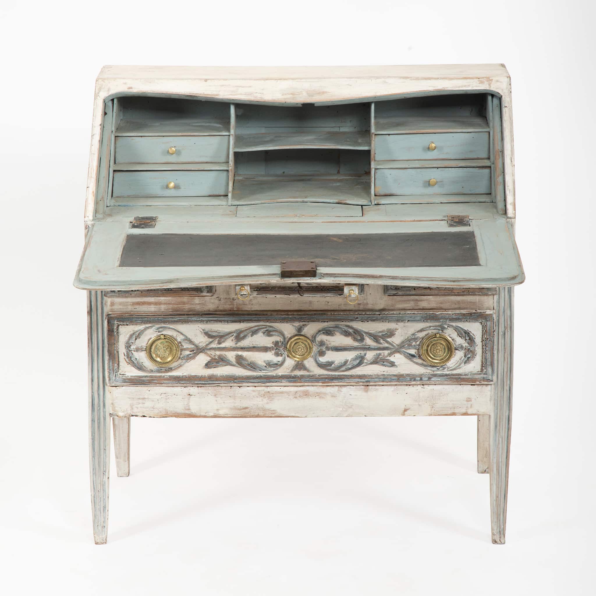 The fall-front opens to reveal a thoughtfully arranged interior fitted with small drawers and pigeonholes, originally intended for correspondence, documents, and personal effects. Slant-top desks of this type were prized for their compact footprint and practical elegance, making them suitable for both private apartments and formal interiors. Both decorative and functional, this desk serves beautifully as a writing table, console, or accent piece. Its restrained palette, classical ornamentation, and intact period details make it a refined example of French painted furniture from the late 18th century.