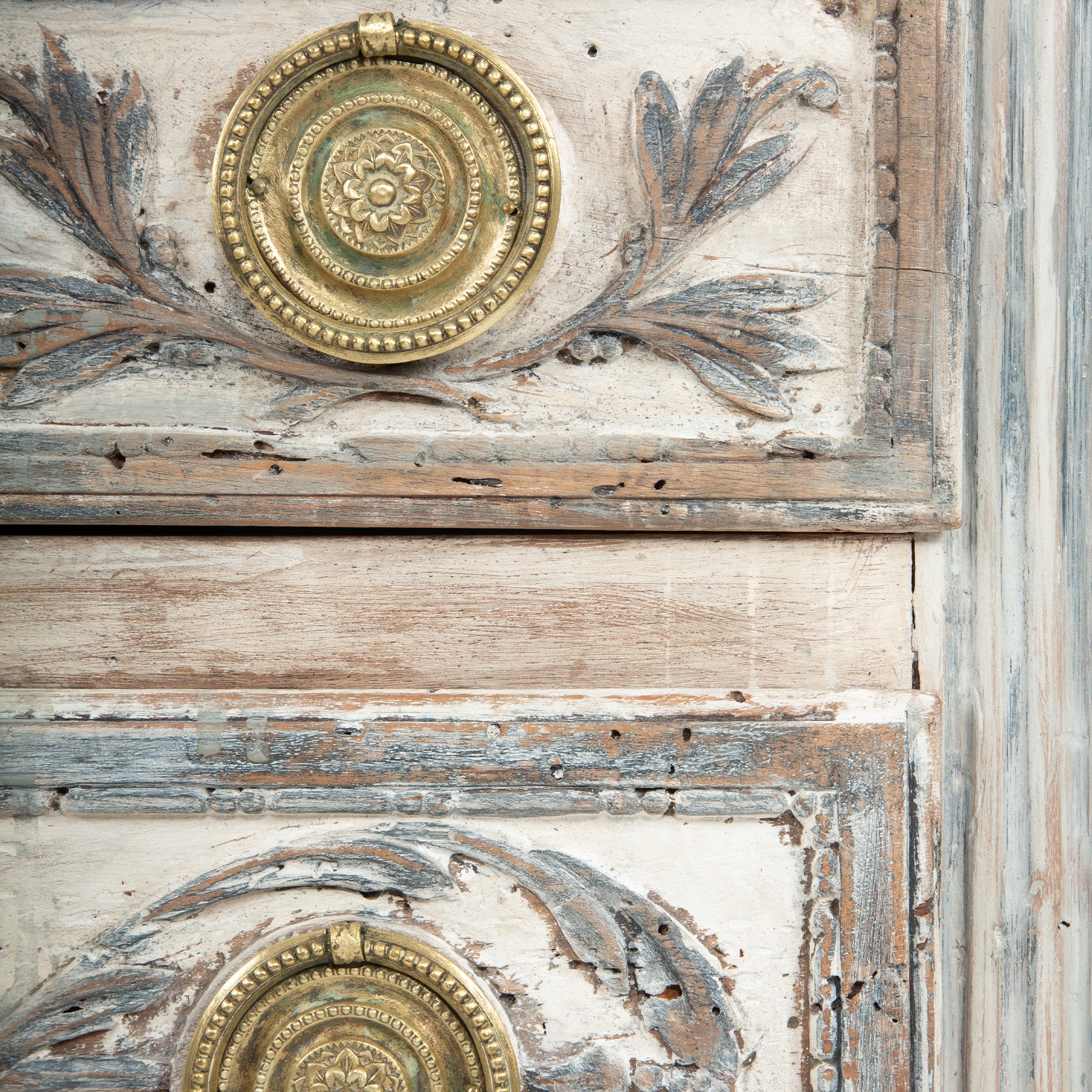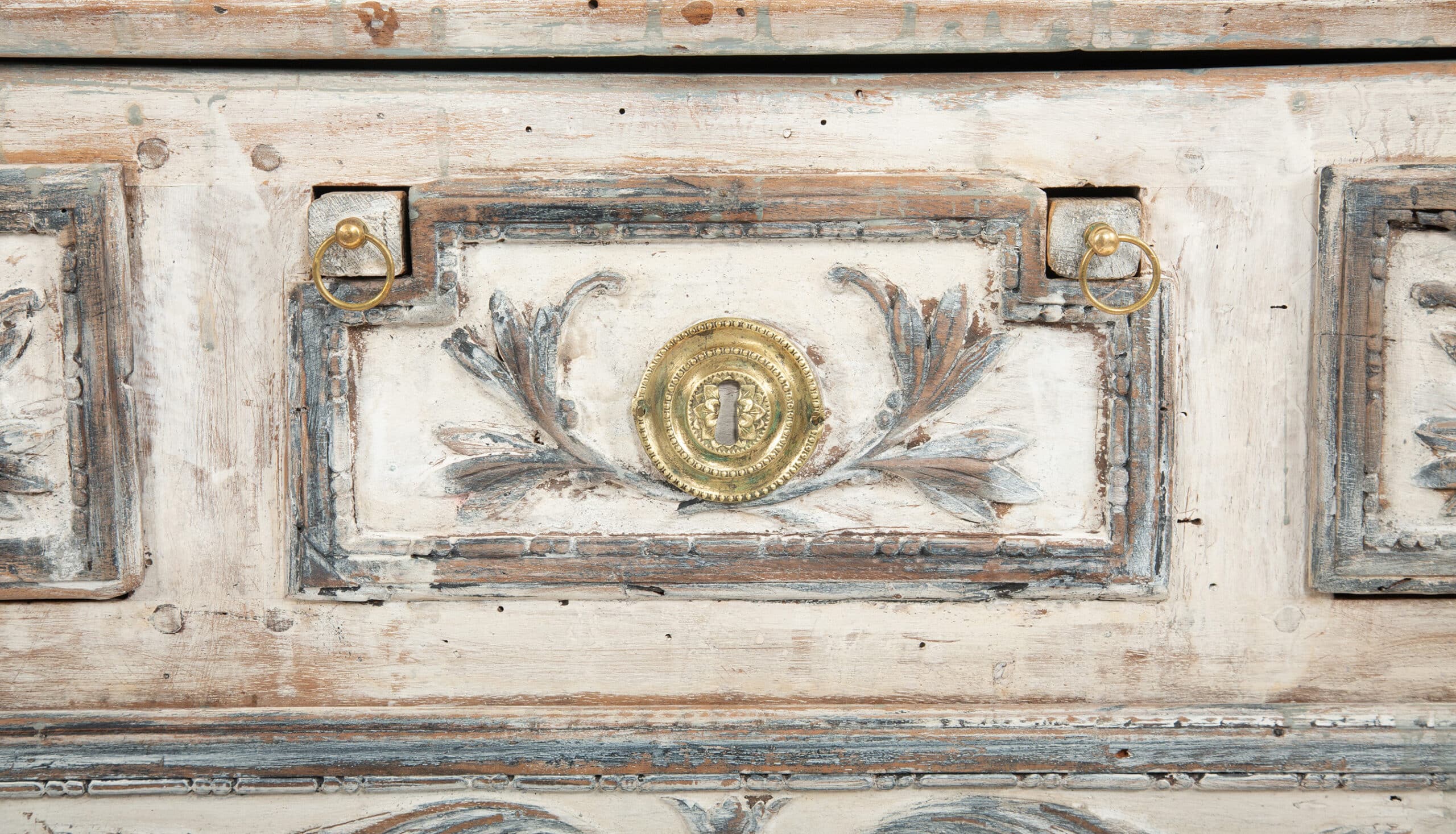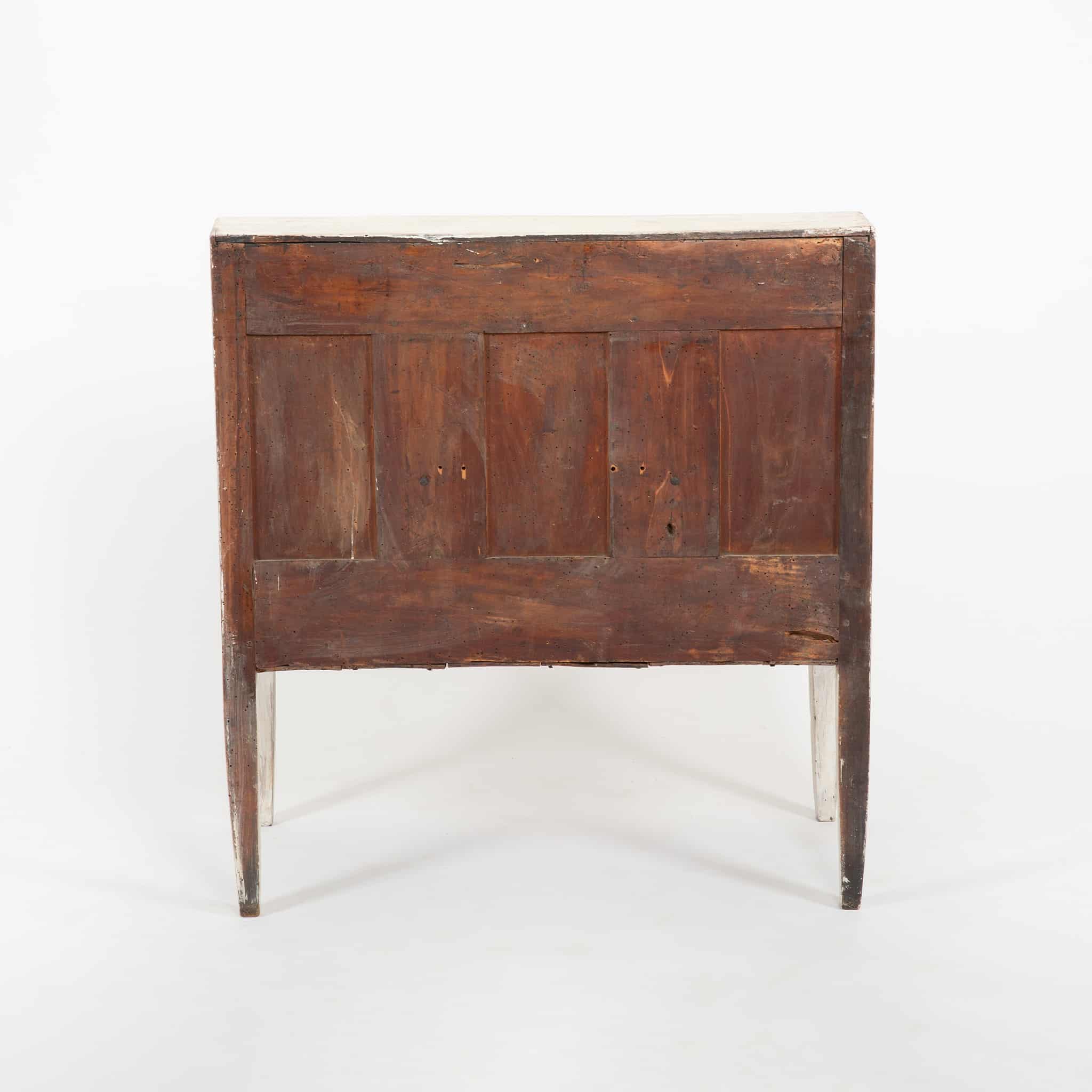 The fall-front opens to reveal a thoughtfully arranged interior fitted with small drawers and pigeonholes, originally intended for correspondence, documents, and personal effects. Slant-top desks of this type were prized for their compact footprint and practical elegance, making them suitable for both private apartments and formal interiors. Both decorative and functional, this desk serves beautifully as a writing table, console, or accent piece. Its restrained palette, classical ornamentation, and intact period details make it a refined example of French painted furniture from the late 18th century.