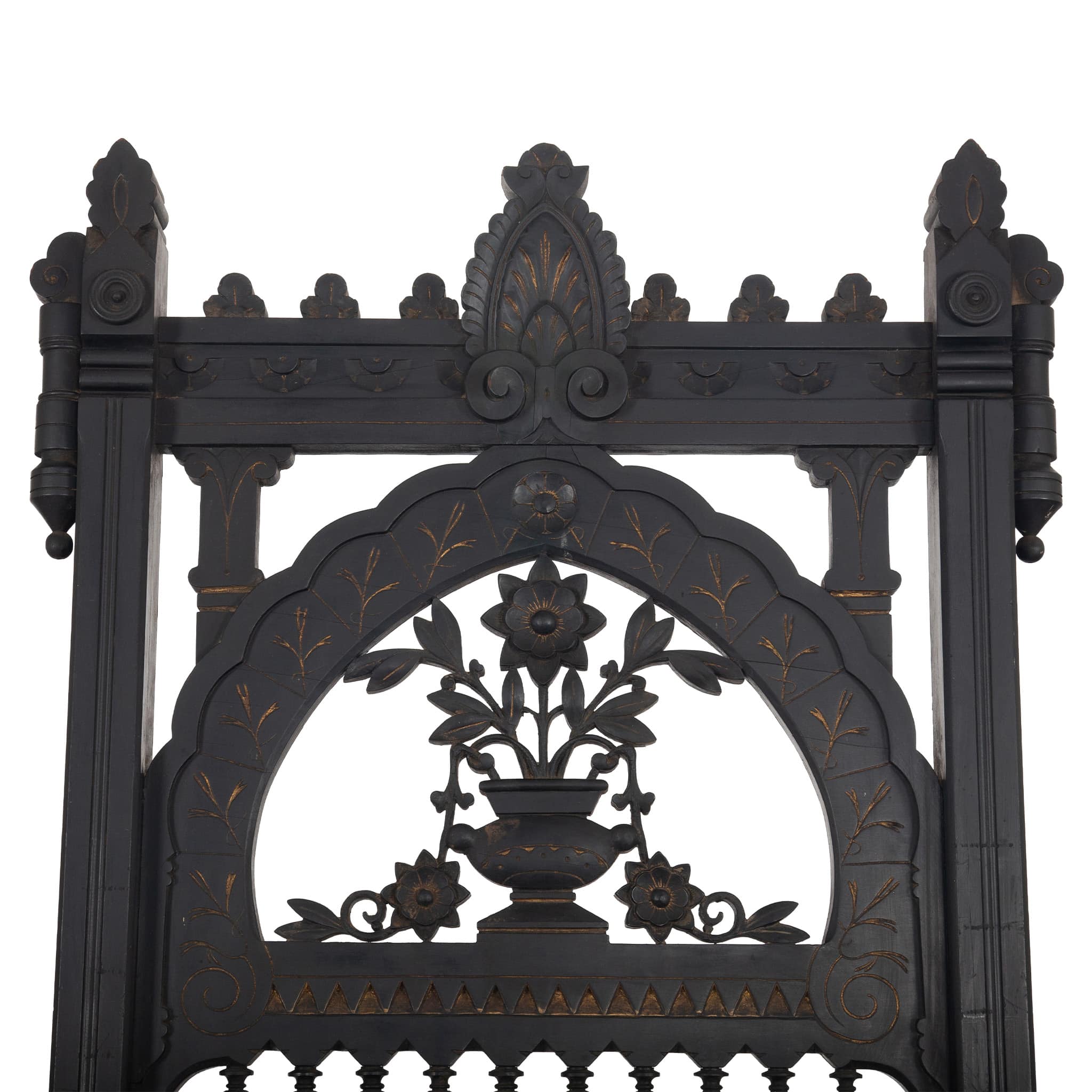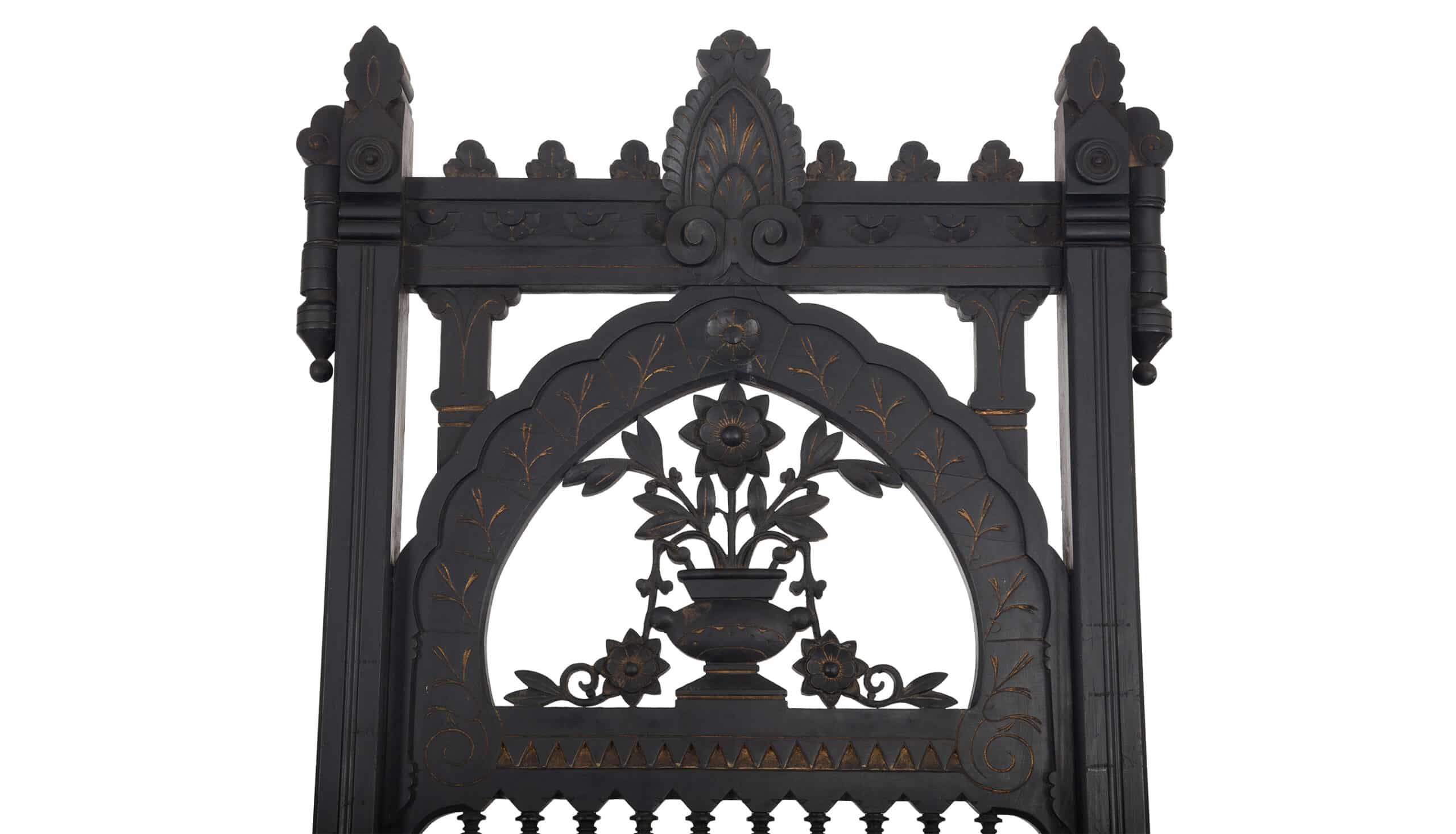 Ebonized wood with carved and gilt-highlighted decoration.