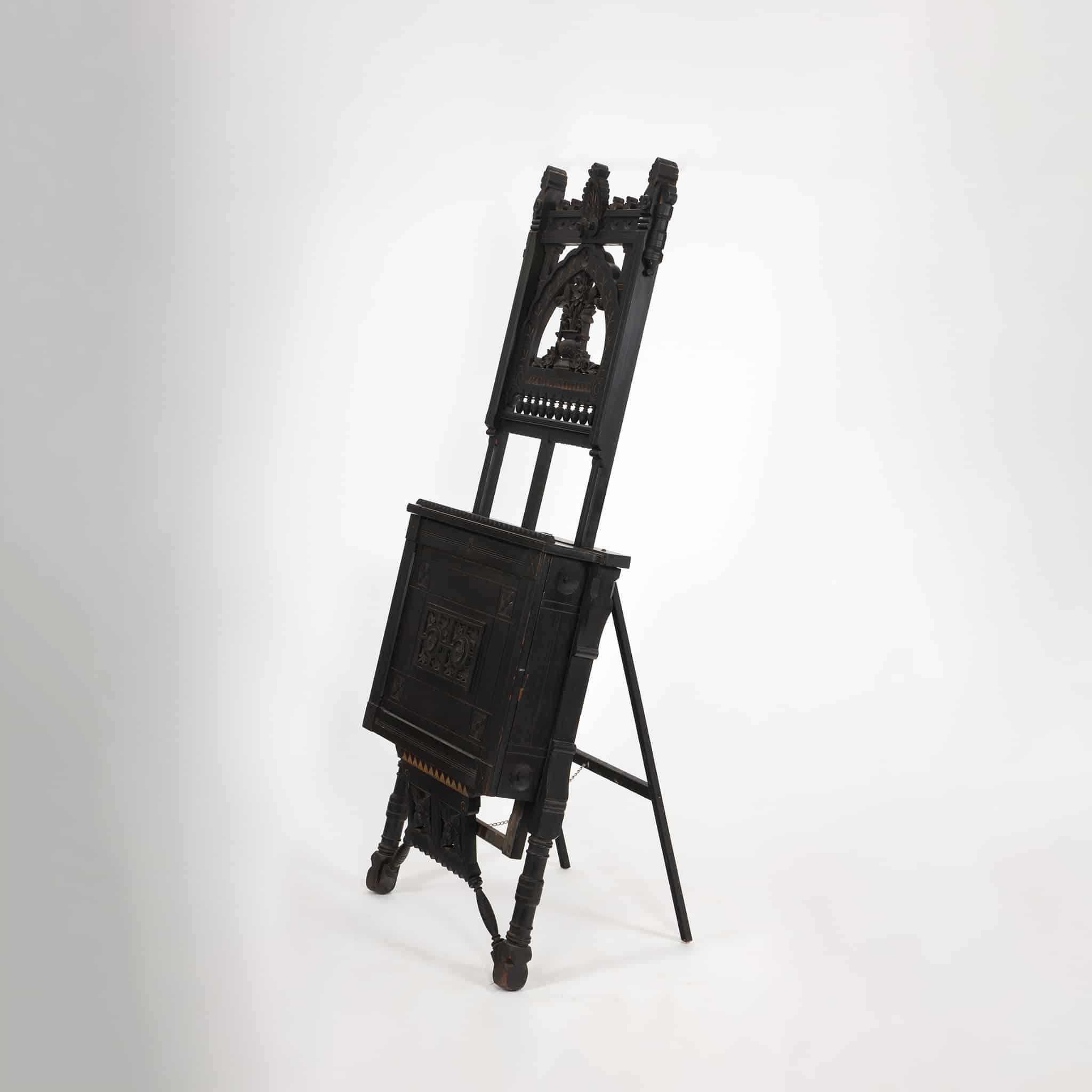 This striking 19th-century easel is finely crafted from ebonized wood and incorporates an integrated portfolio compartment, an elegant and highly seeable feature designed to store drawings, prints, or canvases. The tall back crest is richly carved with stylized foliate and floral motifs arranged beneath a Gothic-inspired arch, subtly heightened with traces of gilt, lending both sculptural presence and decorative refinement.