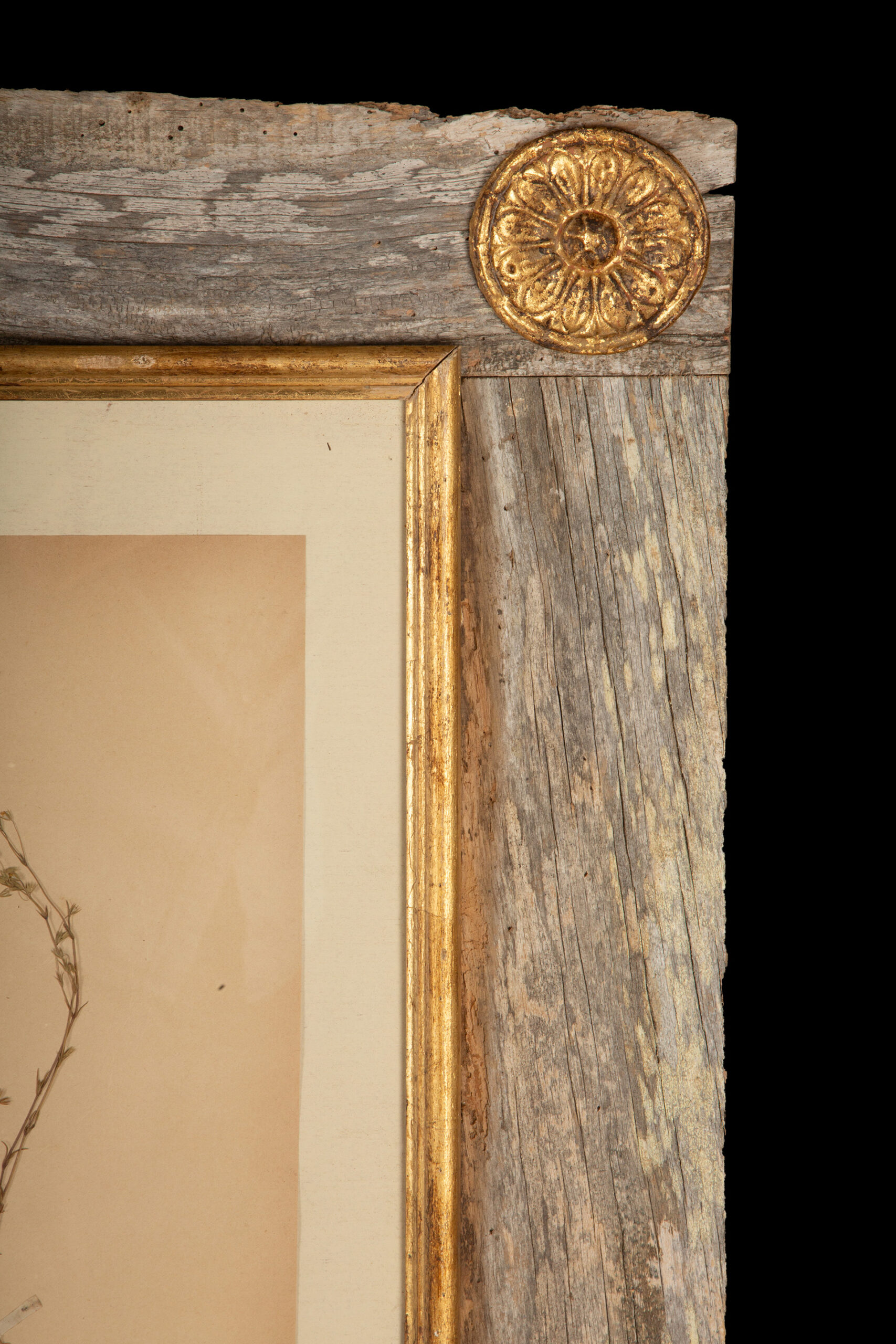Framed Collection of Four Herbier Specimens in Rustic Barn Wood w/ Gilt Rosettes