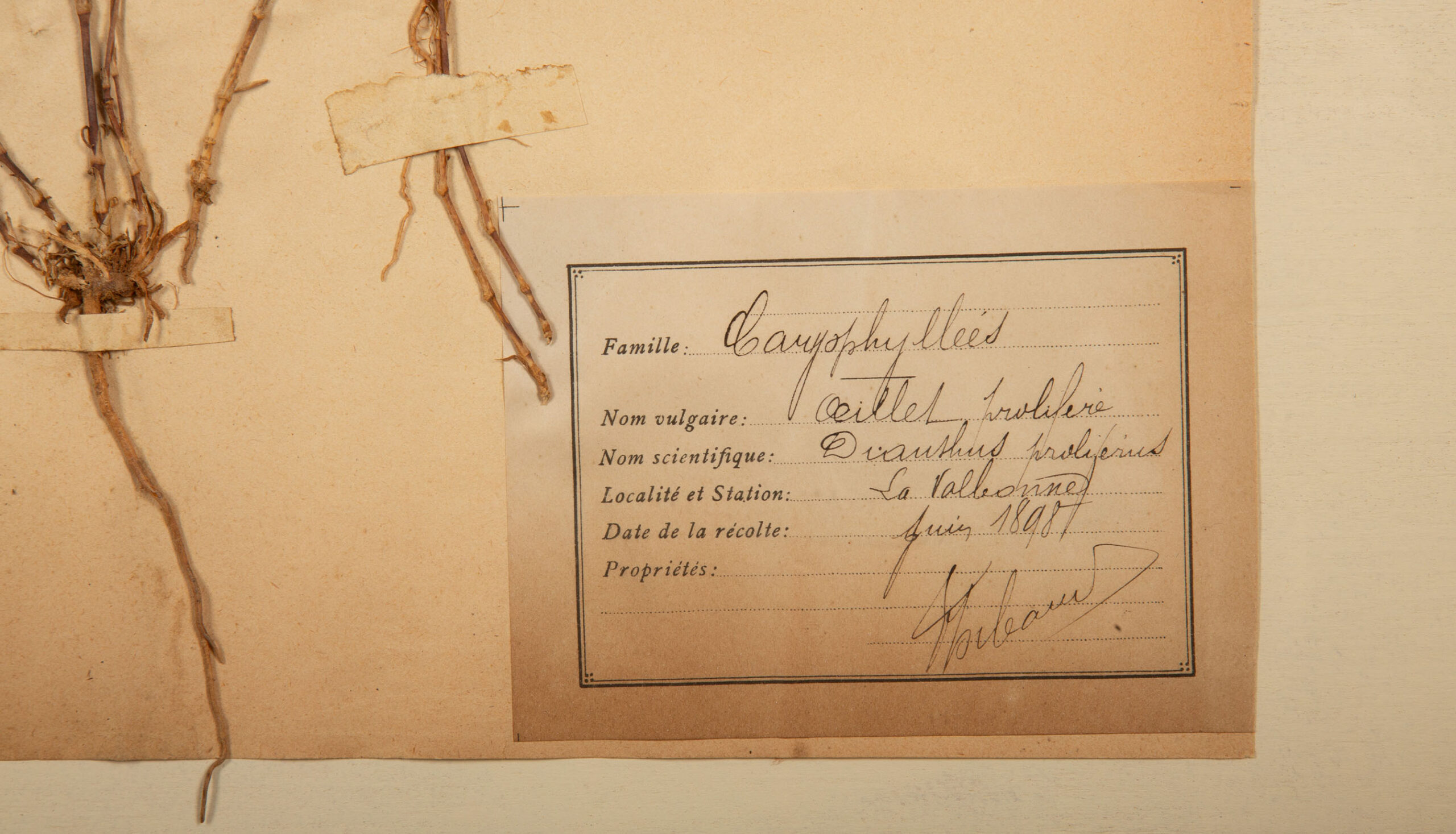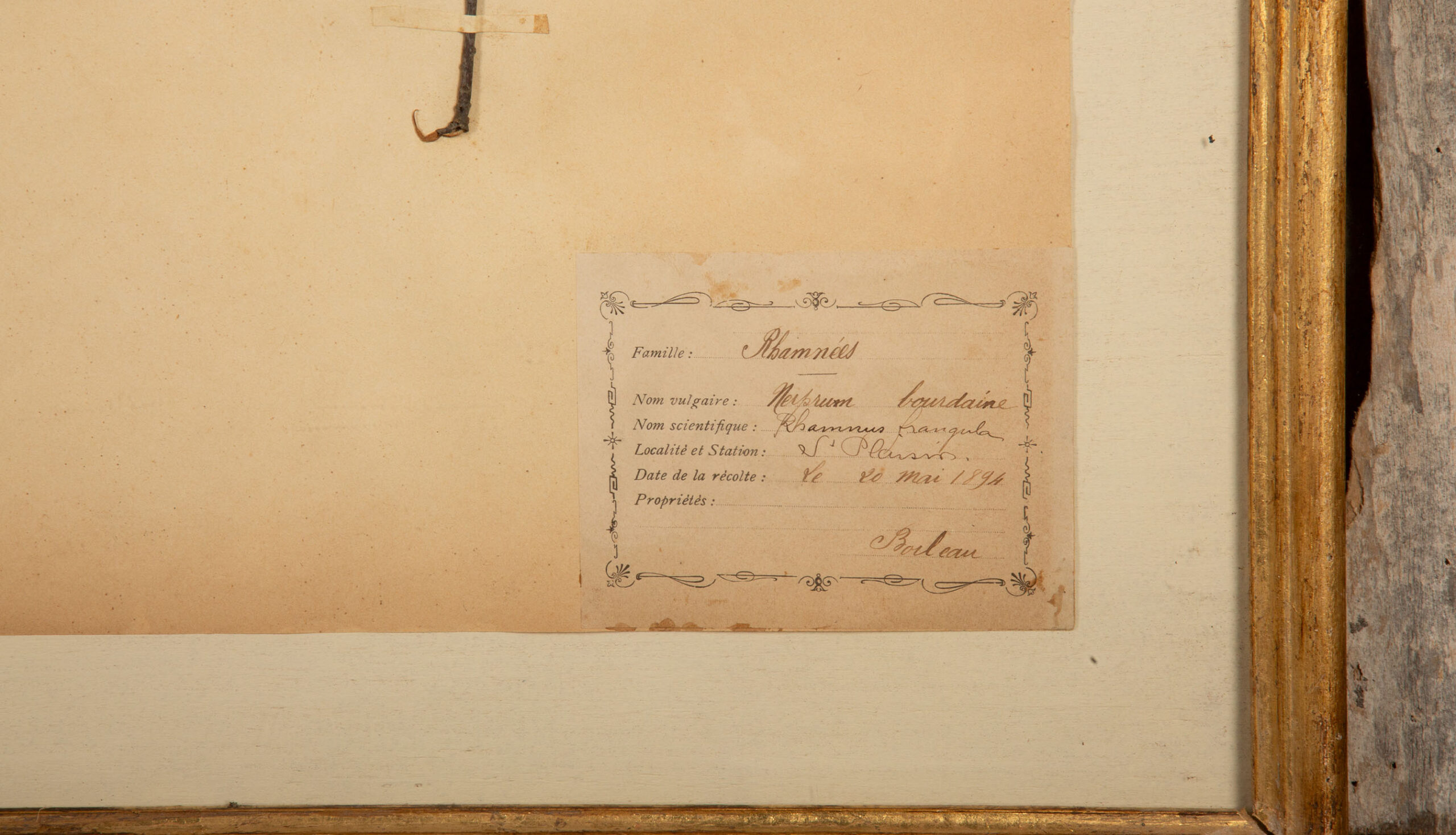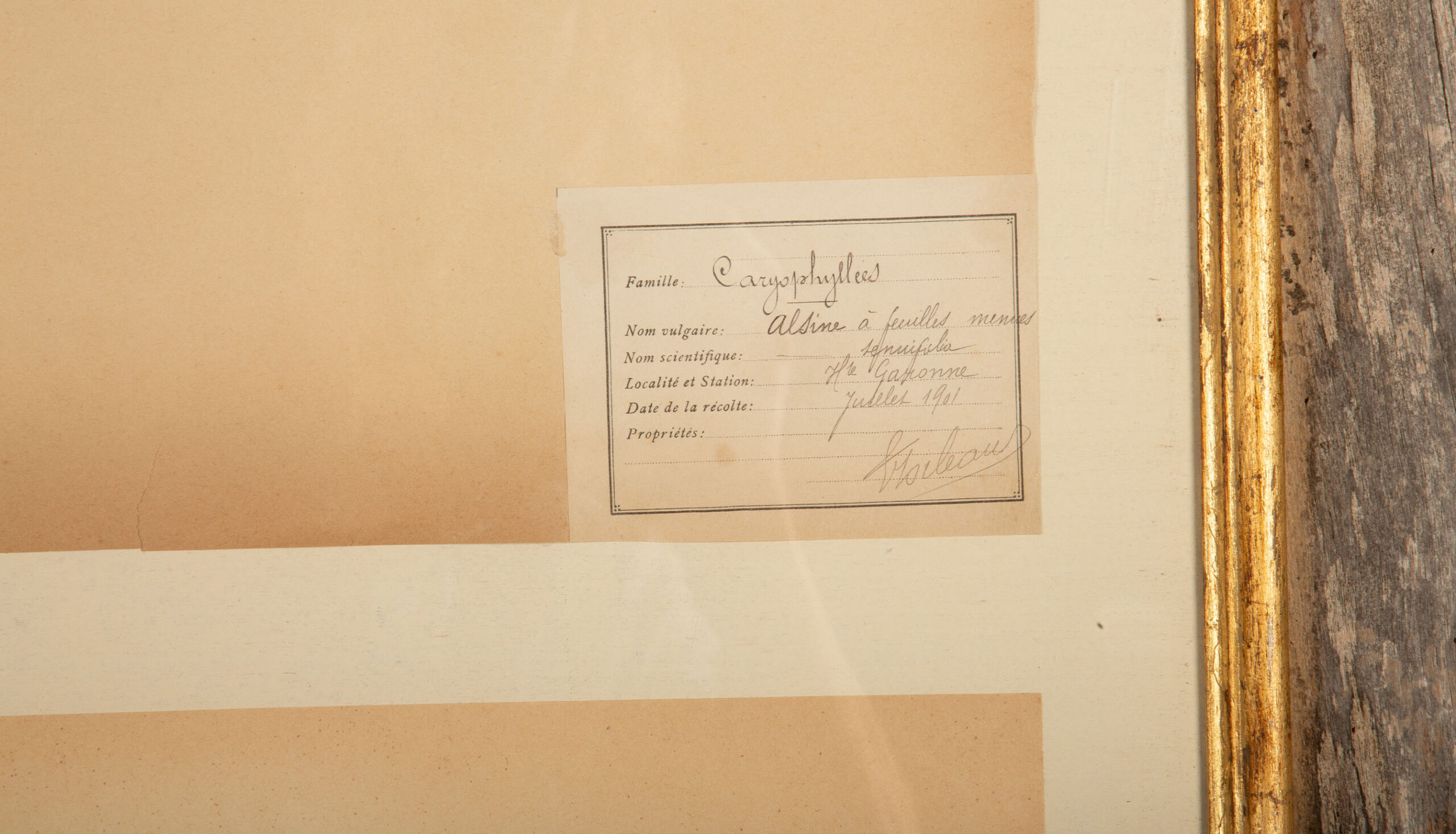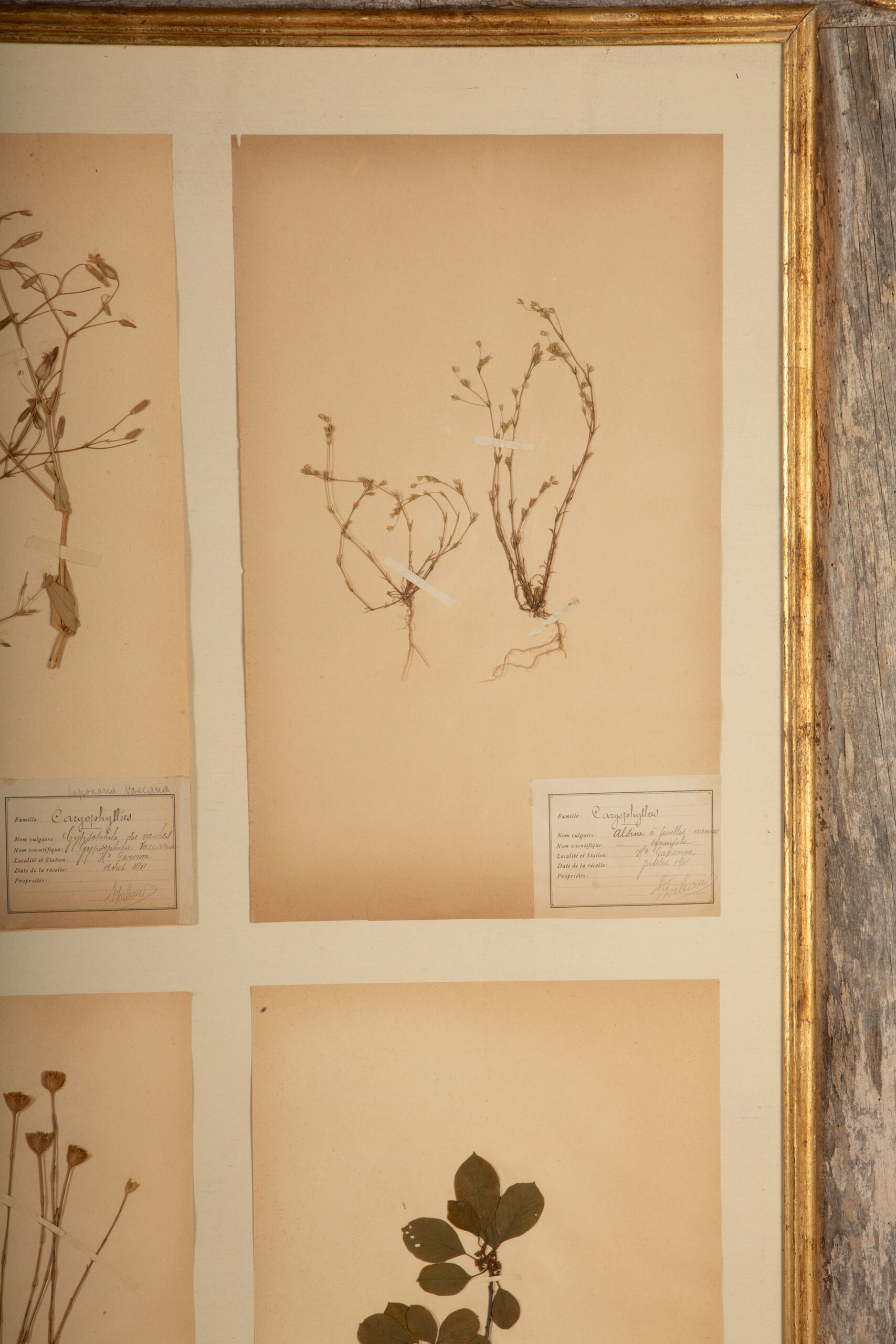 This beautifully preserved collection features four 19th century botanical herbier specimens meticulously mounted in a rustic barn wood frame. Each specimen, carefully labeled with scientific details, highlights a distinct variety of flora, providing both a visual and educational glimpse into botanical history. The herbier sheets are thoughtfully arranged, creating a balanced and harmonious display.